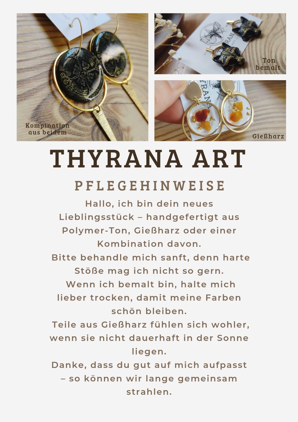 Meine Schmuckstücke bestehen zudem aus Polymer Ton sowie teilweise aus Resin (Epoxidharz). Auch diese Materialien können in seltenen Fällen Unverträglichkeiten oder Hautreaktionen auslösen.
