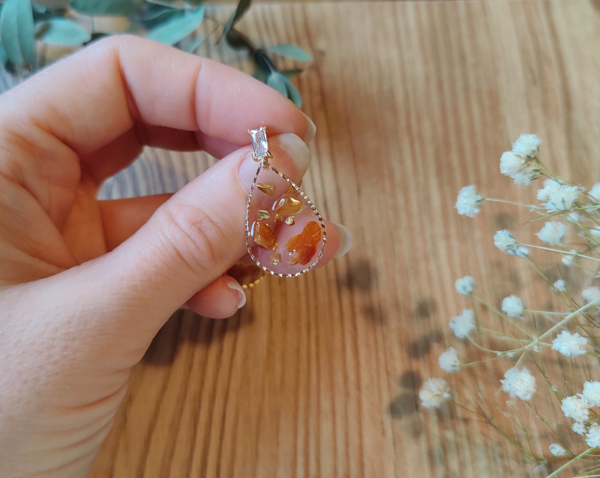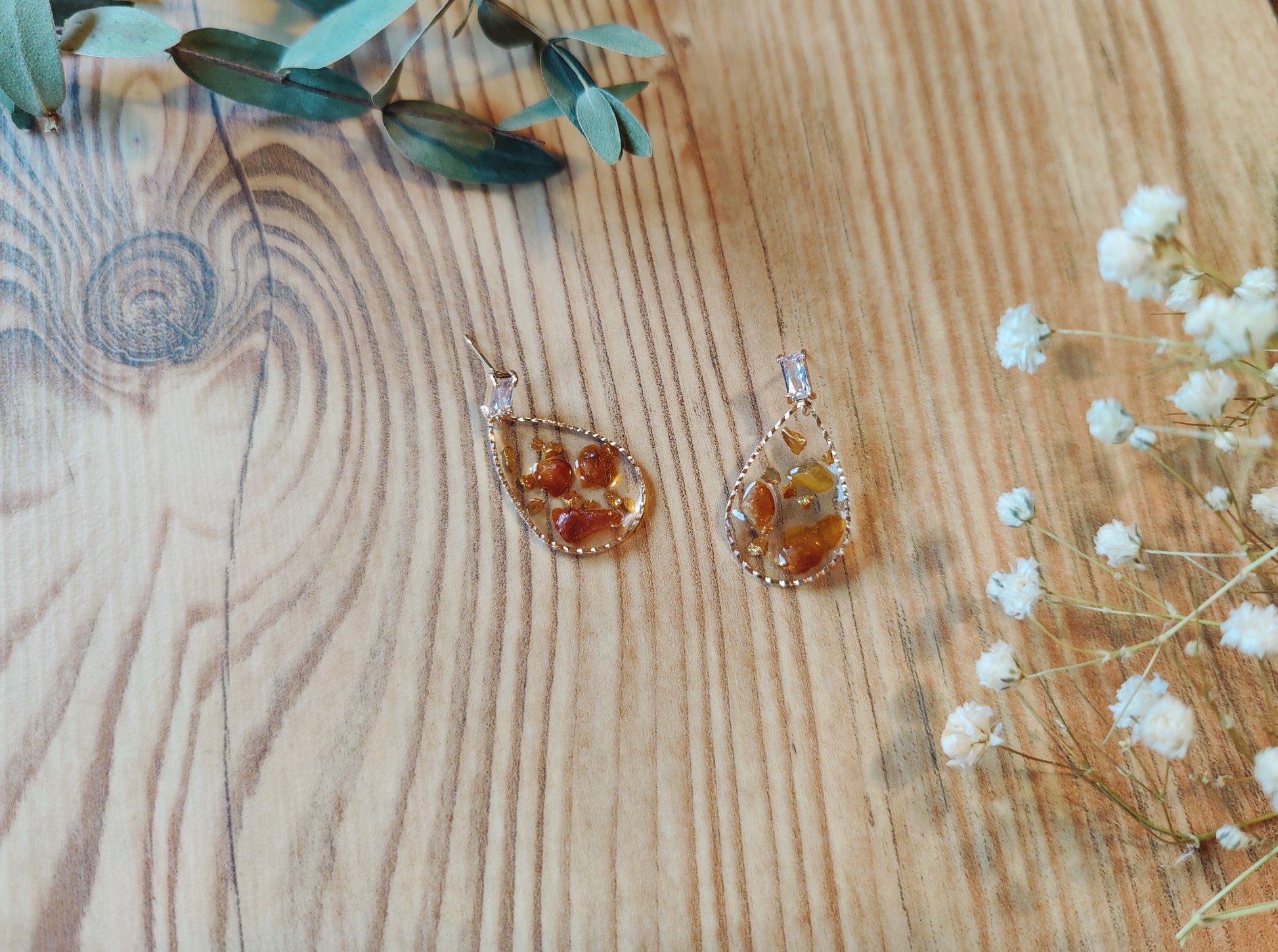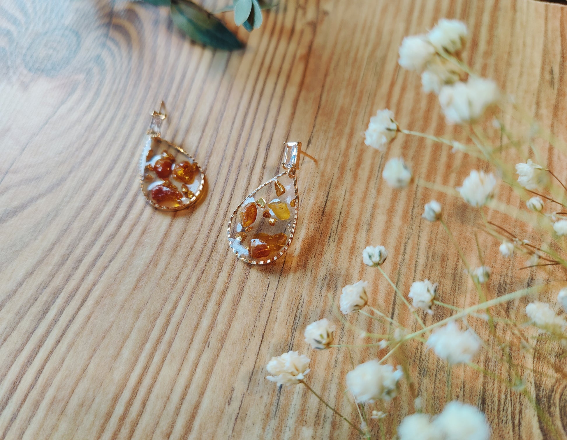 - Material: Echter Bernstein, hochwertiges Gießharz, 18K goldversiegelte Ohrstecker