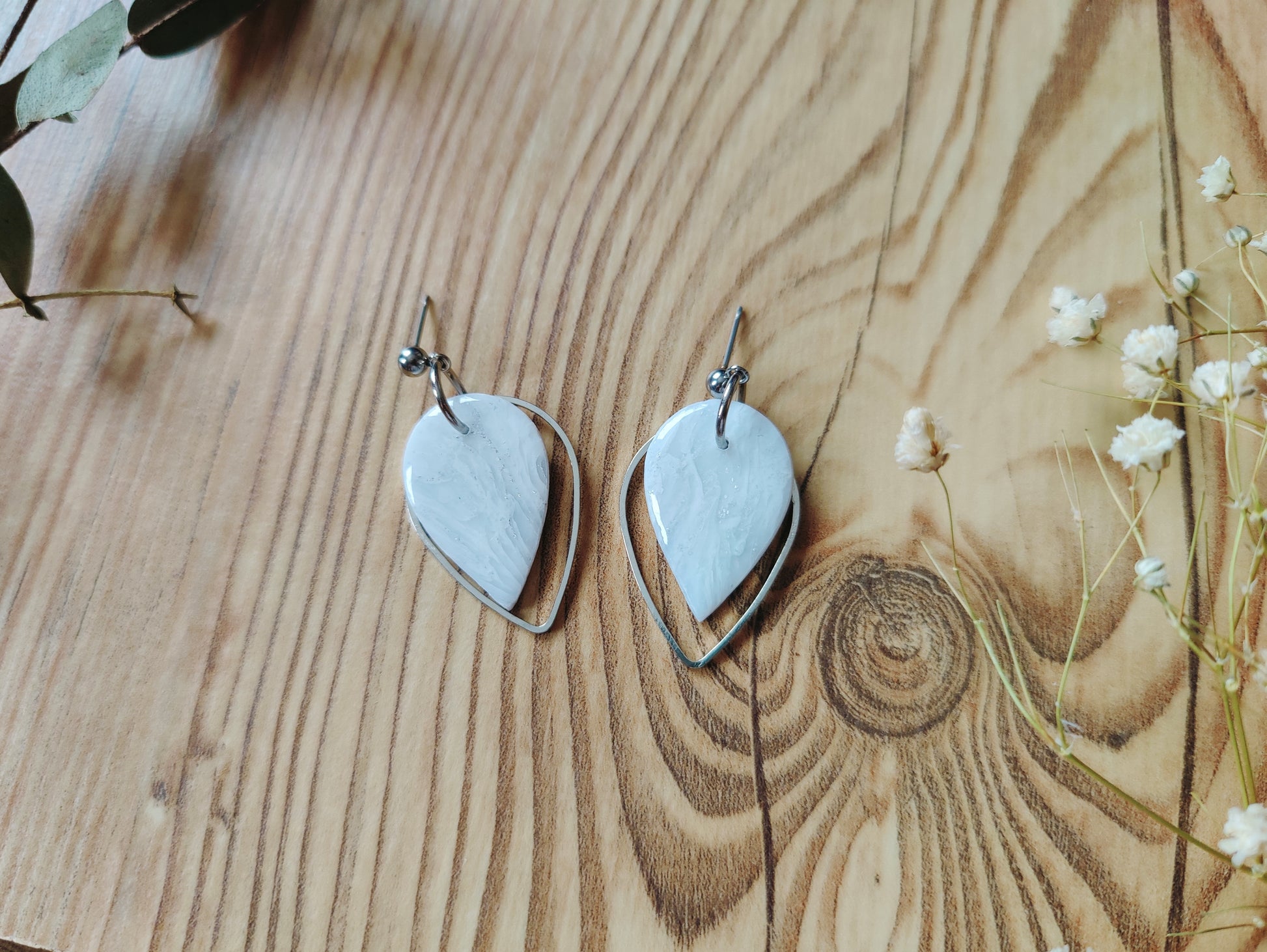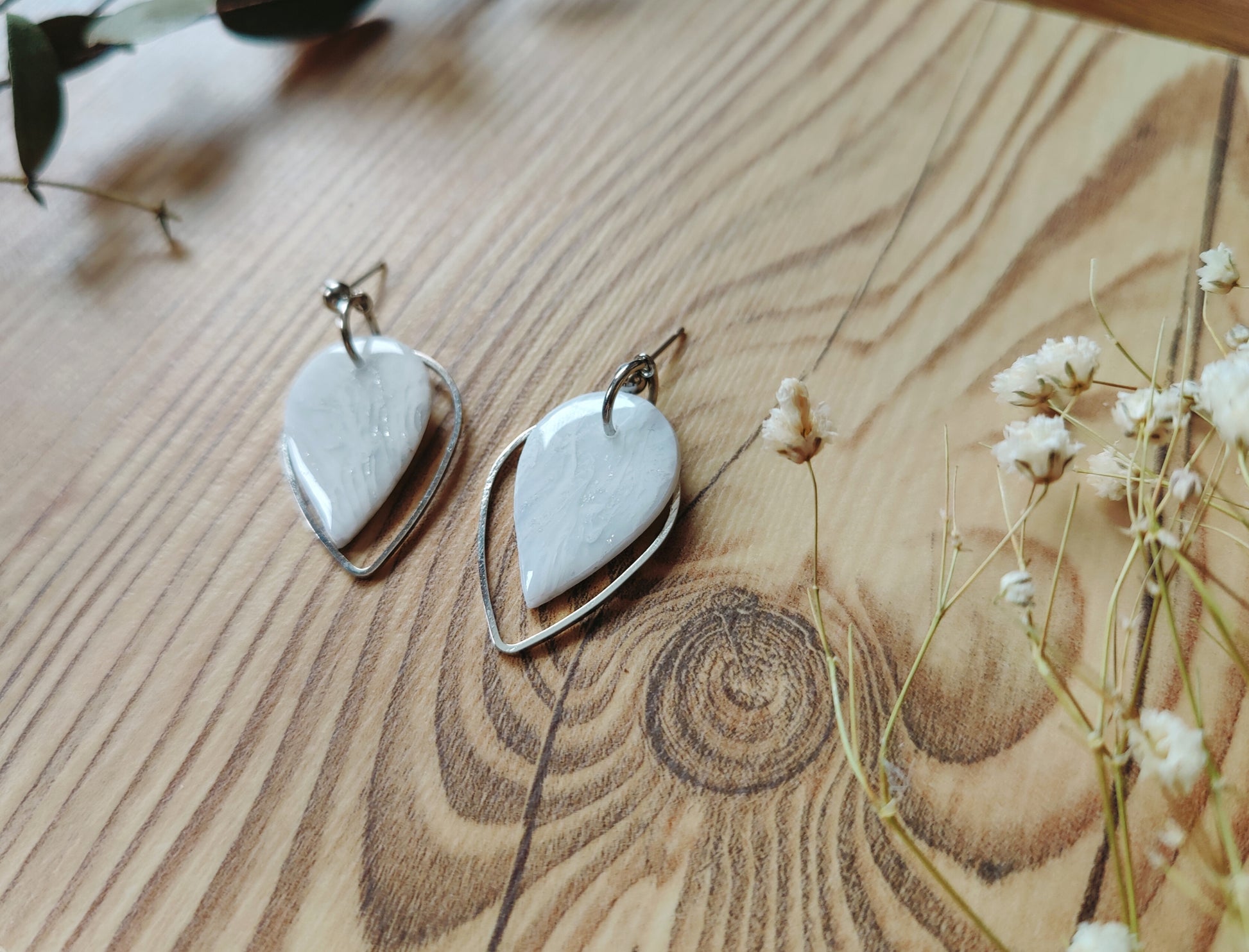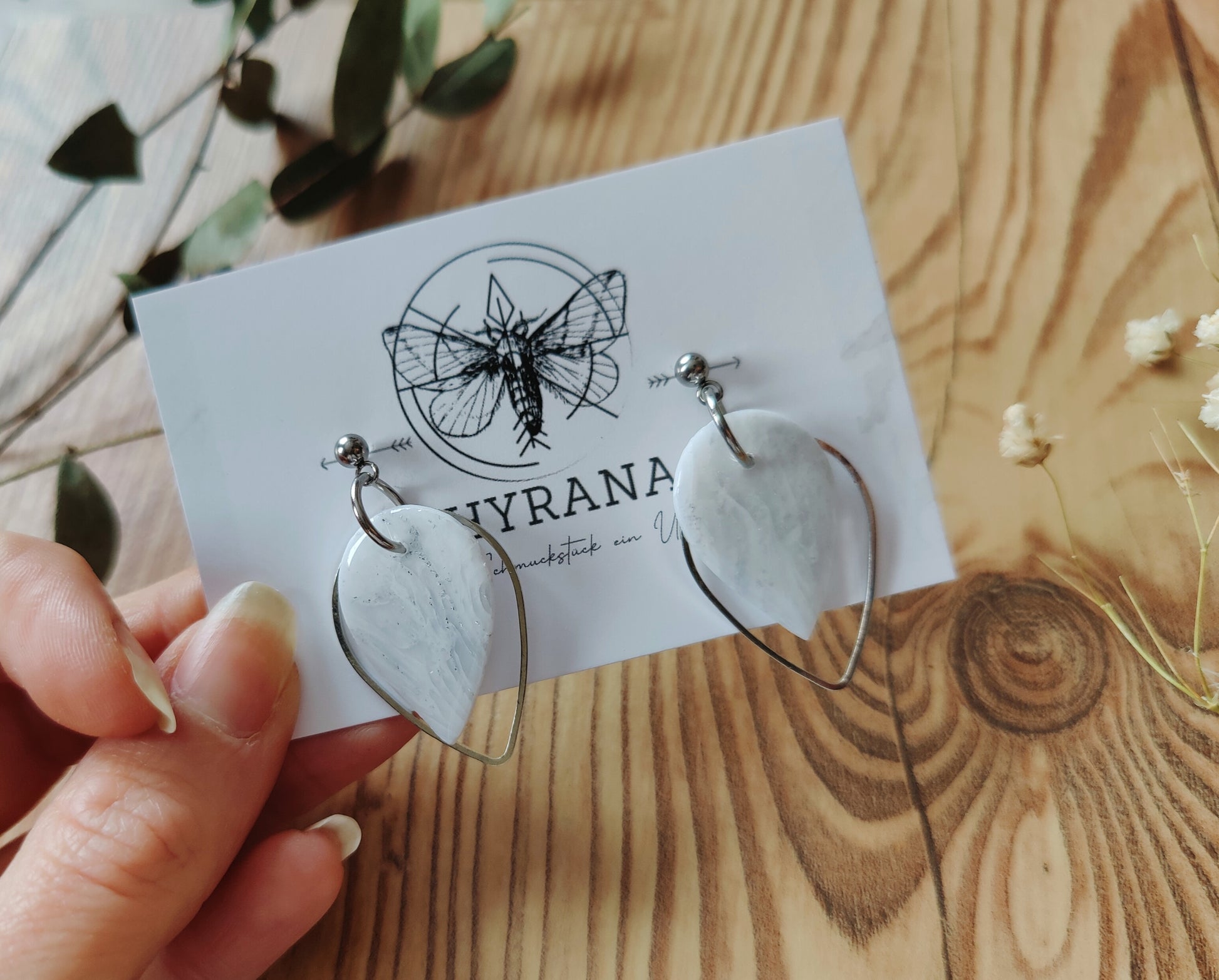 Diese eleganten Ohrstecker vereinen die Schönheit von Edelsteinen mit der Leichtigkeit von handgefertigtem Polymer-Ton. Ihr stilvolles Design in strahlendem Weiß erinnert an Edelsteine und wird durch silberne Akzente perfekt ergänzt.