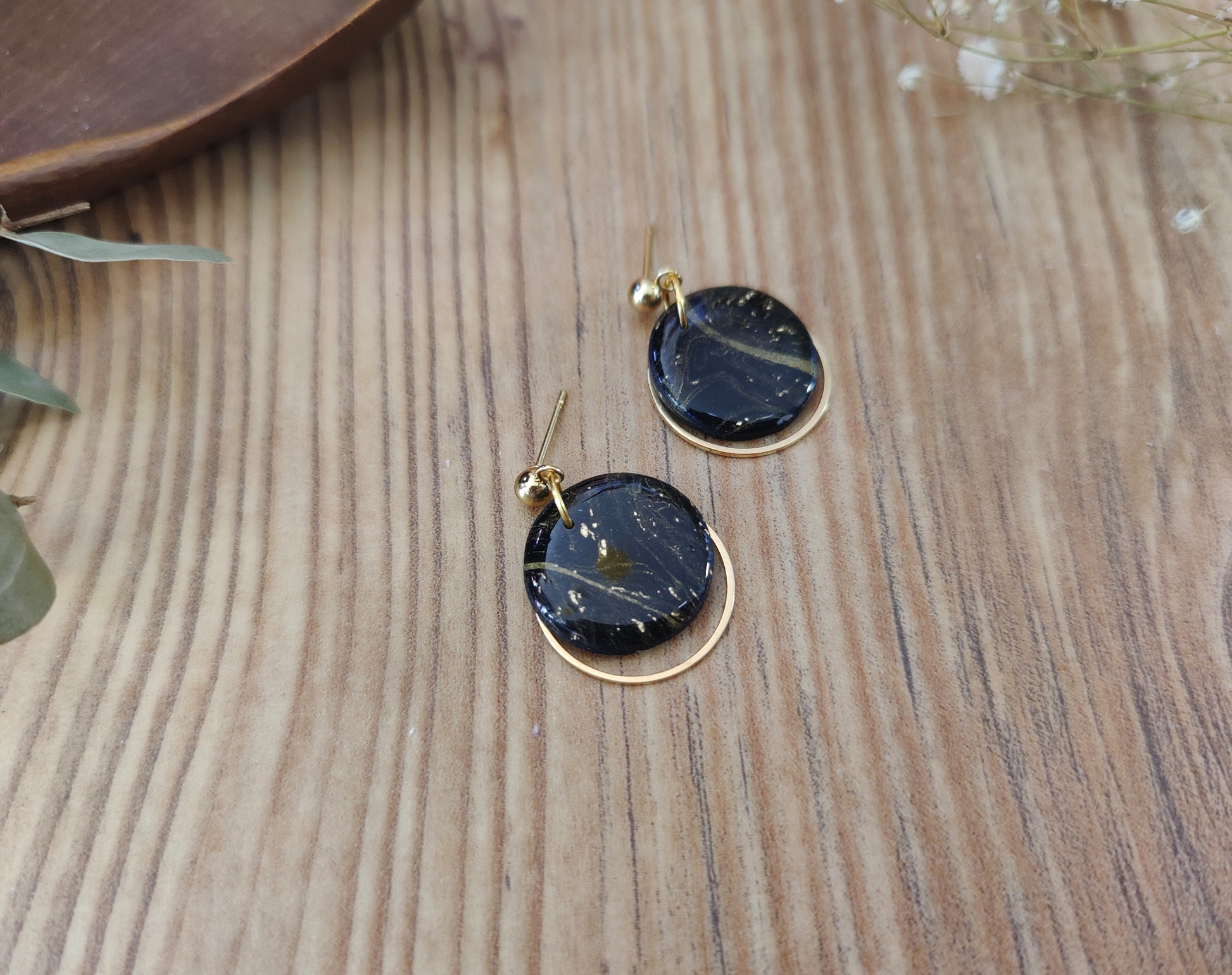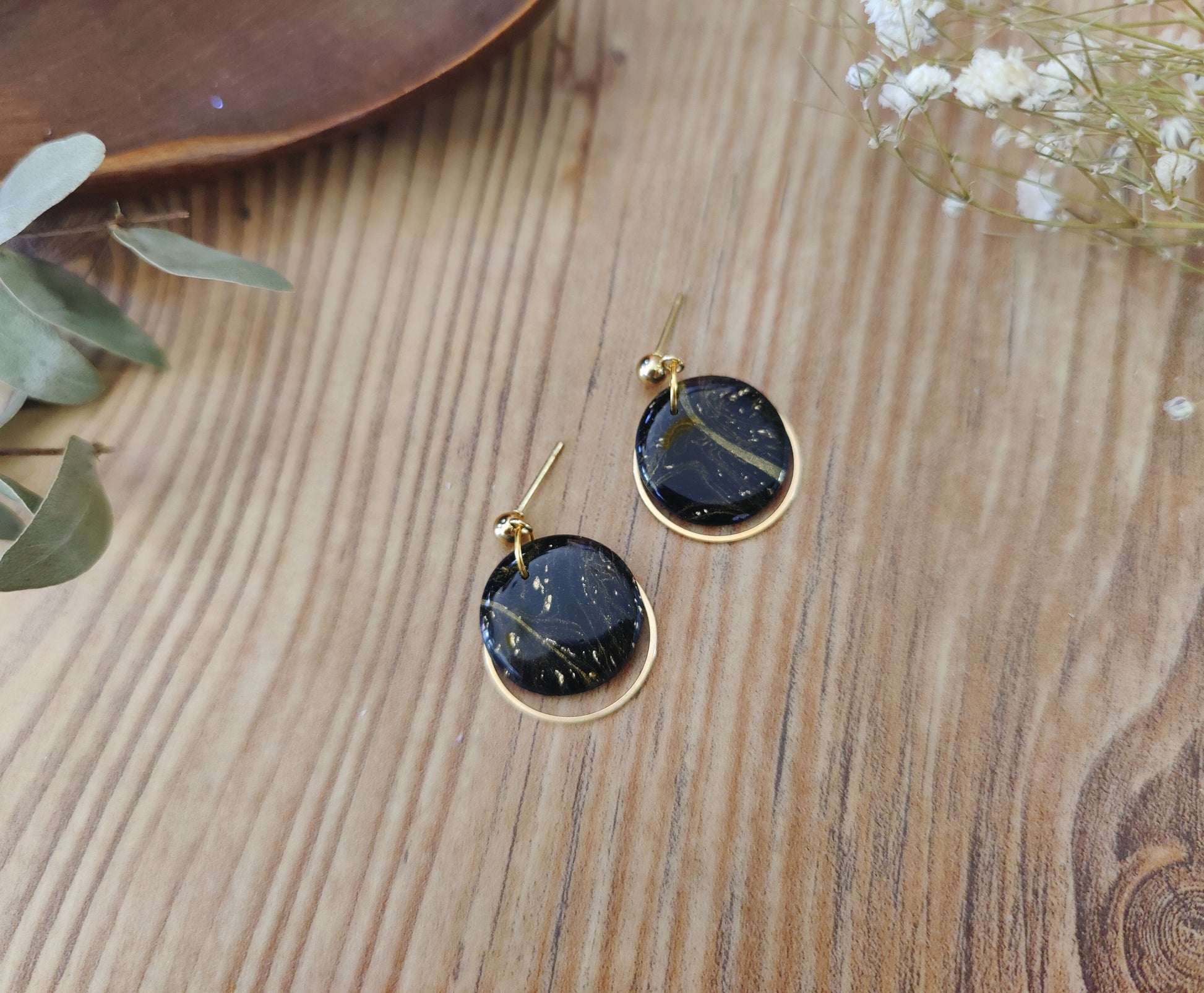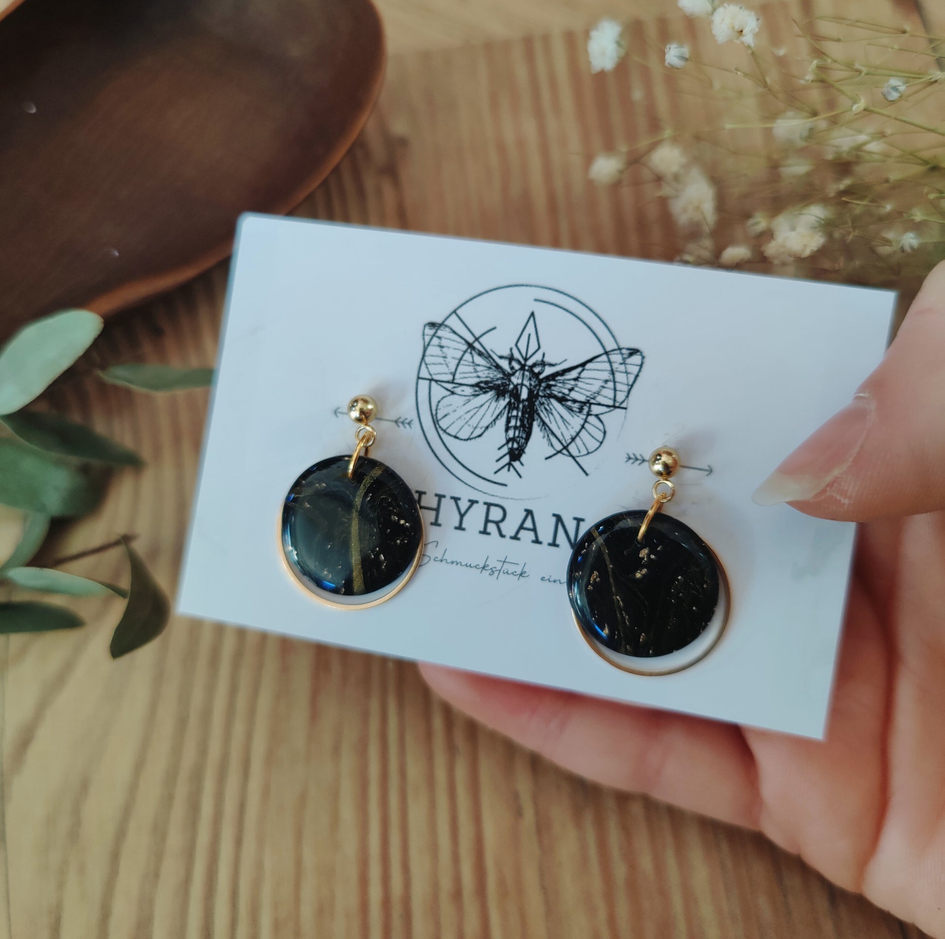 Diese eleganten Ohrstecker aus hochwertigem Polymer-Ton sind ein stilvolles Accessoire für jeden Anlass. Die Kombination aus tiefem Schwarz und edlen goldenen Akzenten verleiht ihnen eine moderne und dennoch zeitlose Optik.