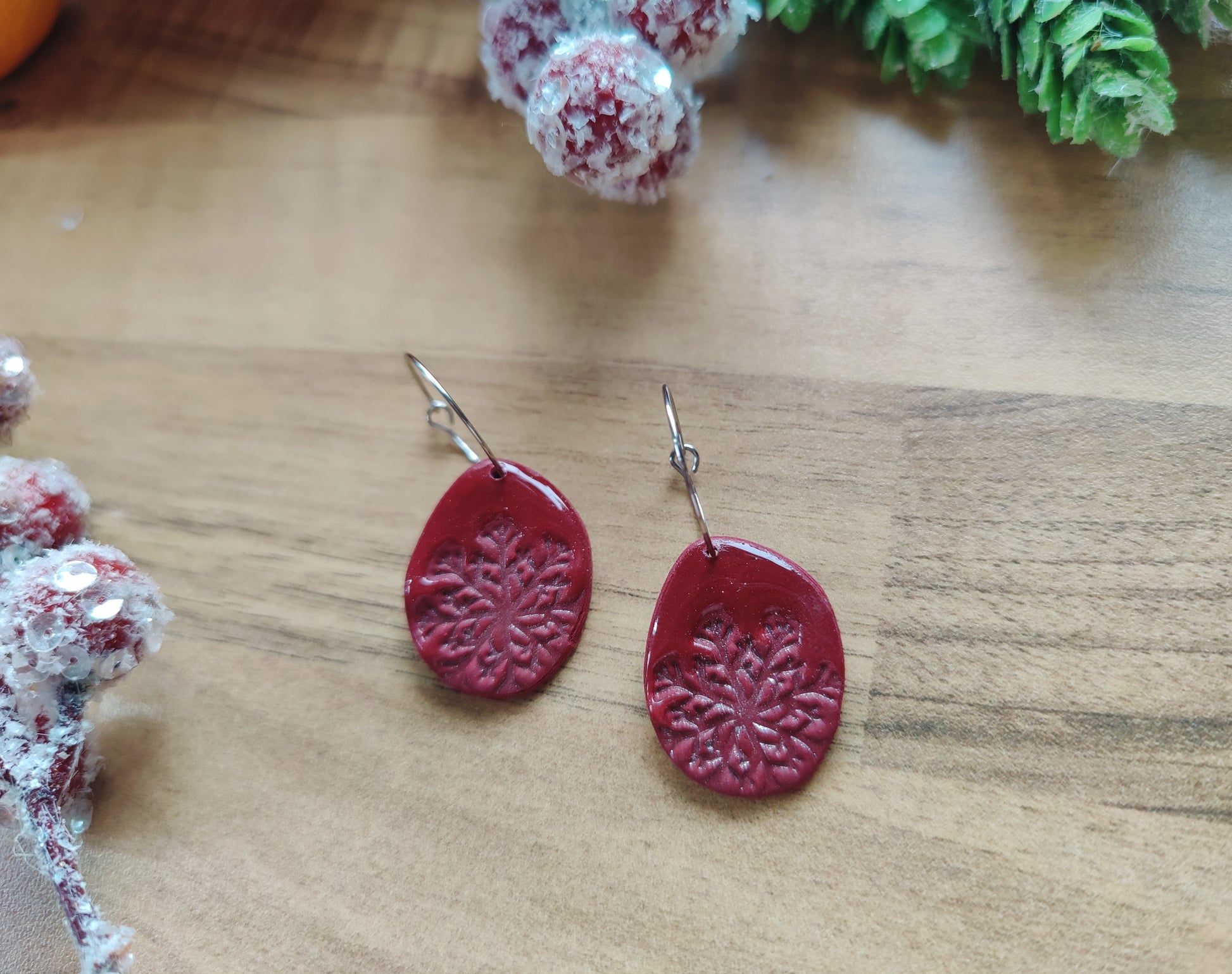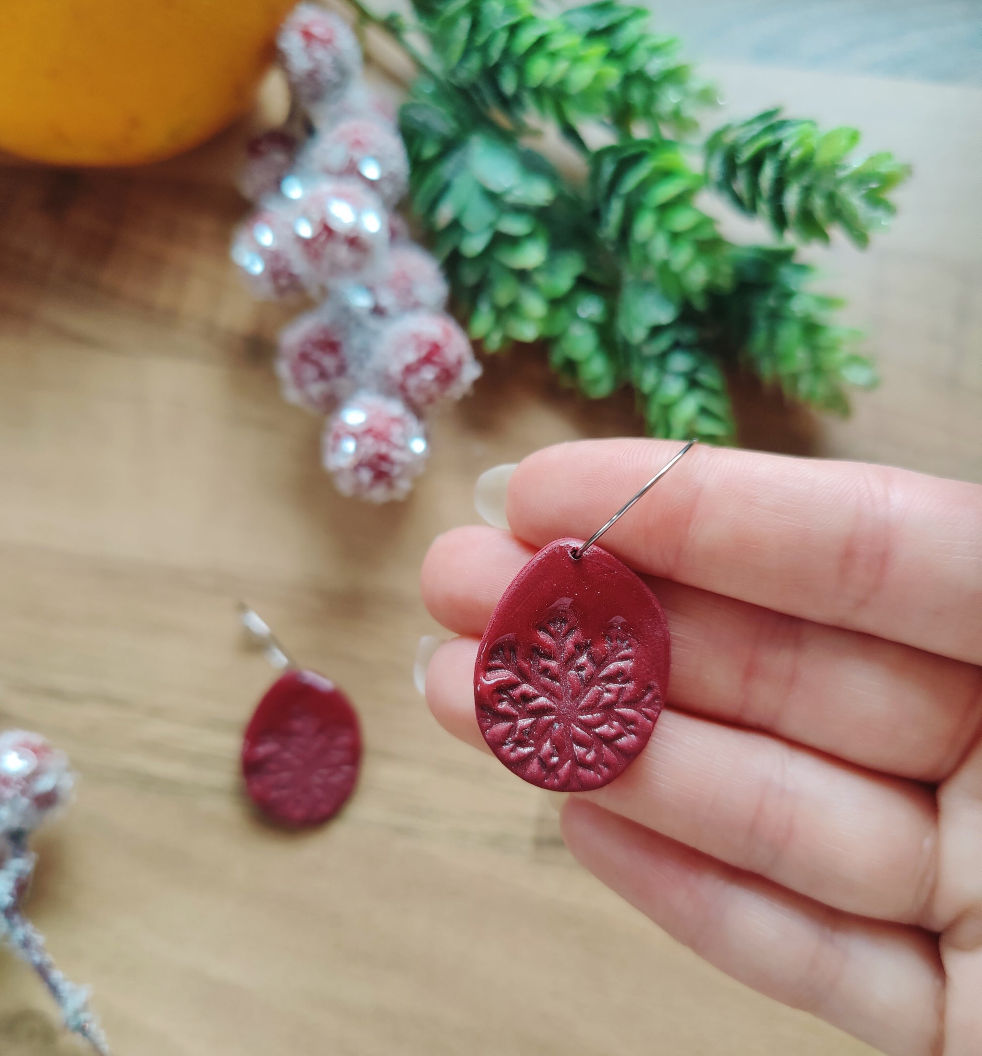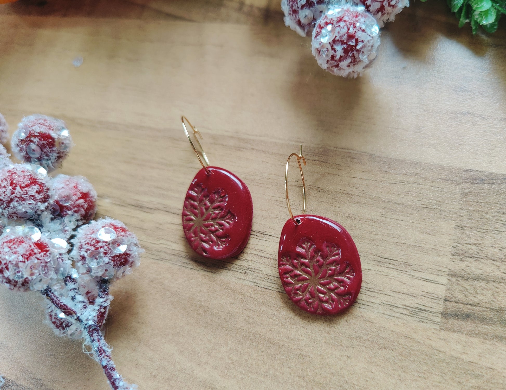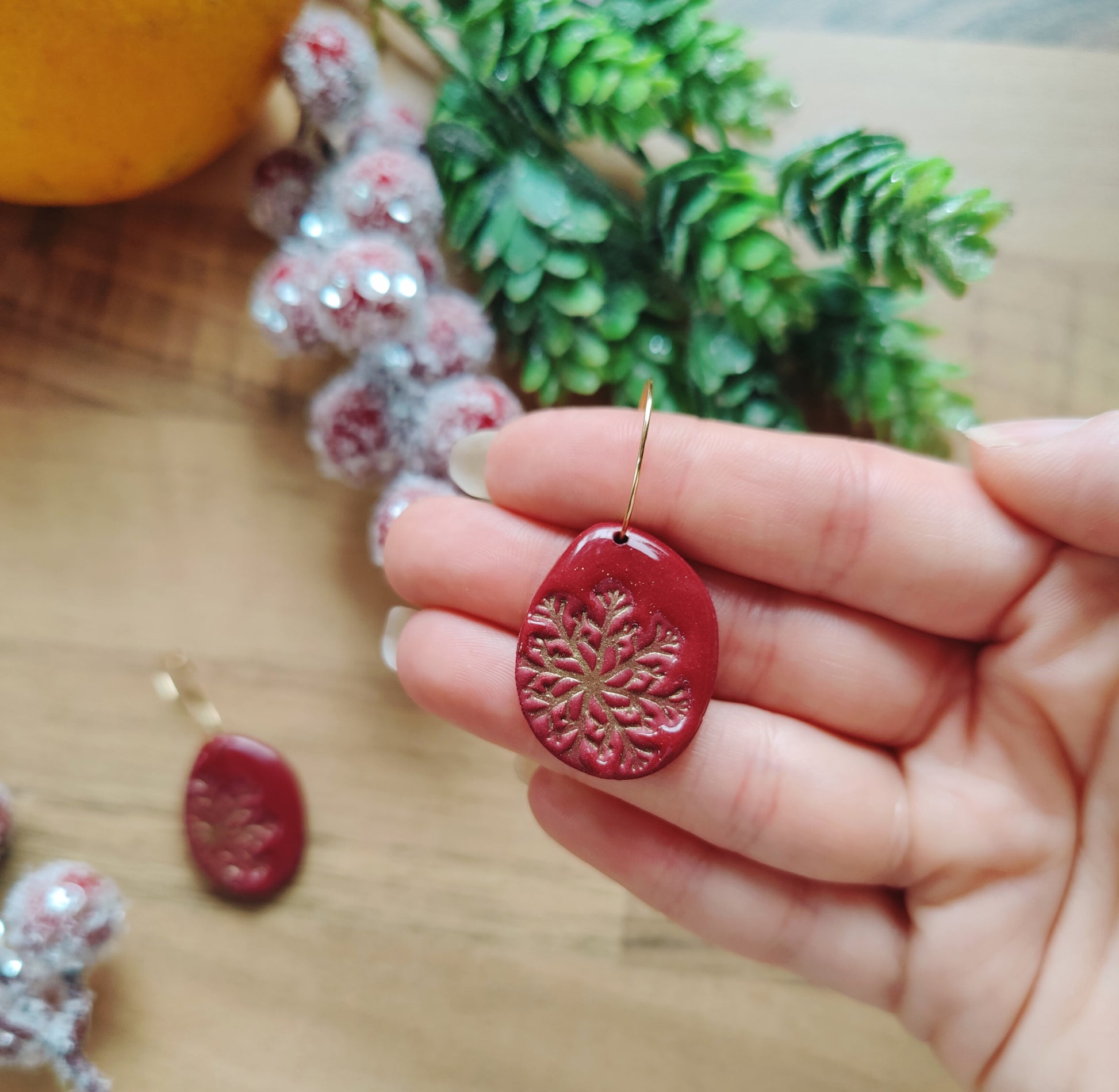 Diese handgefertigten Ohrringe verbinden die Wärme kräftigen Rottons mit der Eleganz einer schimmernden Schneeflocke. Gefertigt aus hochwertigem Polymer Clay, strahlen diese Ohrringe pure Festlichkeit aus. Die Schneeflocke, wahlweise in edlem Gold oder Silber, ist kunstvoll aufgebracht und verleiht dem Schmuckstück eine bezaubernde, winterliche Note.