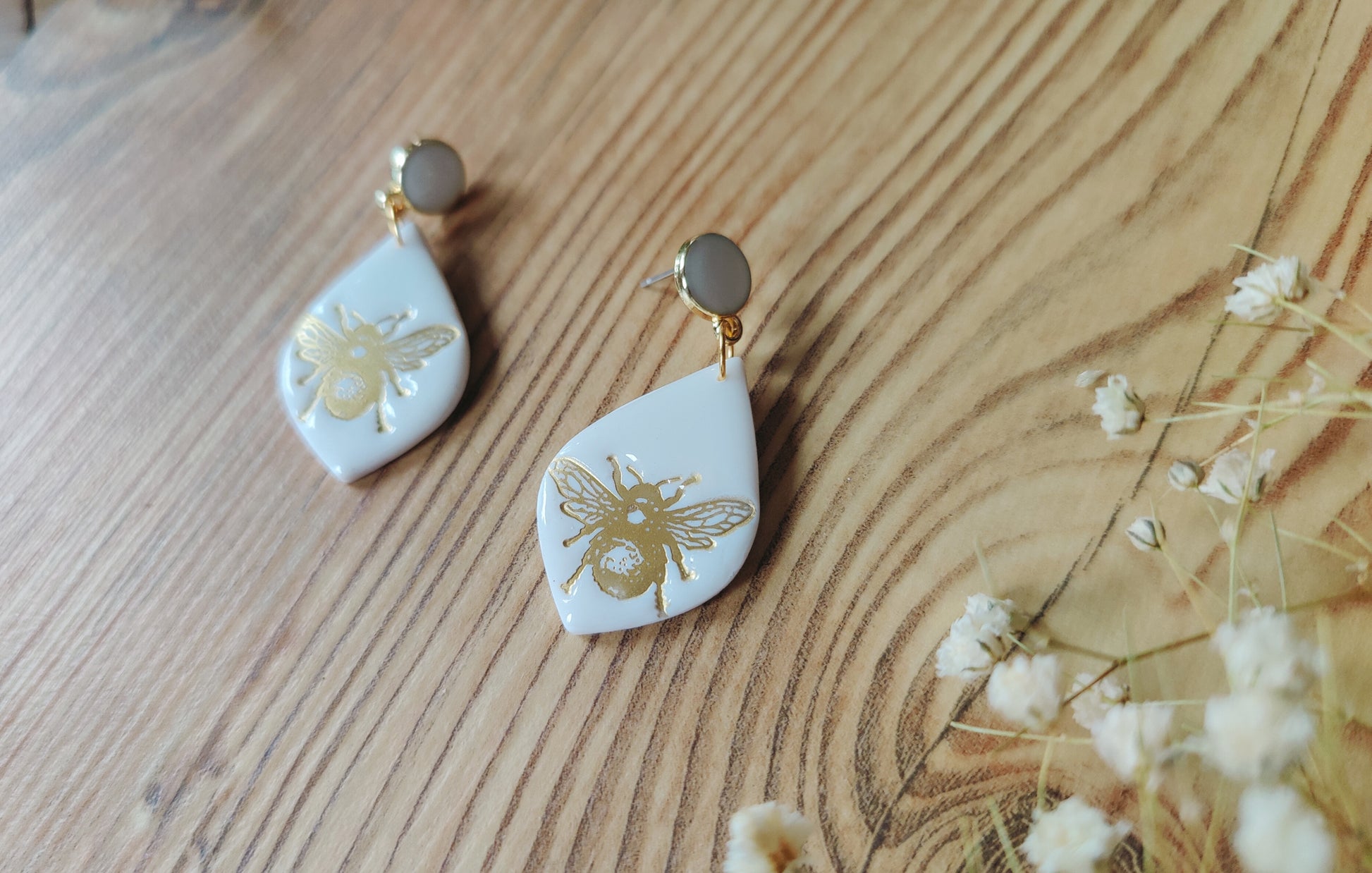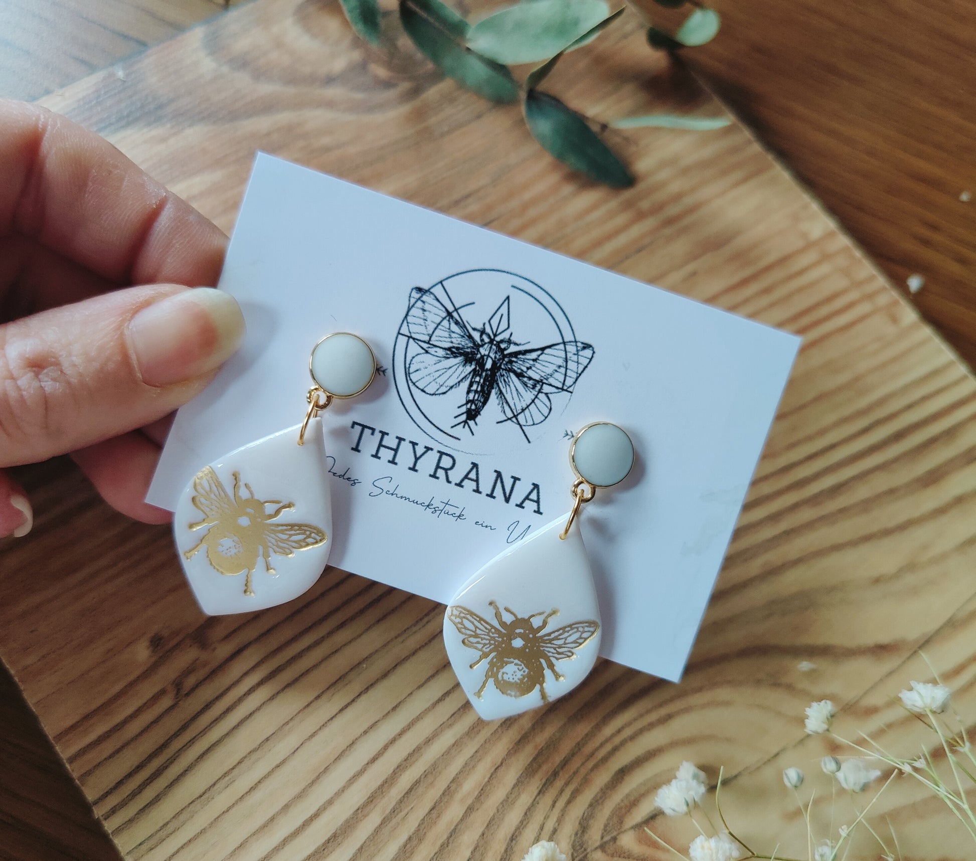 Verleihen Sie Ihrem Look einen Hauch von Natur und Eleganz mit diesen handgefertigten Ohrsteckern aus hochwertigem Polymer Ton. Die Ohrstecker sind mit einem filigranen Bienensymbol verziert, das sowohl für den Umweltschutz als auch für einen verspielten Akzent steht. Das Design kombiniert gekonnt Kunsthandwerk und Symbolik und schafft so ein einzigartiges Schmuckstück.