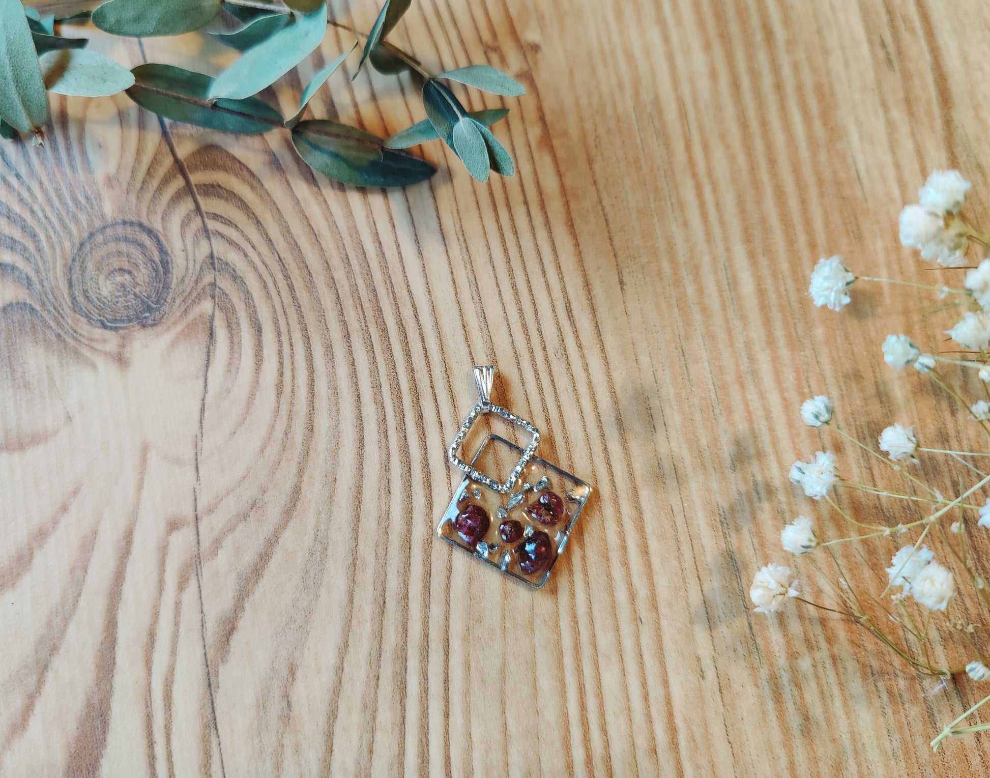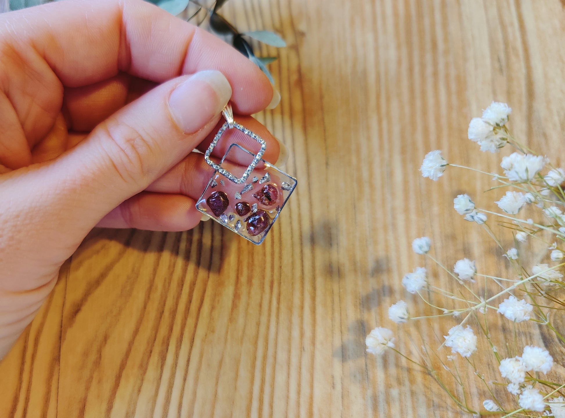 Dieser exquisite Kettenanhänger kombiniert die leidenschaftliche Ausstrahlung von echtem Rubin mit der modernen Eleganz von klarem Gießharz. In sorgfältiger Handarbeit gefertigt, wird jedes Schmuckstück zu einem einzigartigen Blickfang. Der tiefrote Rubin symbolisiert Liebe und Stärke, während das transparente Harz seine natürliche Schönheit hervorhebt und schützt. Die hochwertige Edelstahlöse sorgt für eine stilvolle und langlebige Ergänzung.