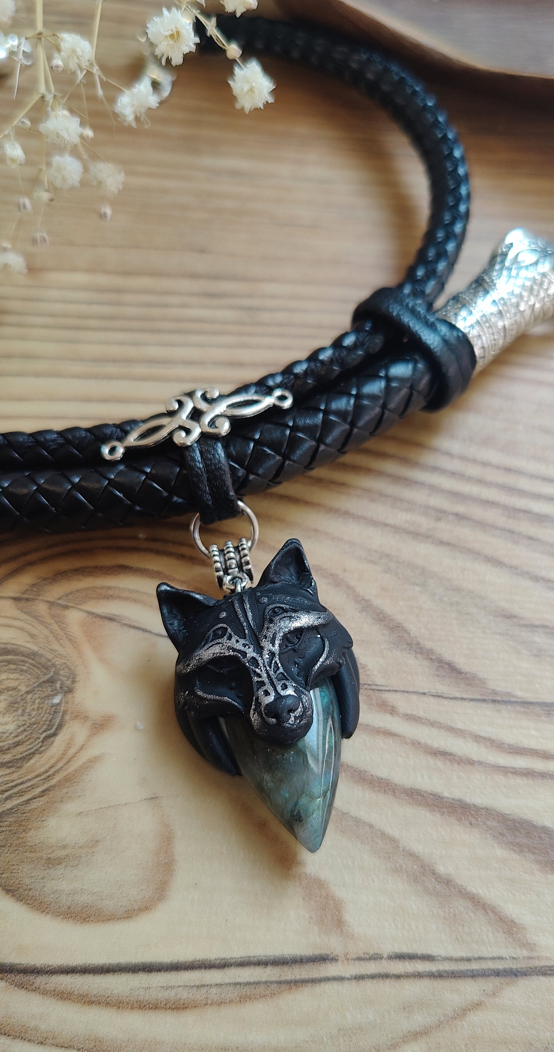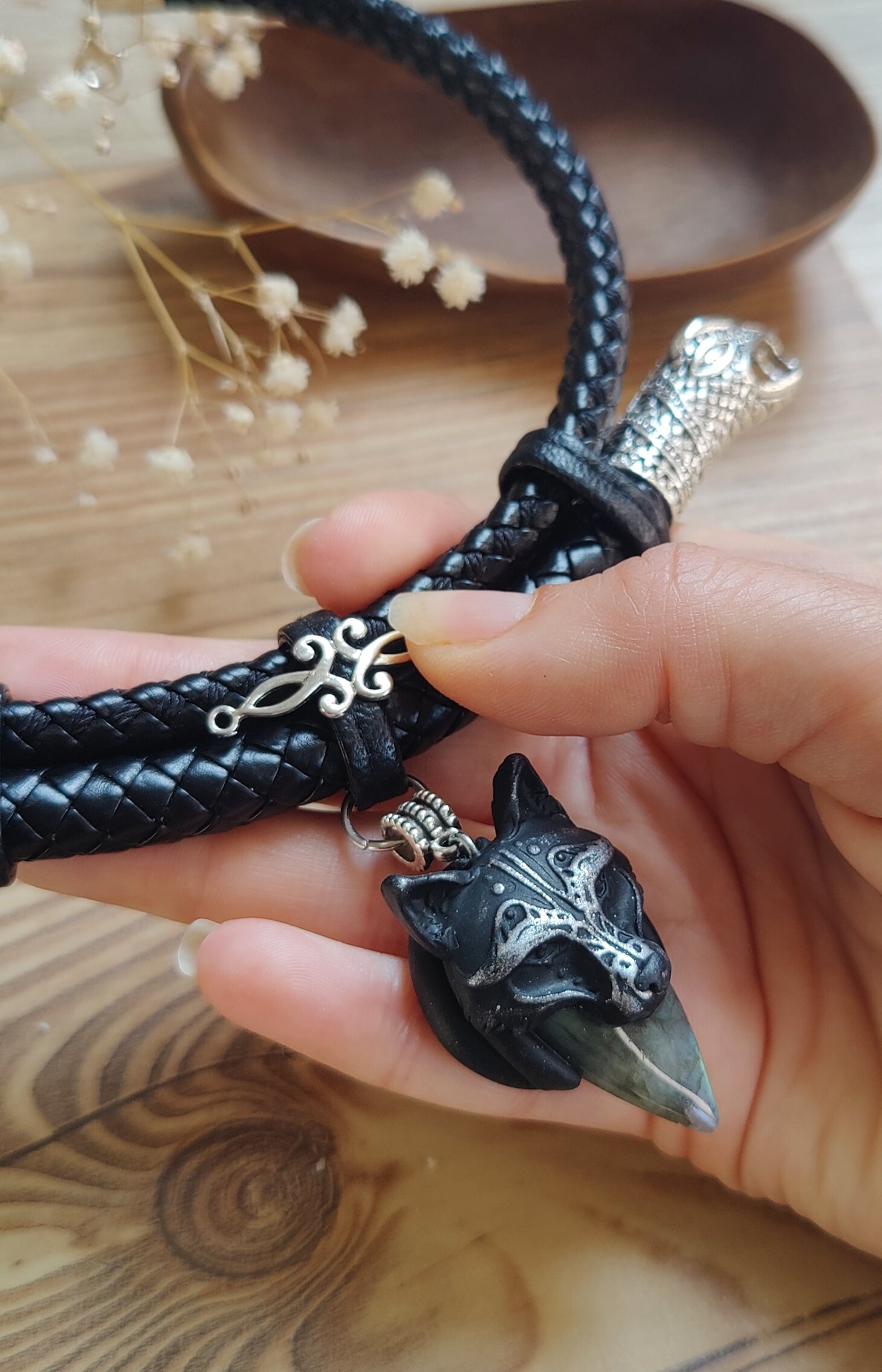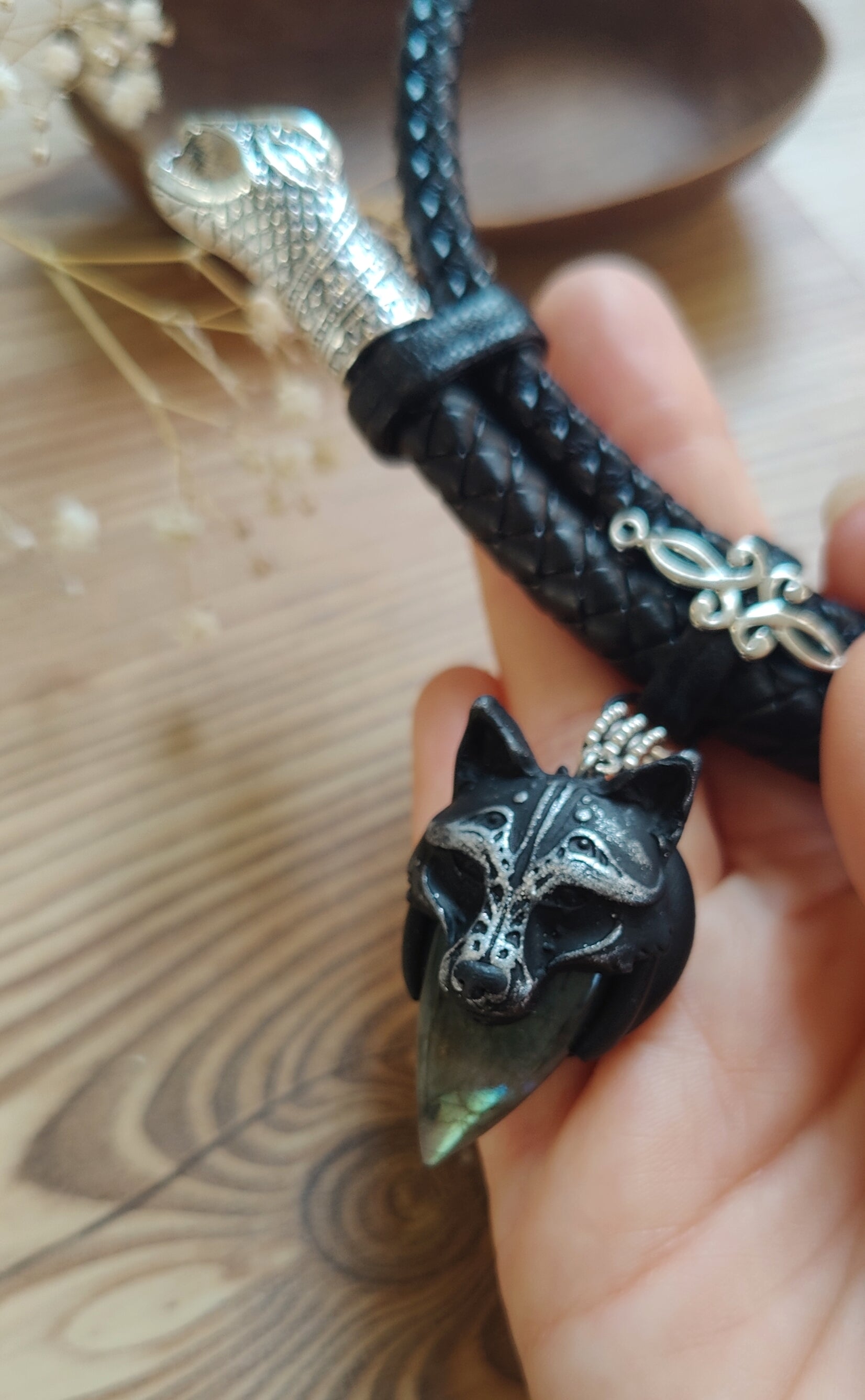 Der Blickfang ist der handmodellierte Wolfskopf – gefertigt aus Polymer-Ton, sorgfältig bemalt und in liebevoller Handarbeit vollendet. In seiner Mitte ruht ein echter Labradorit-Stein, dessen changierende Farben im Licht geheimnisvoll schimmern.