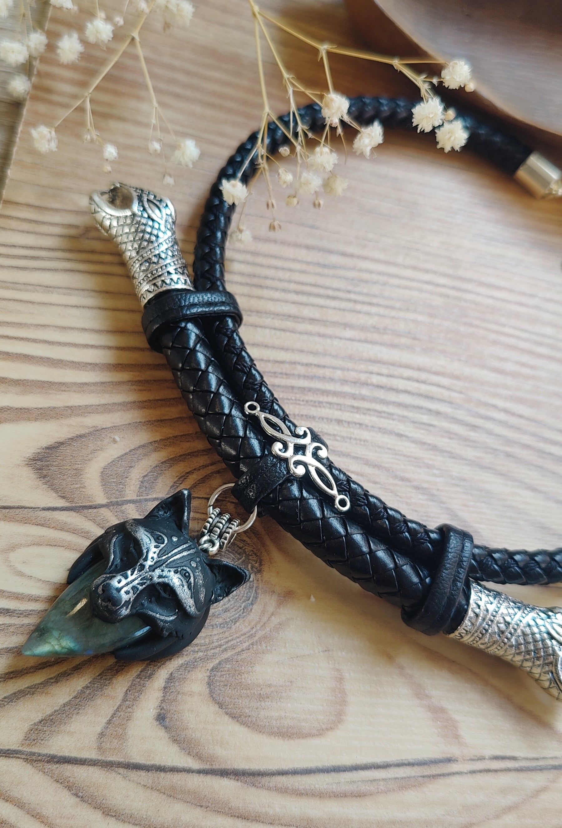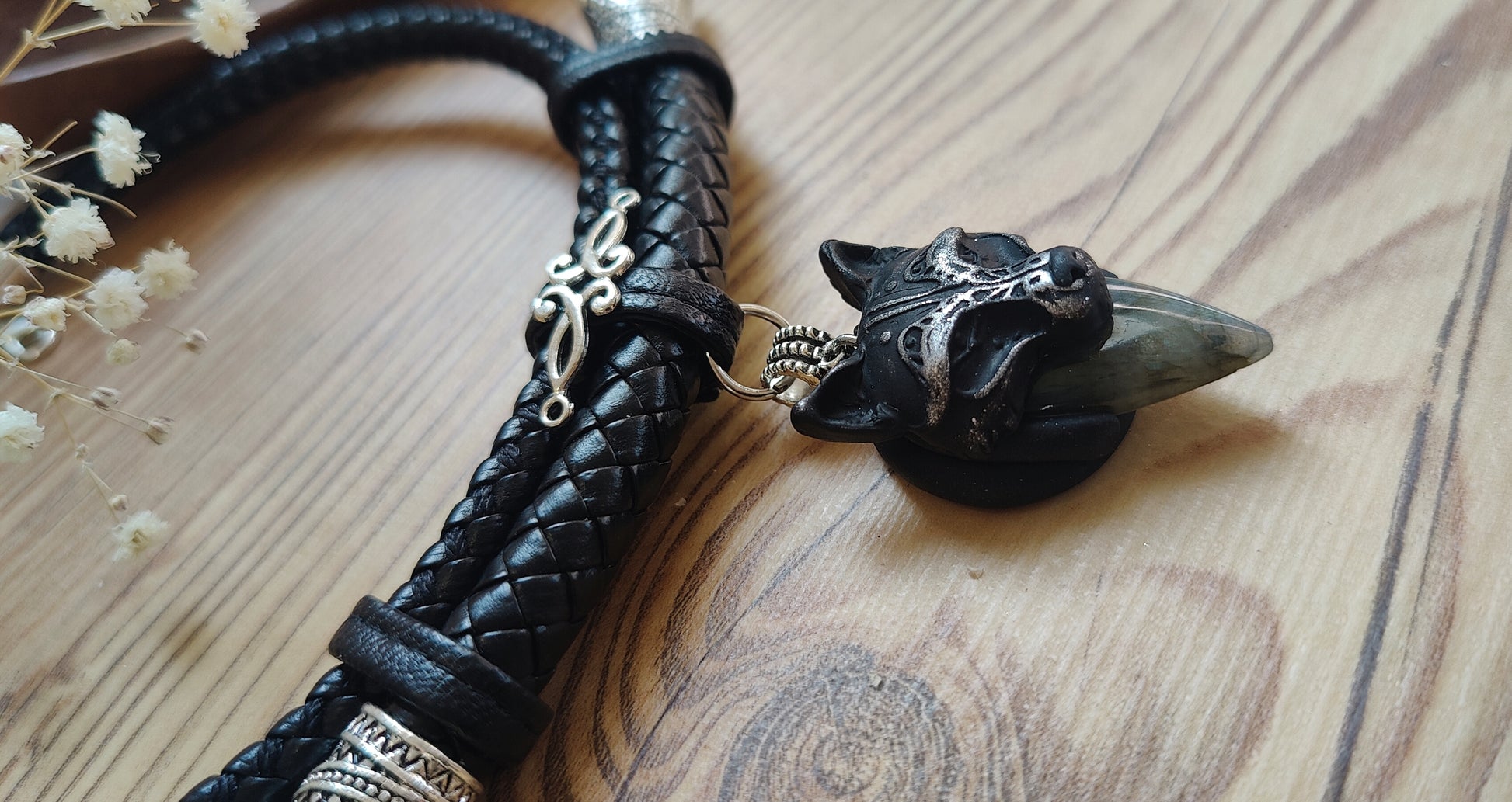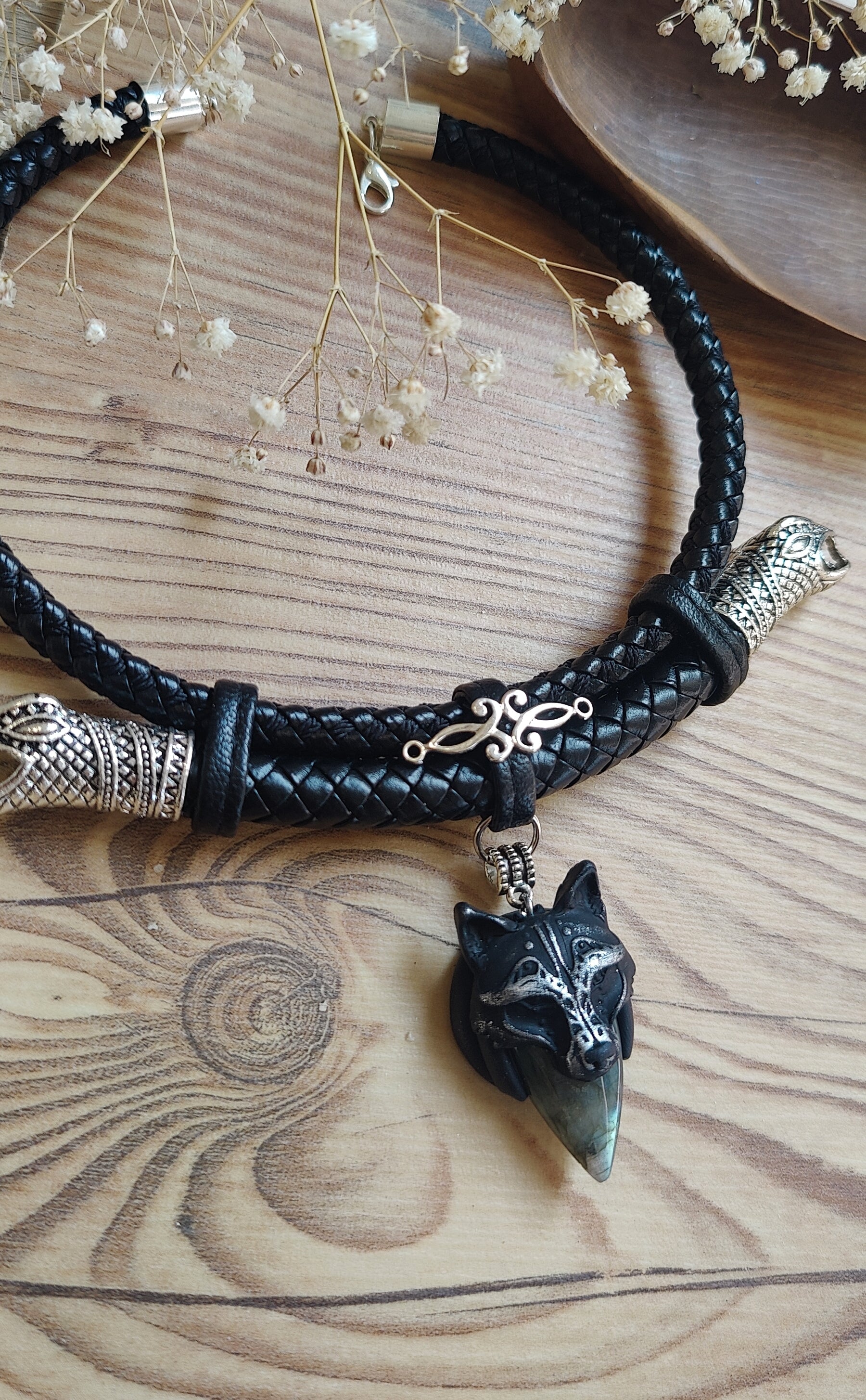 Der Blickfang ist der handmodellierte Wolfskopf – gefertigt aus Polymer-Ton, sorgfältig bemalt und in liebevoller Handarbeit vollendet. In seiner Mitte ruht ein echter Labradorit-Stein, dessen changierende Farben im Licht geheimnisvoll schimmern.