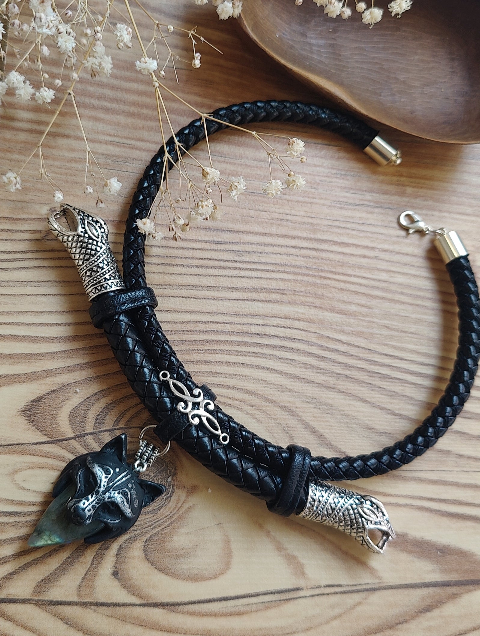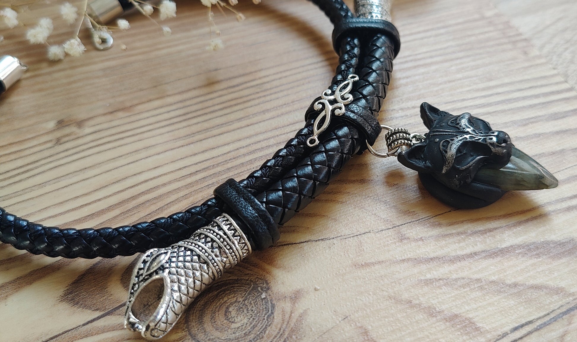 Diese kraftvolle Kette verbindet robuste Materialien mit kunstvoller Handarbeit und einer Prise nordischer Mythologie. Zwei dicke, geflochtene Kunstlederkordeln bilden das Fundament, kunstvoll eingefasst von massiven Eisenelementen. Die detailreich gestalteten Schlangenköpfe aus Eisen verleihen dem Schmuckstück eine mystische Aura und erinnern an den Stil alter Wikingerschmiedekunst.