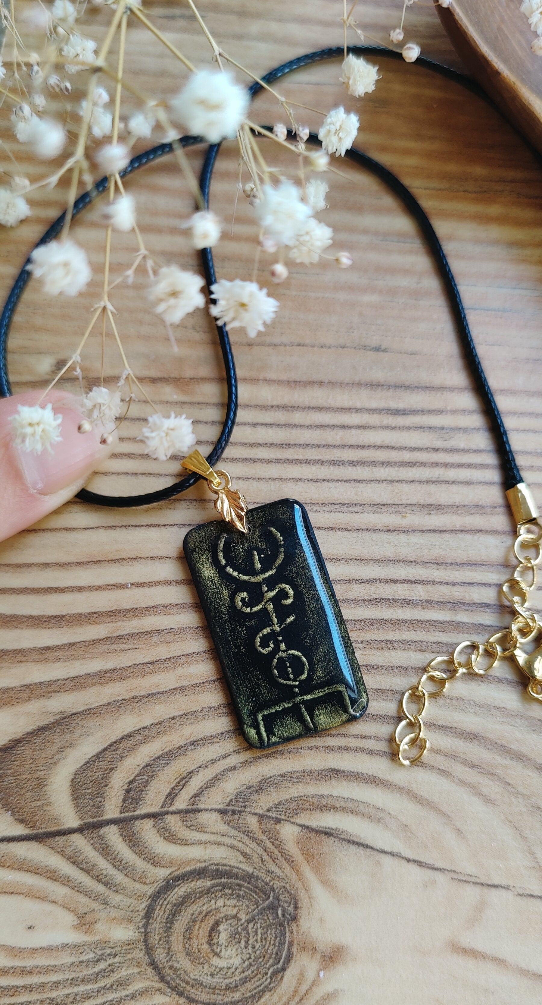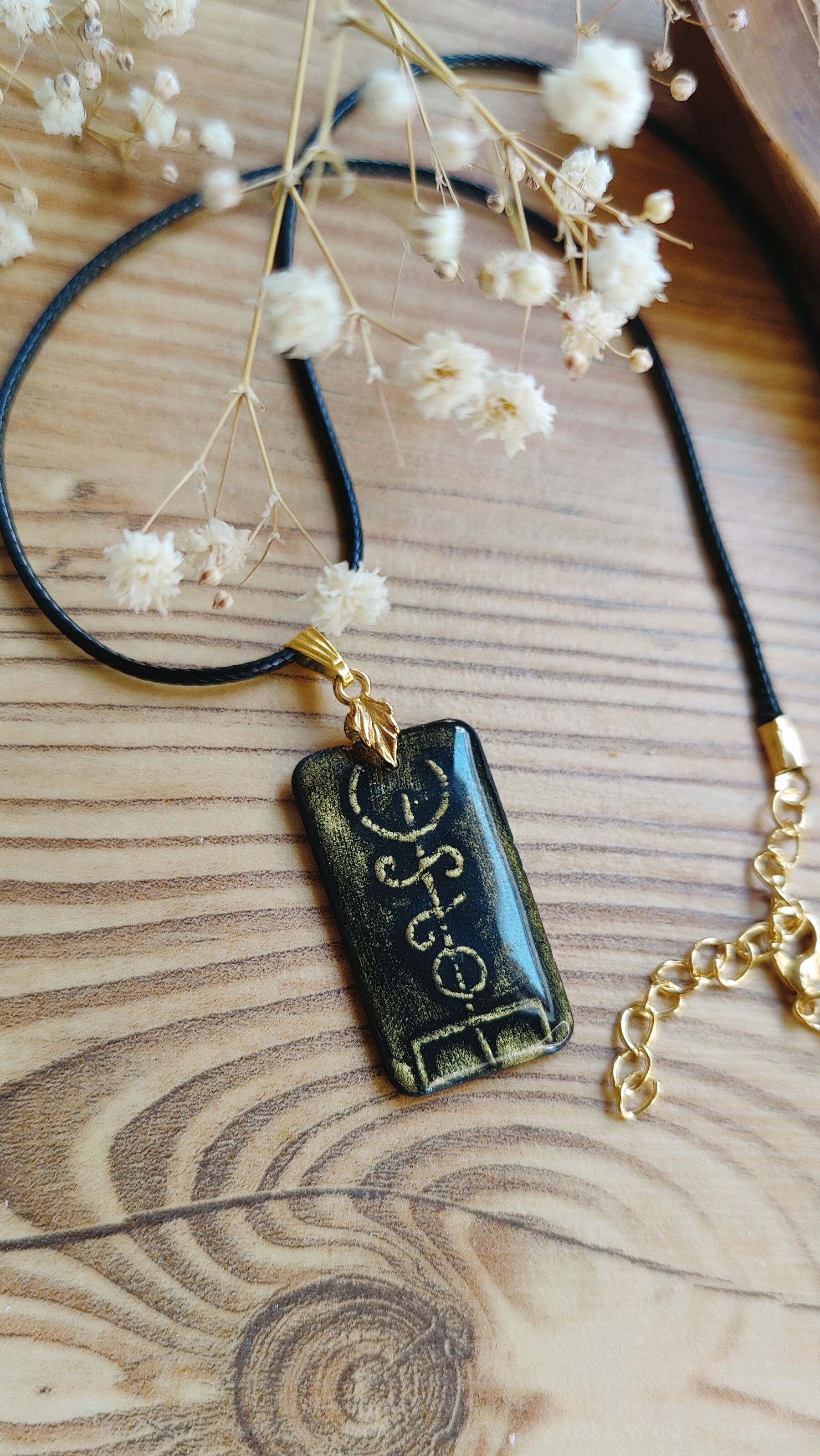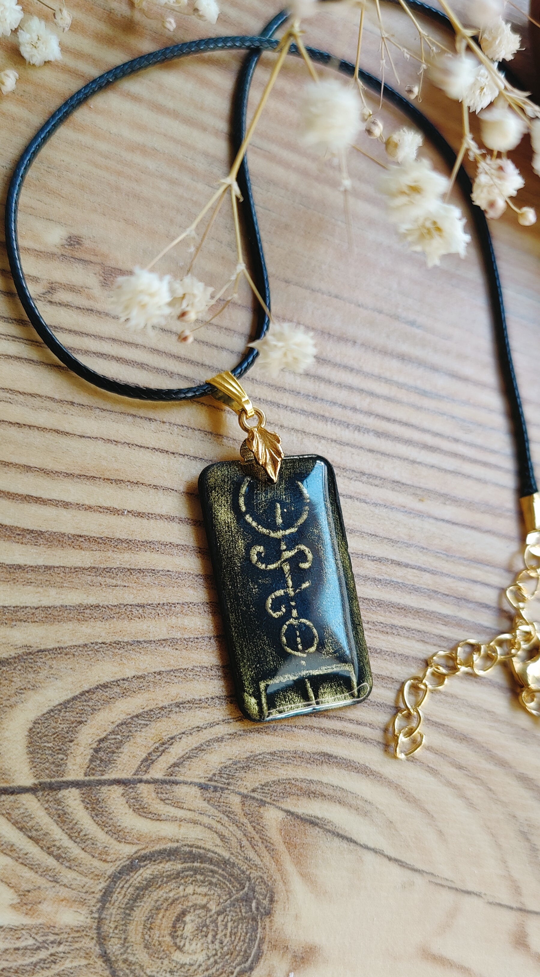 Getragen wird der Anhänger an einem weichen, schwarzen Kunstlederband, das angenehm auf der Haut liegt, vegan ist und dem Schmuckstück eine moderne, leichte Note verleiht.