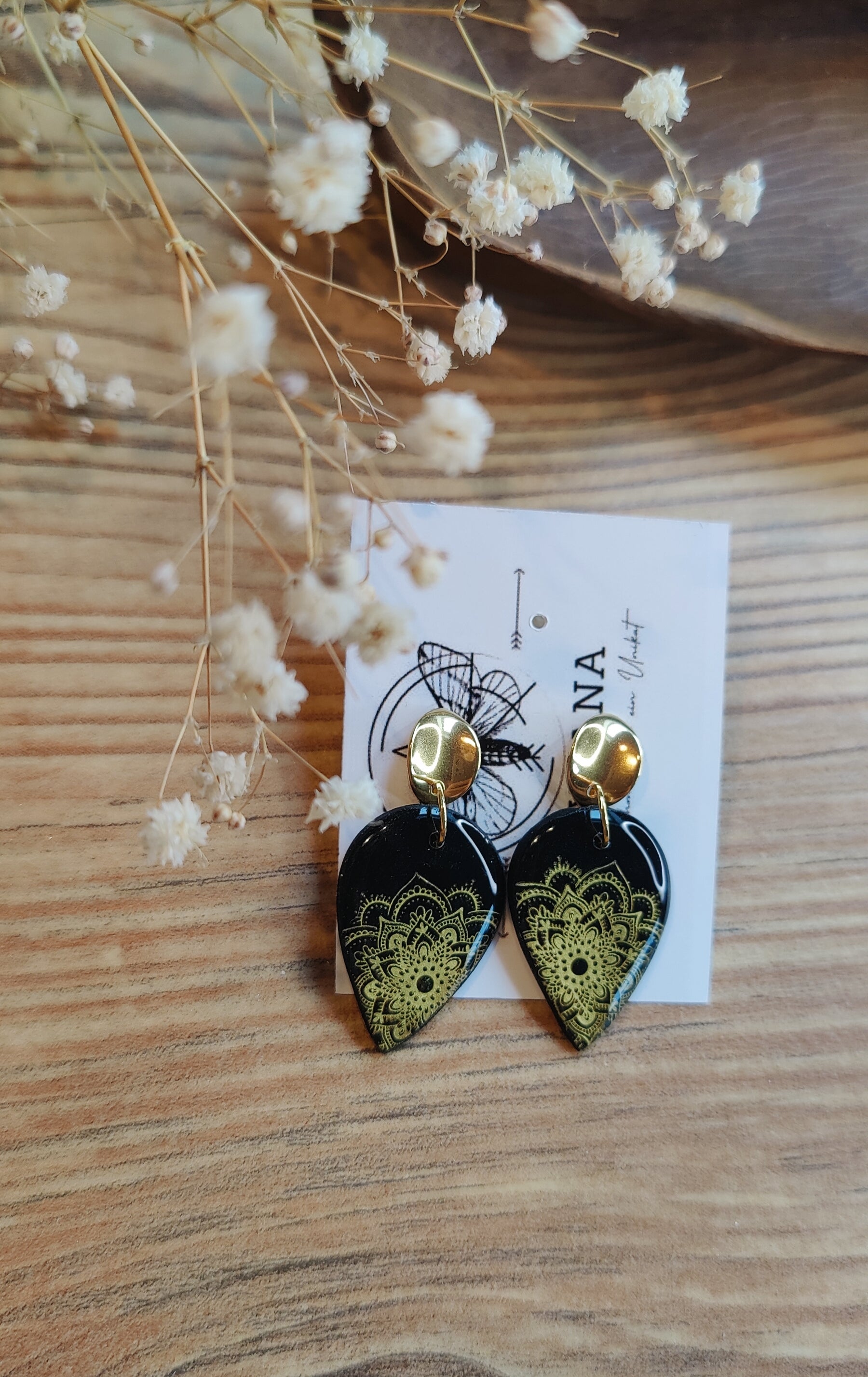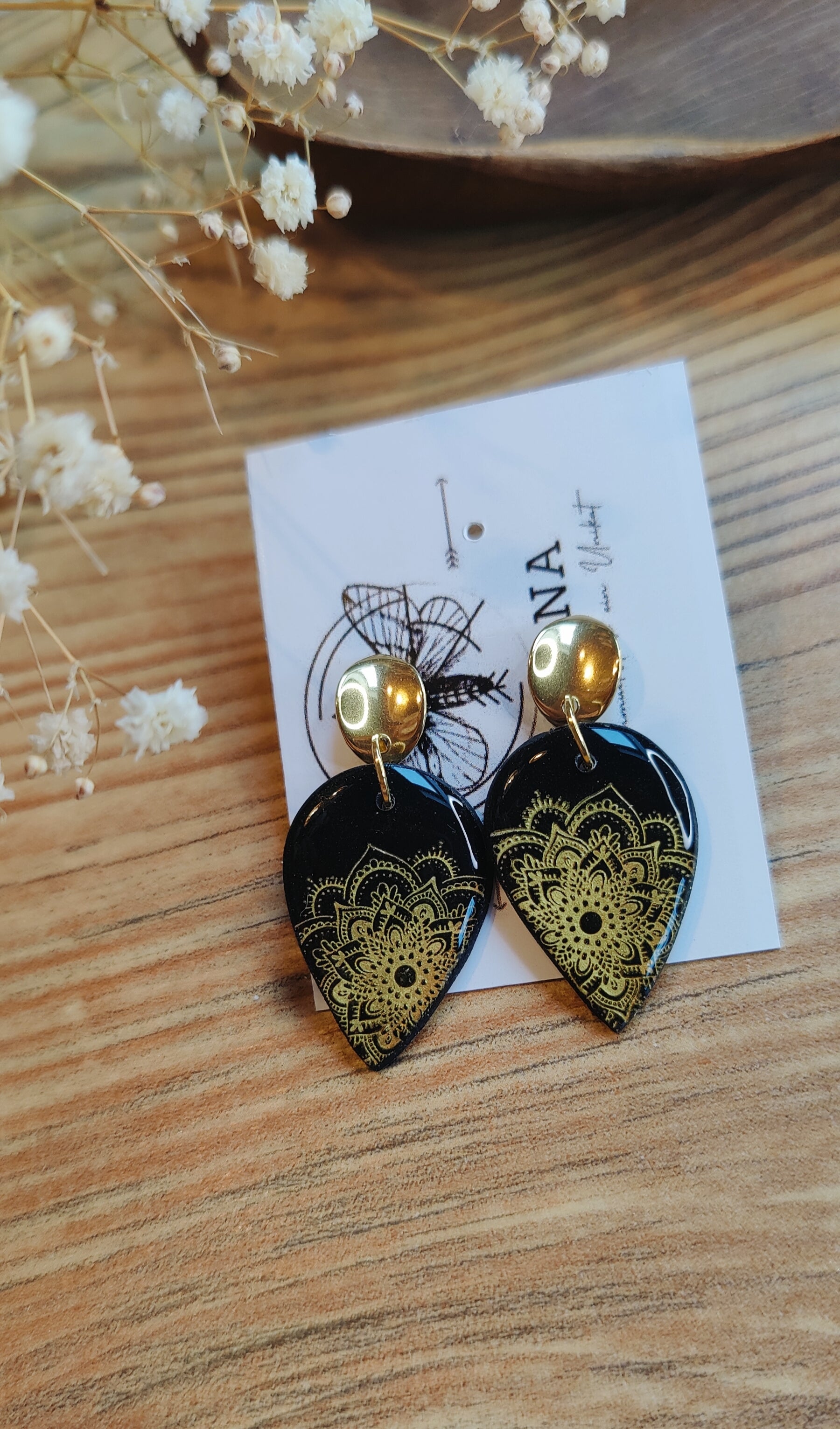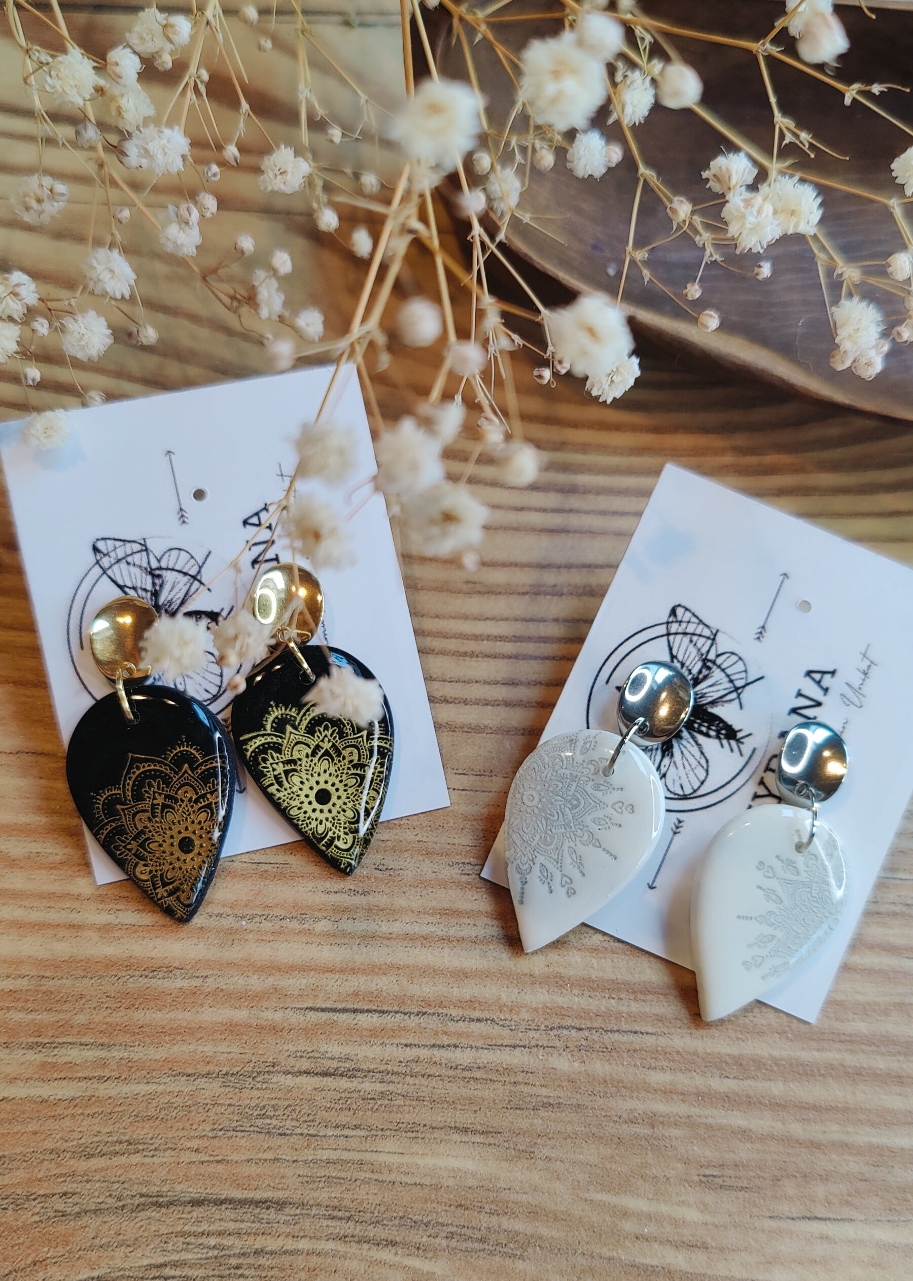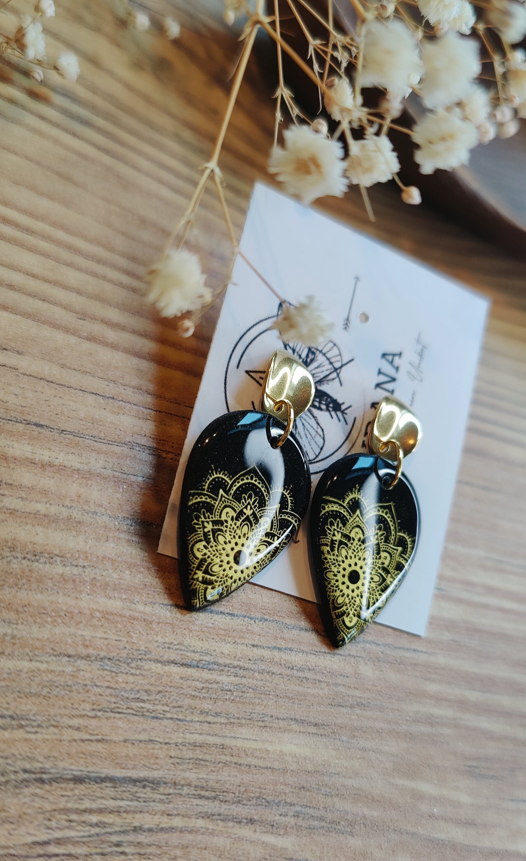 Diese handgefertigten Ohrstecker vereinen elegantes Design mit kunstvoller Detailarbeit. Ein tropfenförmiger Polymer-Clay-Einsatz zeigt ein zartes Mandala-Muster, das an filigrane Ornamentik erinnert – ideal für Boho-Outfits, besondere Anlässe oder als dezentes Statement im Alltag.