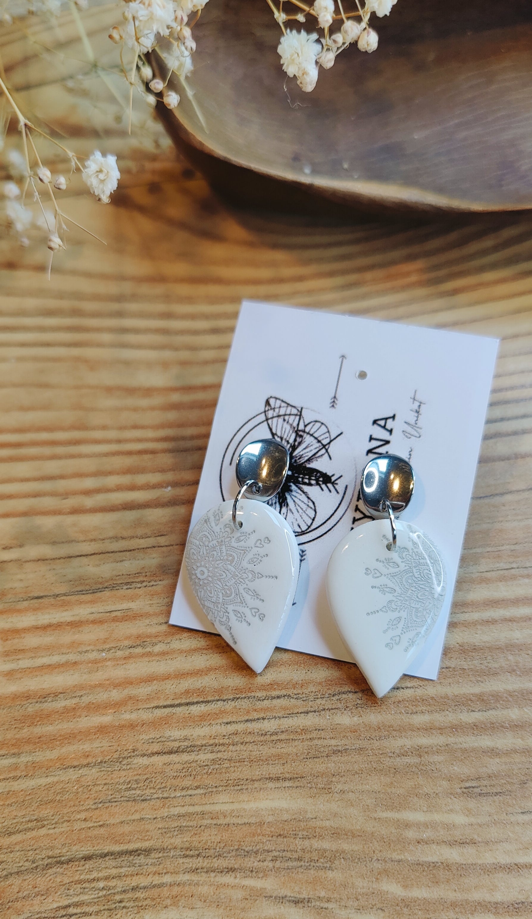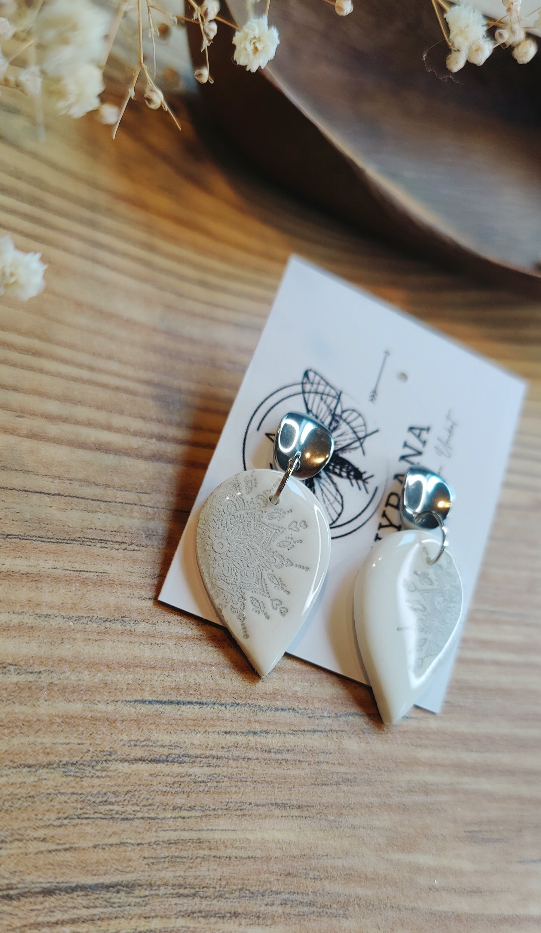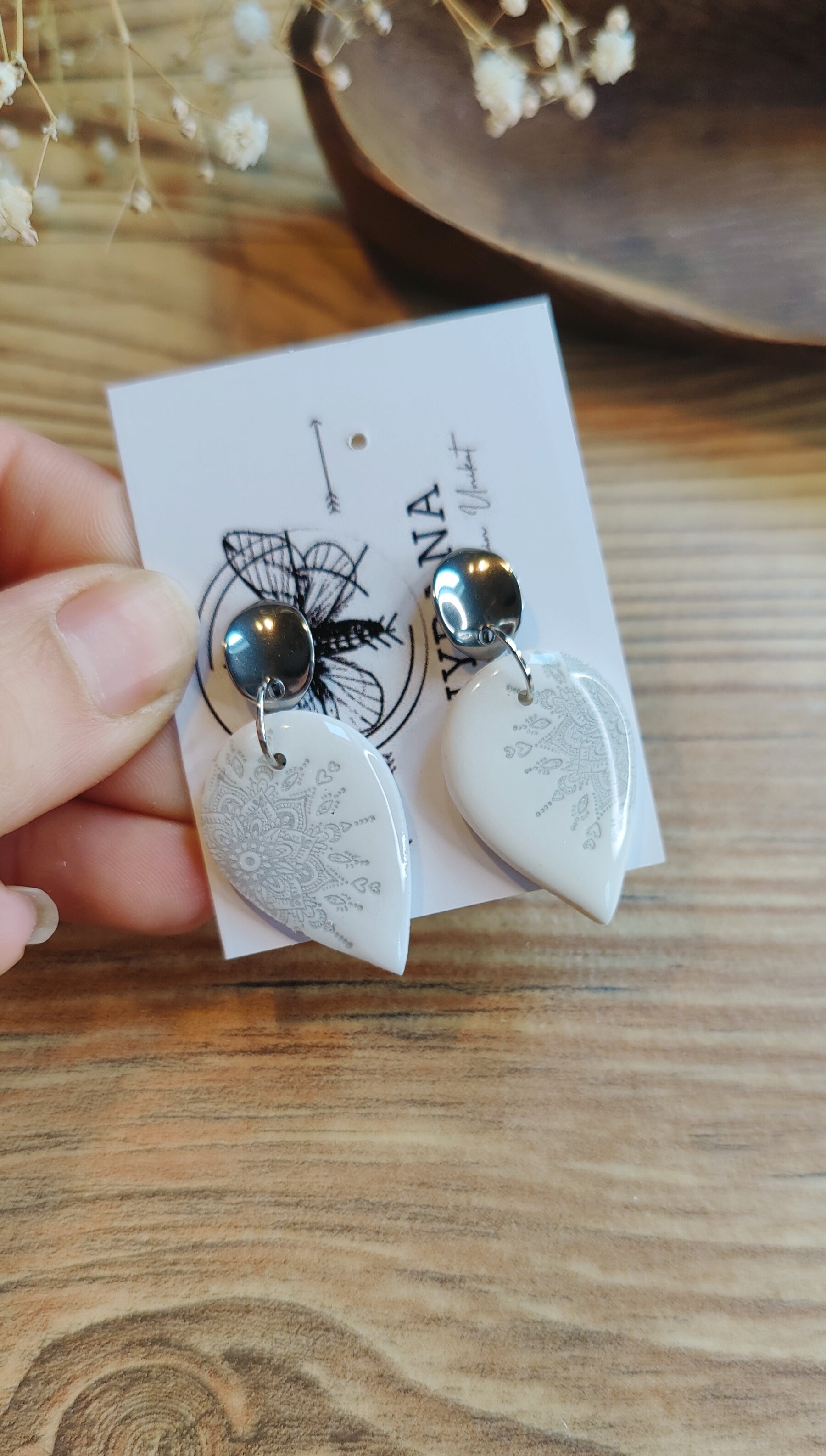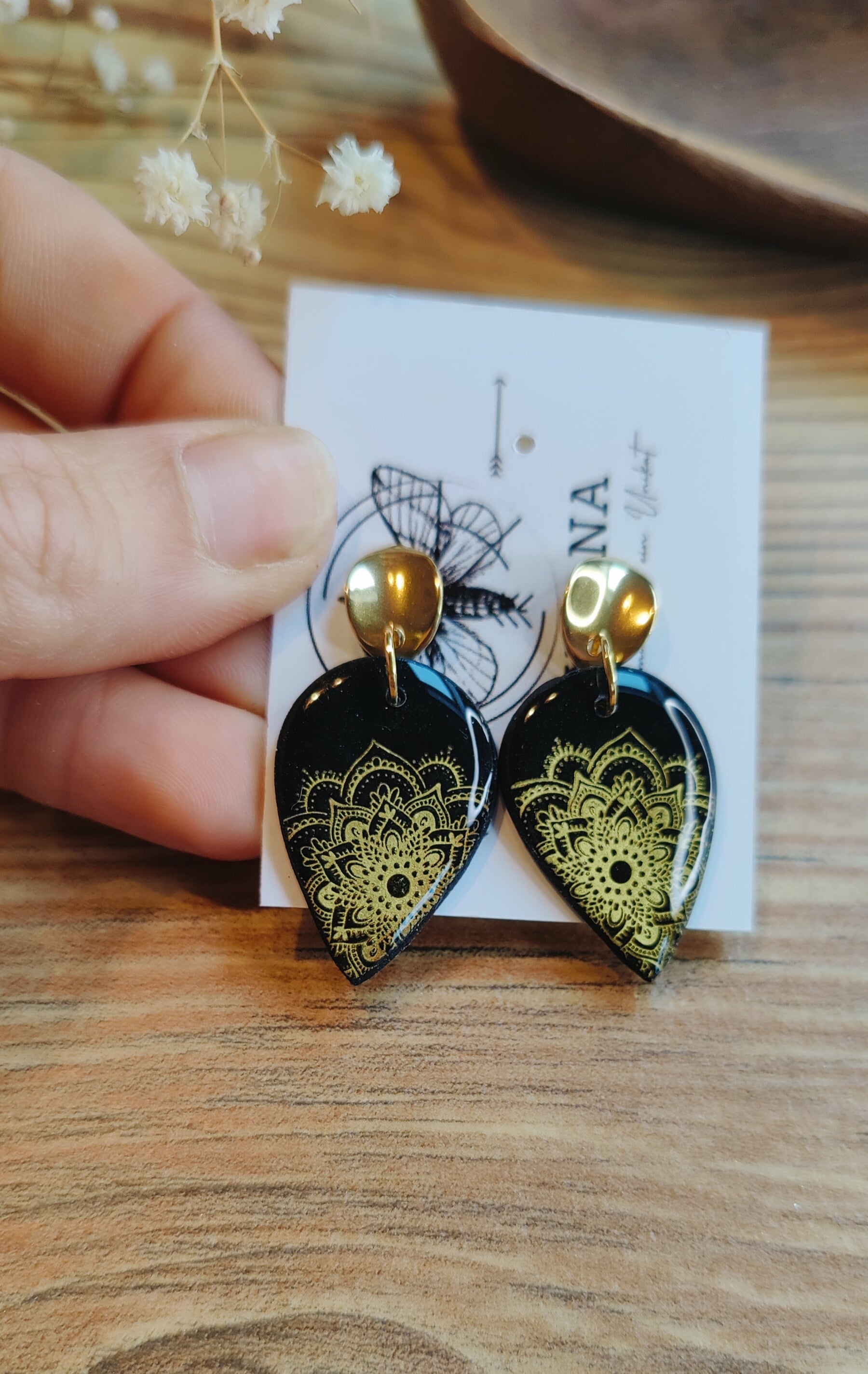 Diese handgefertigten Ohrstecker vereinen elegantes Design mit kunstvoller Detailarbeit. Ein tropfenförmiger Polymer-Clay-Einsatz zeigt ein zartes Mandala-Muster, das an filigrane Ornamentik erinnert – ideal für Boho-Outfits, besondere Anlässe oder als dezentes Statement im Alltag.