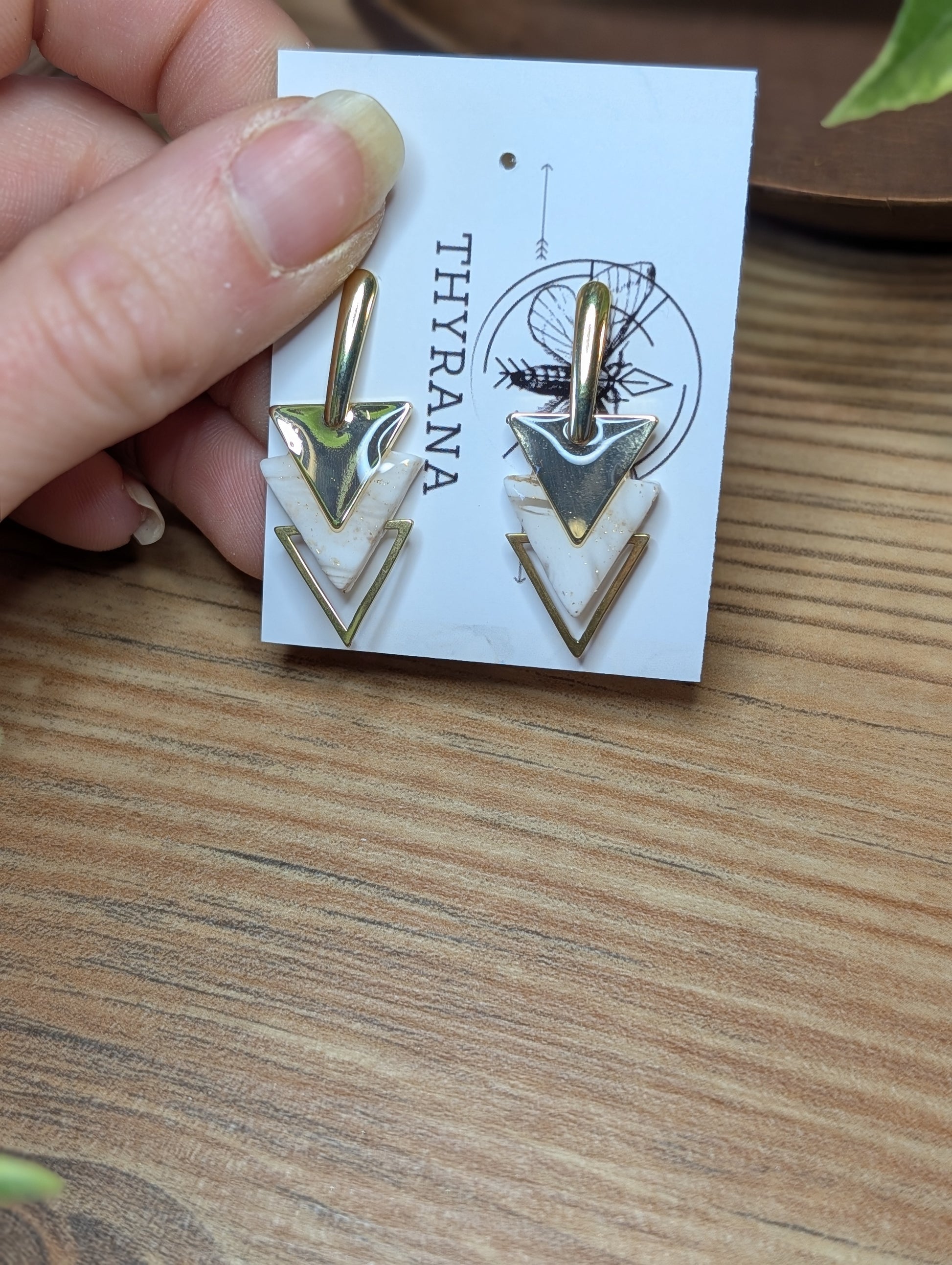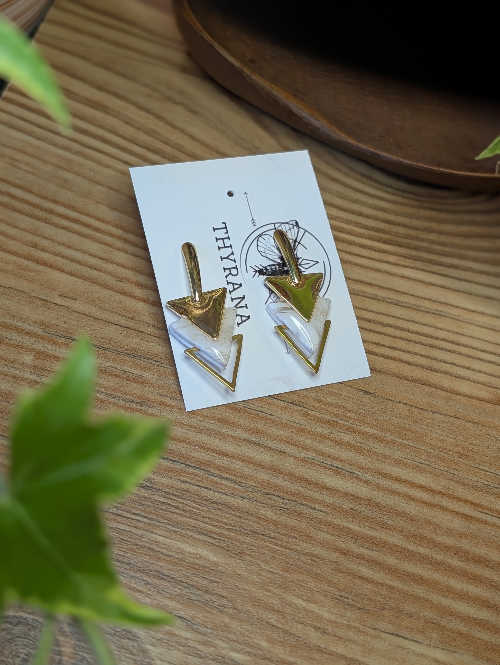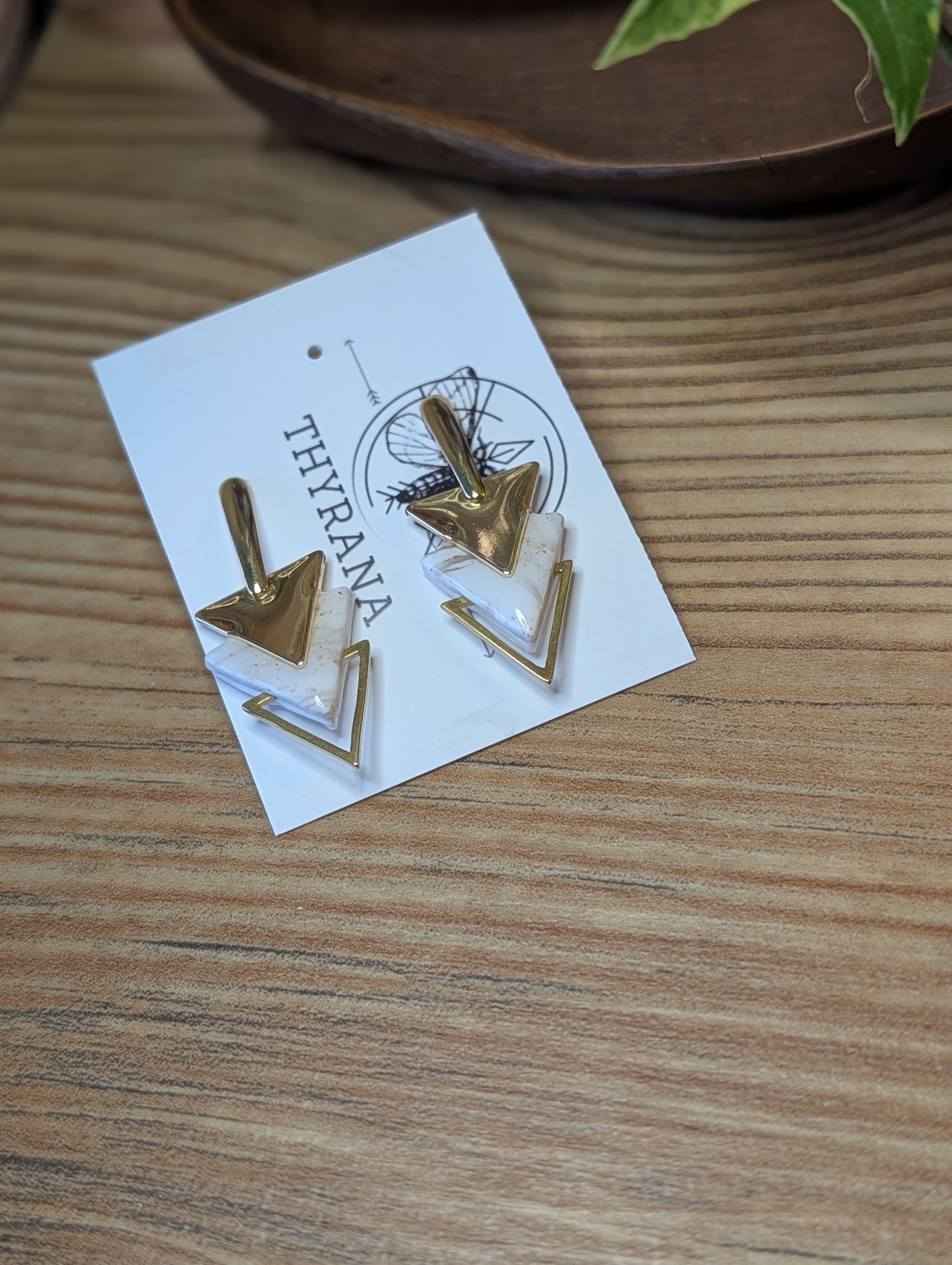 Diese handgefertigten Ohrstecker setzen auf klare, moderne Geometrie. Die dreieckigen Elemente aus Polymer-Ton sind liebevoll von Hand gefertigt und machen jeden Ohrstecker zu einem einzigartigen Unikat. Feine Metallelemente aus Edelstahl verleihen den Ohrringen zusätzlichen Glanz und Struktur.