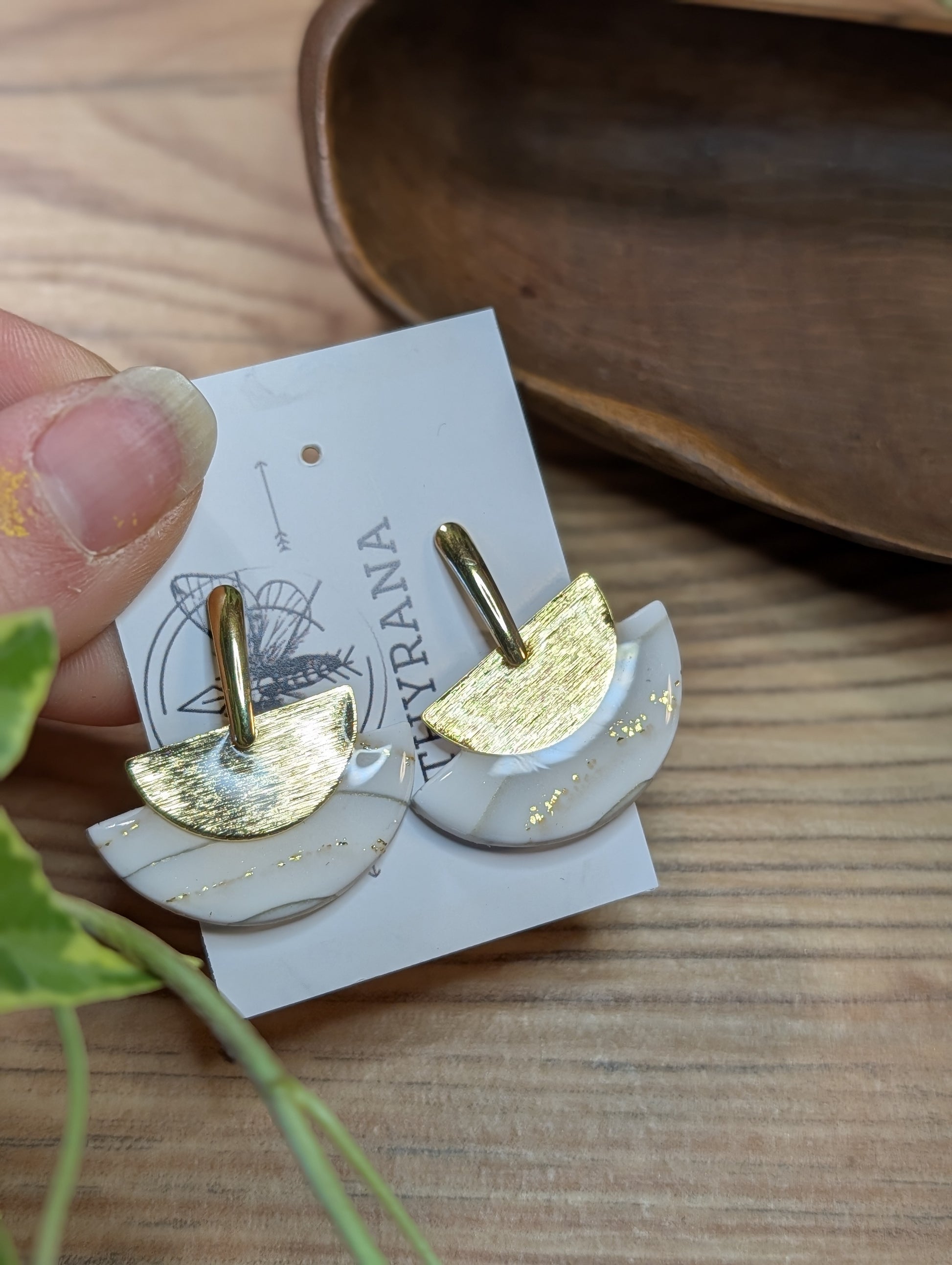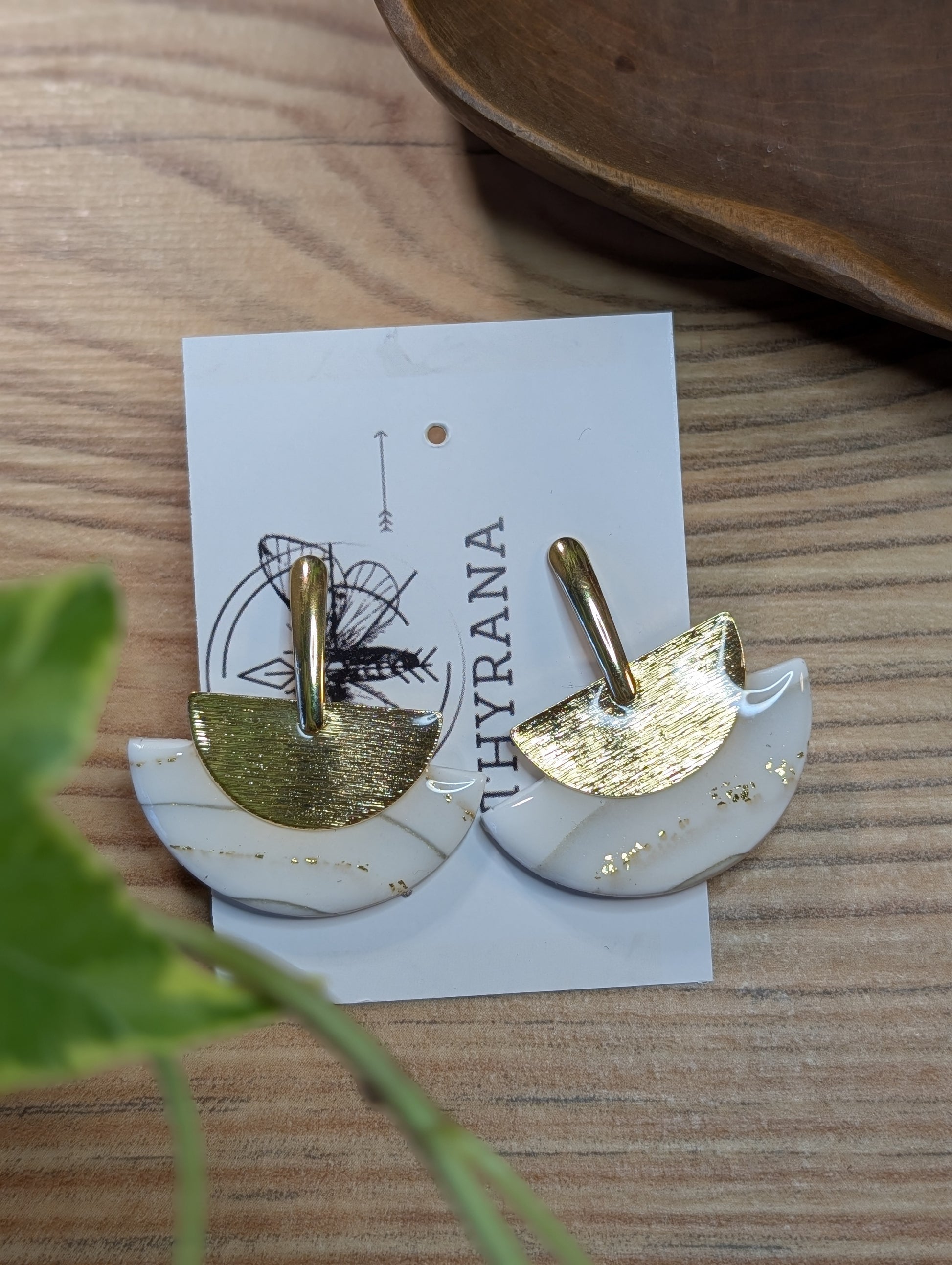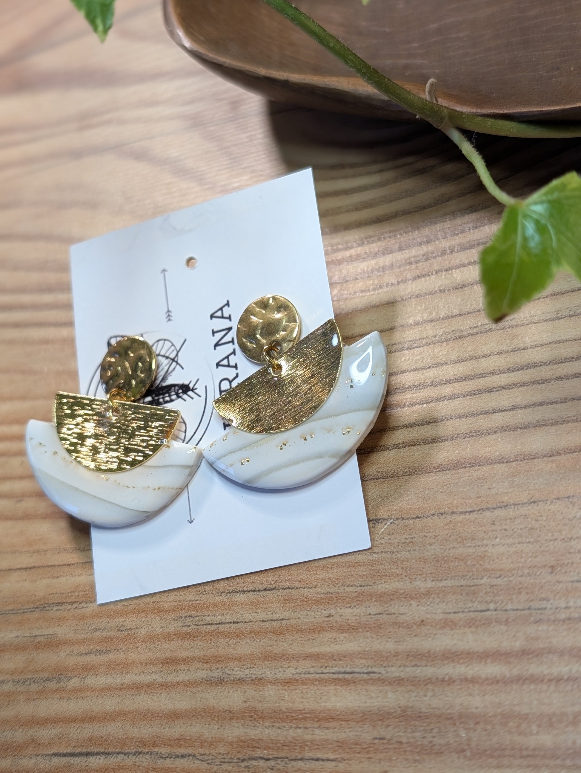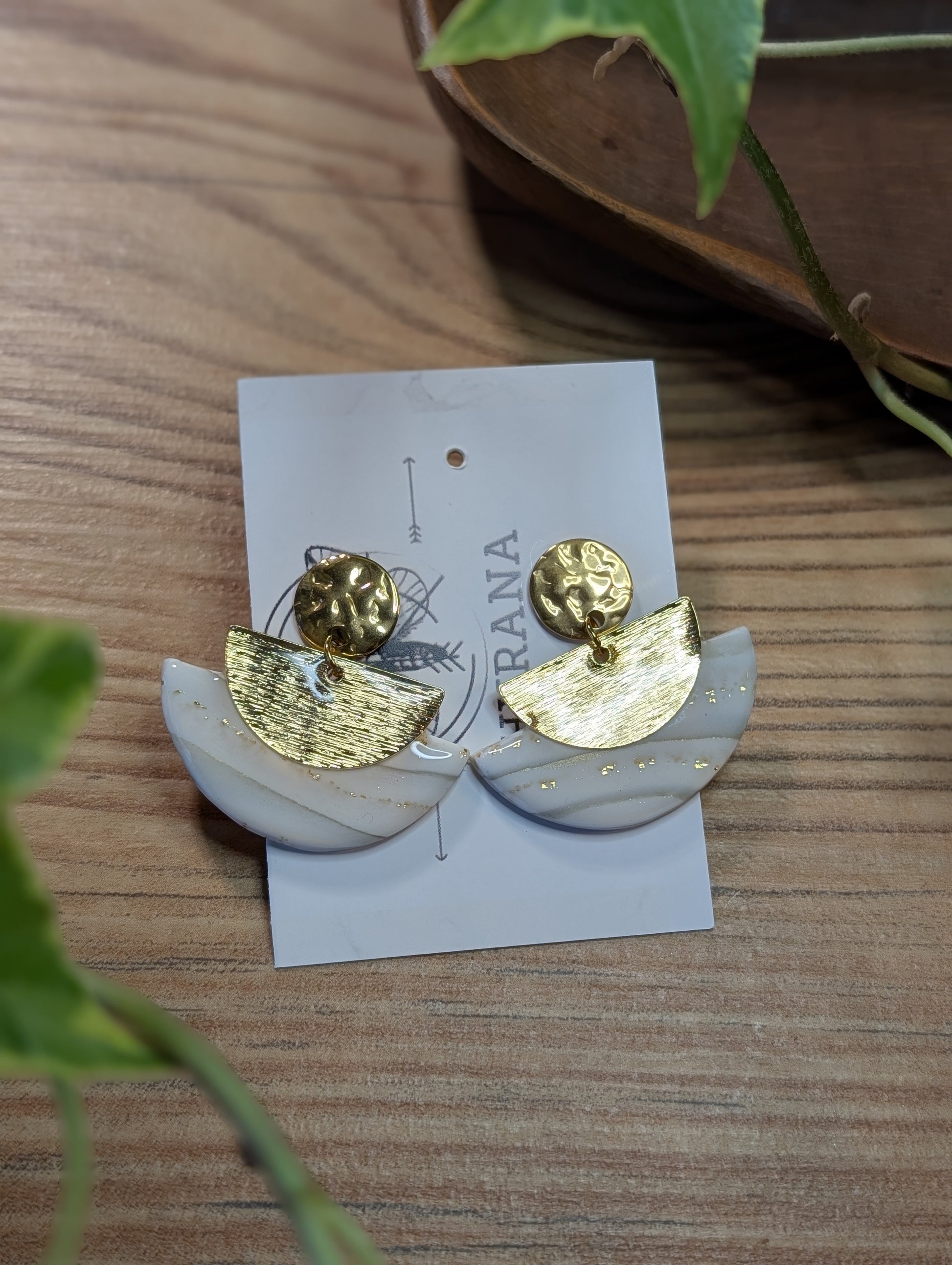 Diese handgefertigten Ohrstecker vereinen modernes Design mit zeitloser Eleganz. Der fein gearbeitete Halbkreis aus hochwertigem Polymer Ton wird von einem edlen Element aus 24k vergoldetem Messing ergänzt. Die Kombination aus sanfter Form und warmem Goldton macht dieses Schmuckstück zu einem stilvollen Highlight für besondere Anlässe.