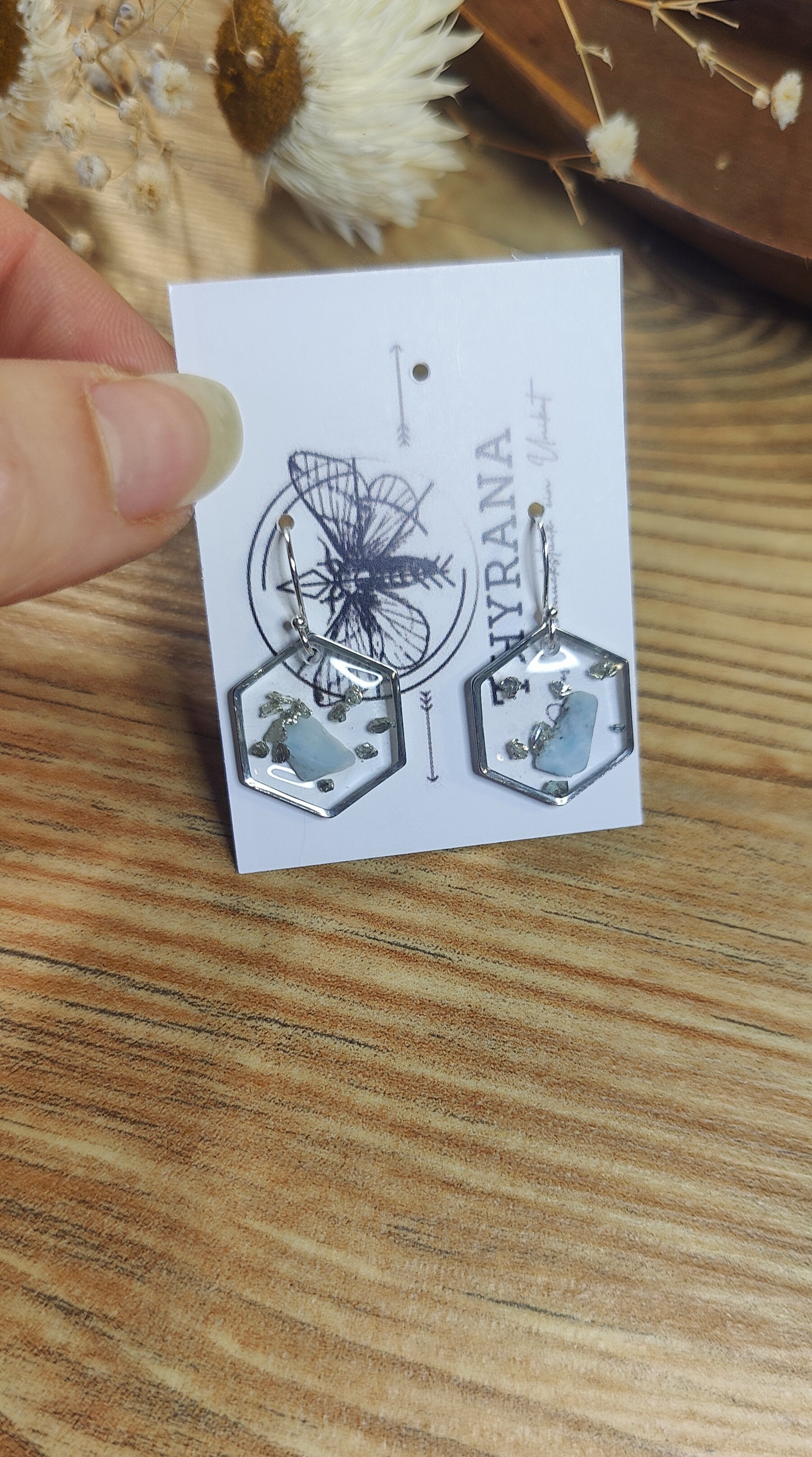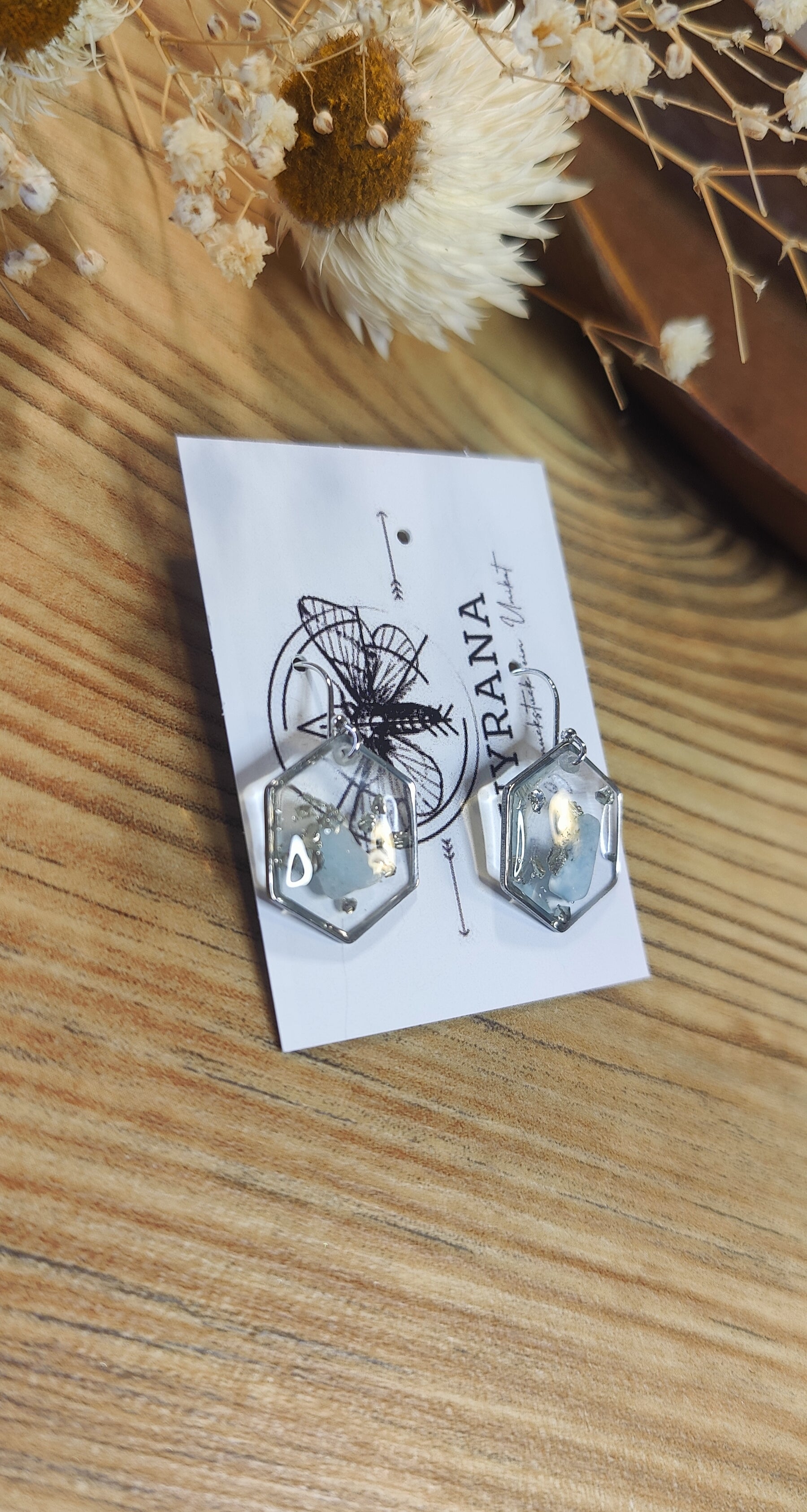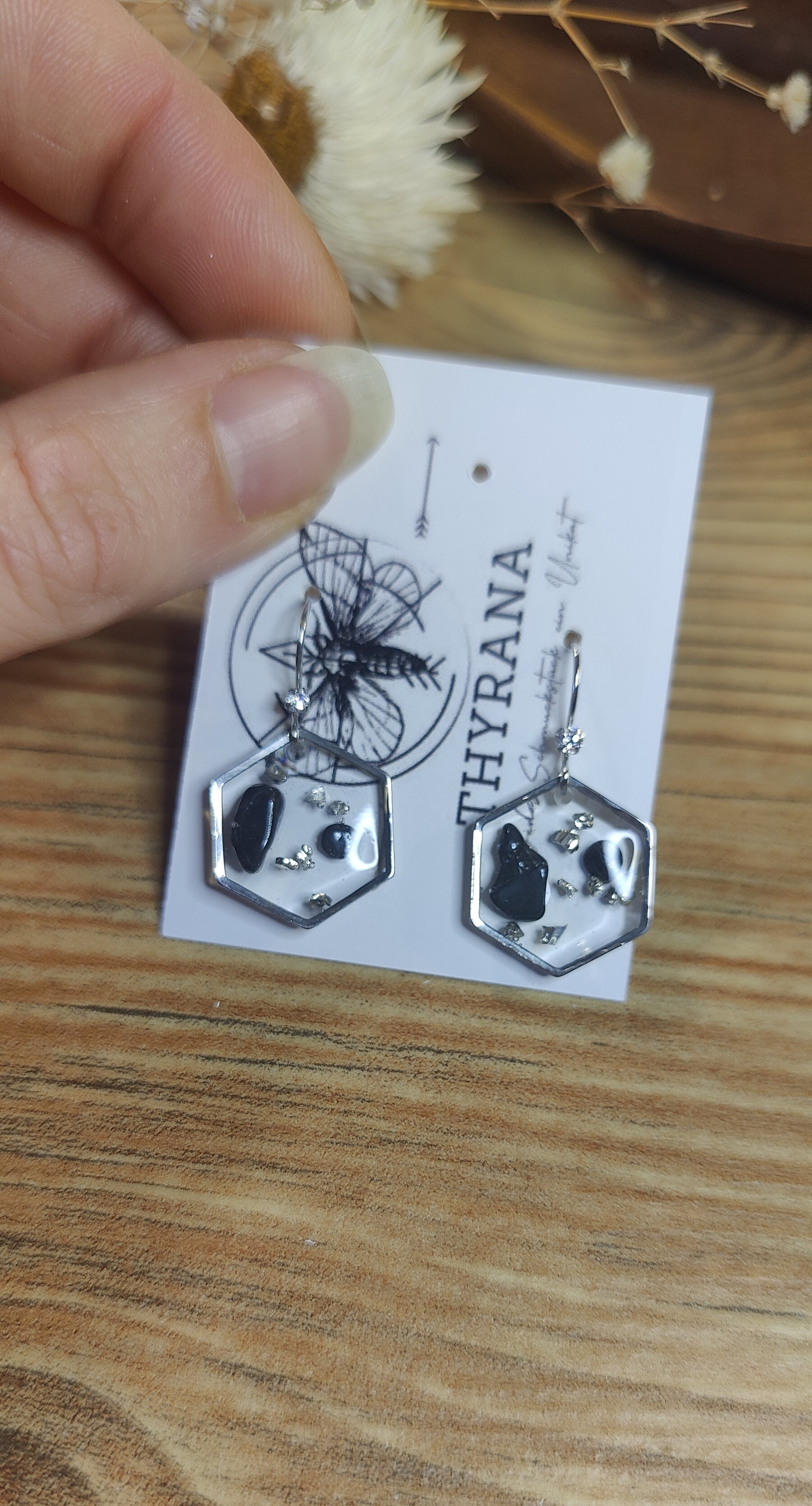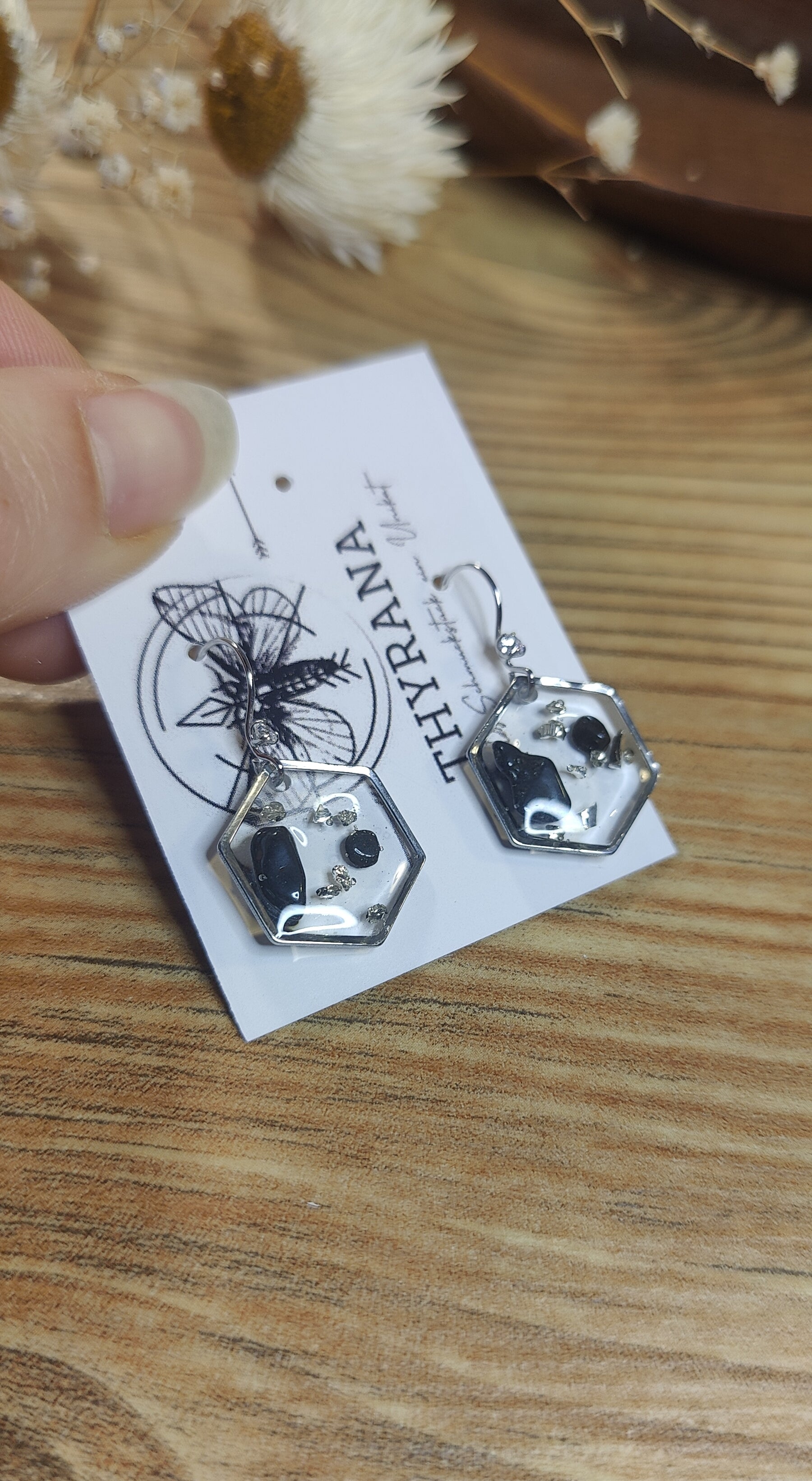 Der markante Hexagon-Edelstahlrahmen (Sechseck) setzt ein stilvolles Statement und fasst ein kunstvoll gegossenes Harz-Inlay ein, in dem echte Edelsteine harmonisch eingebettet sind.