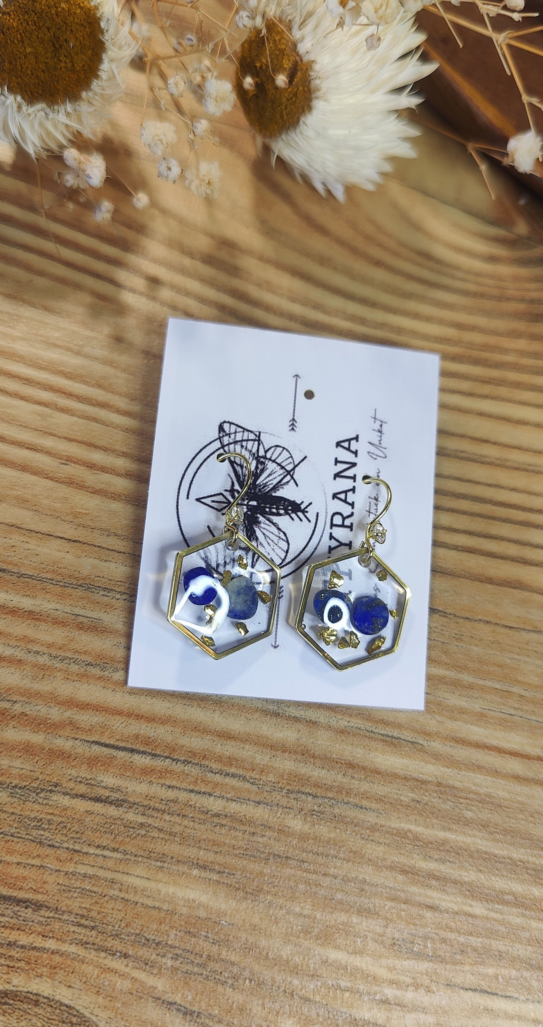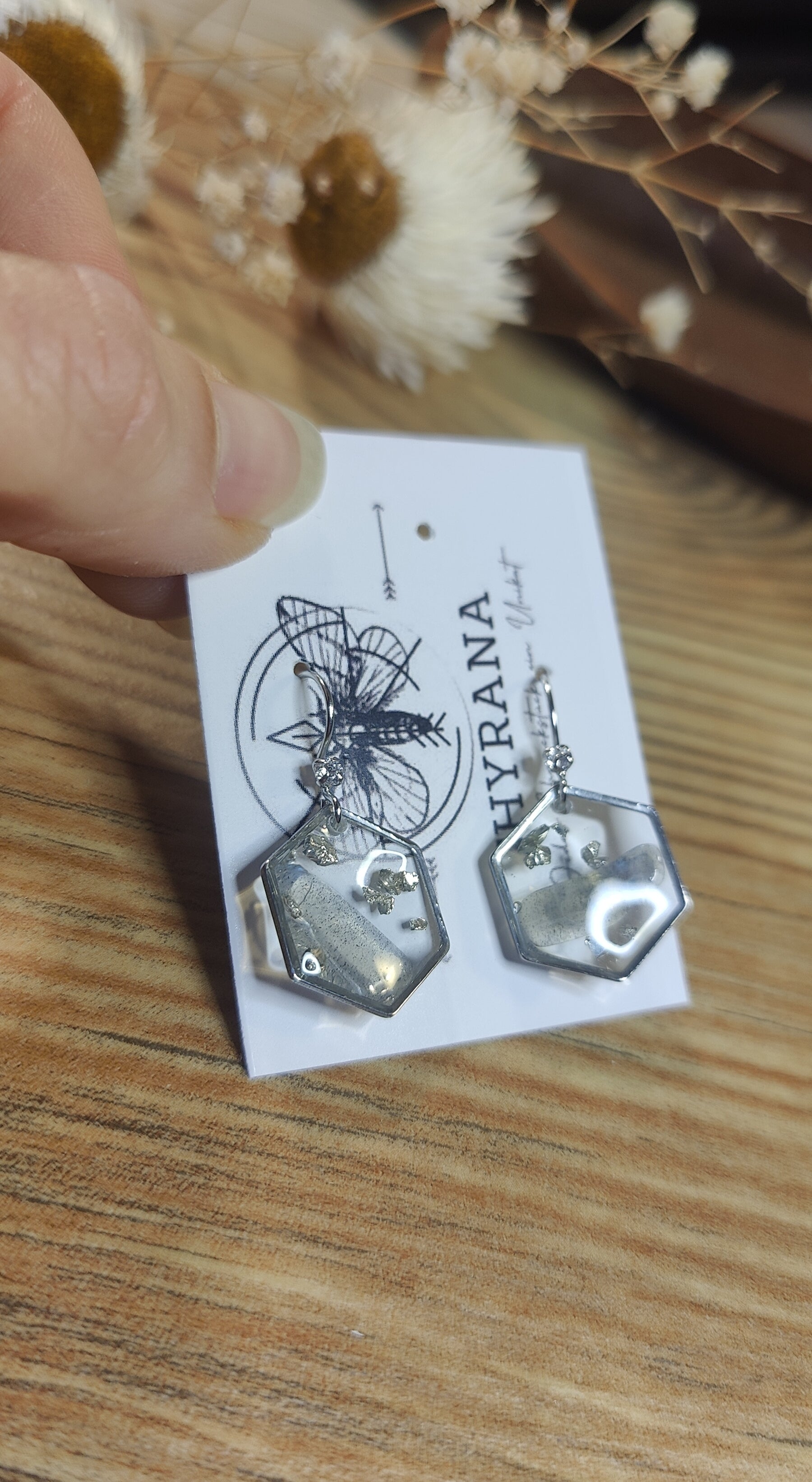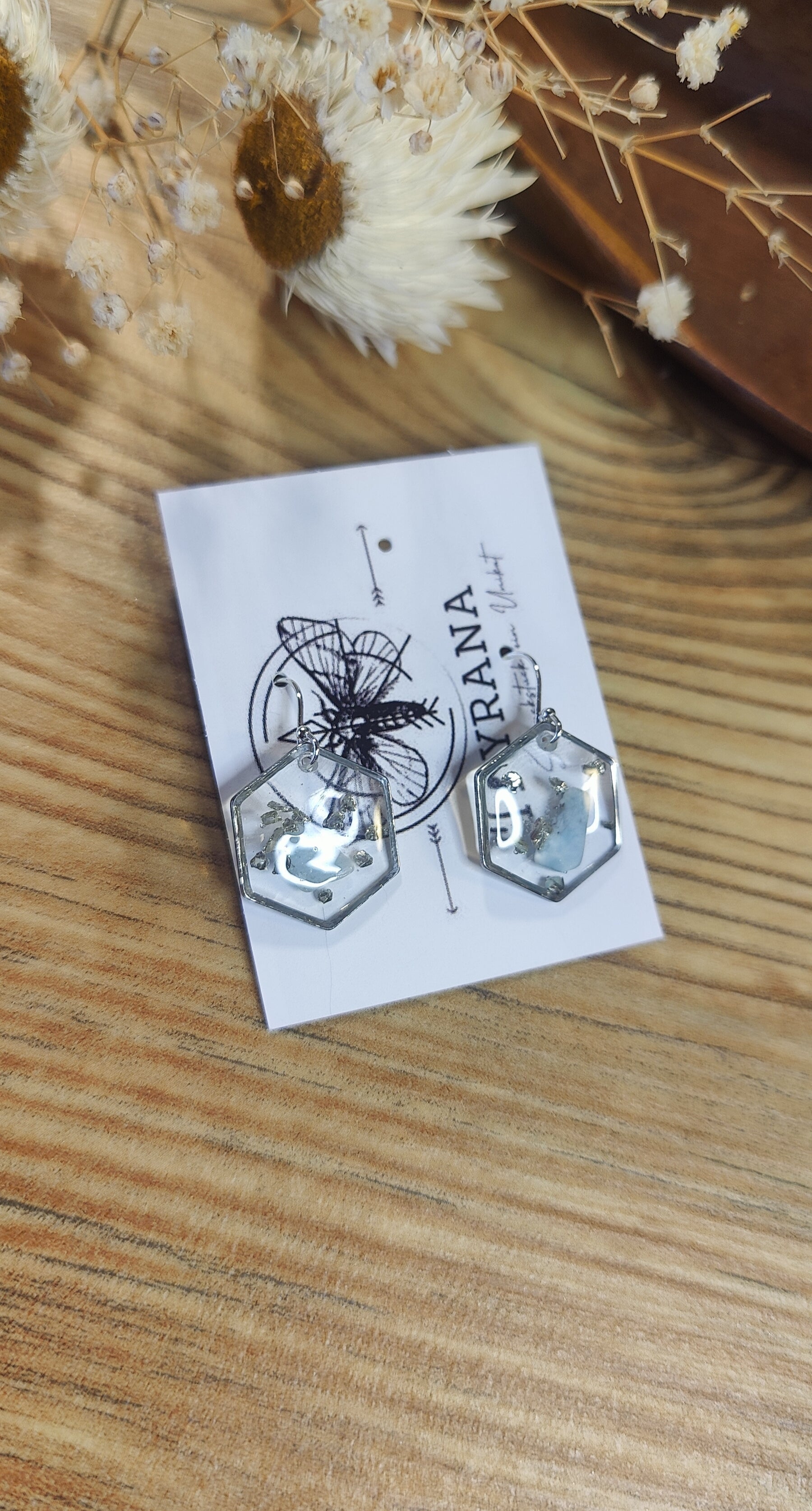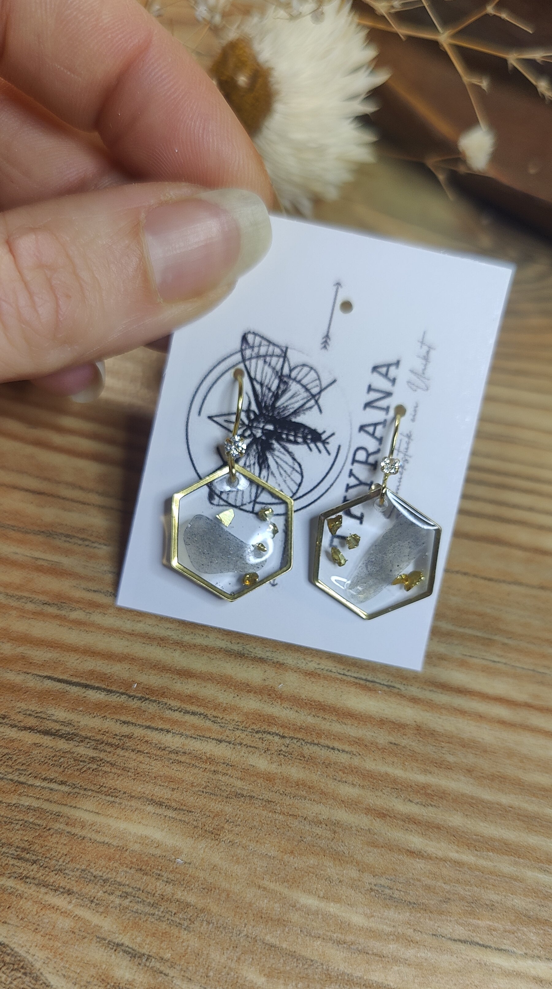 Der markante Hexagon-Edelstahlrahmen (Sechseck) setzt ein stilvolles Statement und fasst ein kunstvoll gegossenes Harz-Inlay ein, in dem echte Edelsteine harmonisch eingebettet sind.