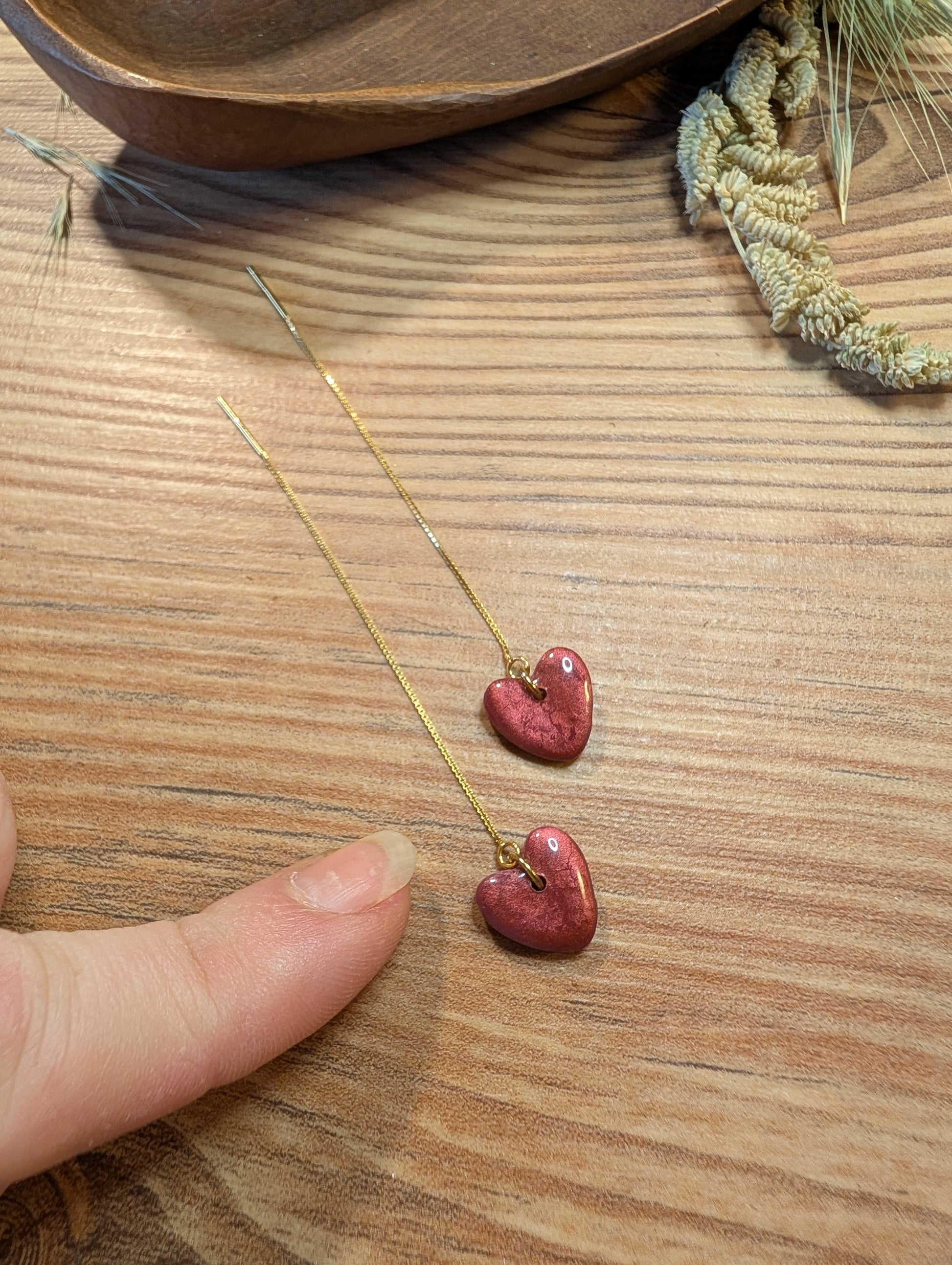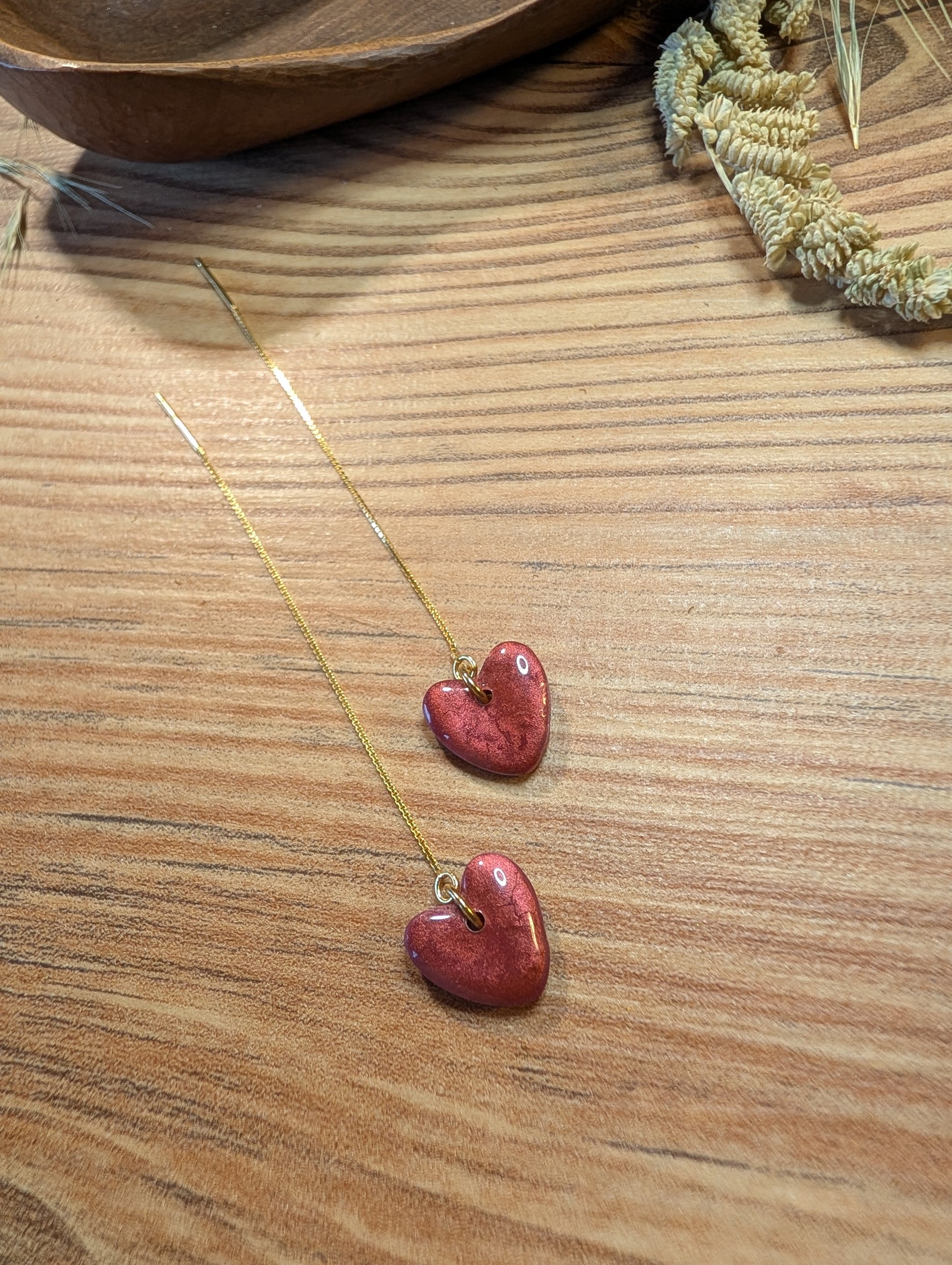 Diese liebevoll handgefertigten Ohrringe begeistern mit ihrem roten, schimmernden Herz aus hochwertigem Polymer-Ton. Jedes Paar ist ein Unikat und wird mit viel Sorgfalt von Hand gefertigt. Das edle Funkeln verleiht den Ohrringen eine elegante Note und macht sie zu einem besonderen Blickfang – perfekt für Alltag und besondere Anlässe.