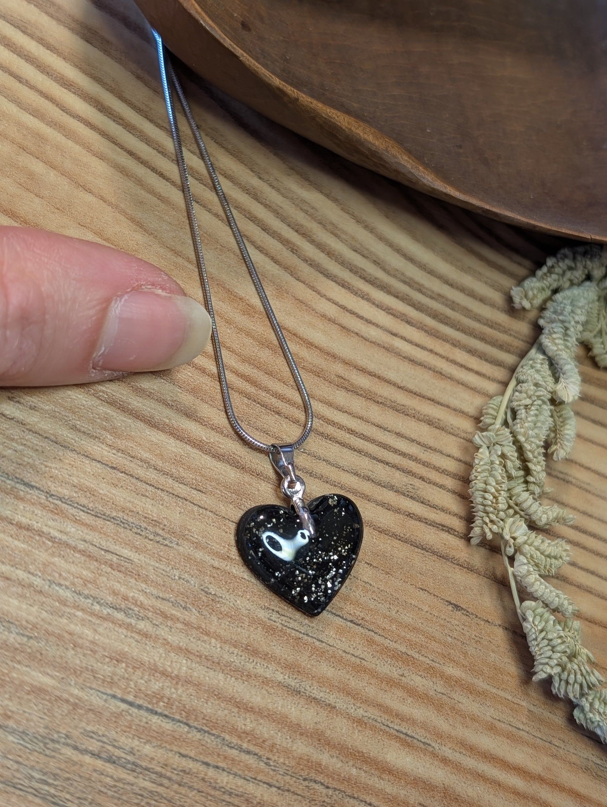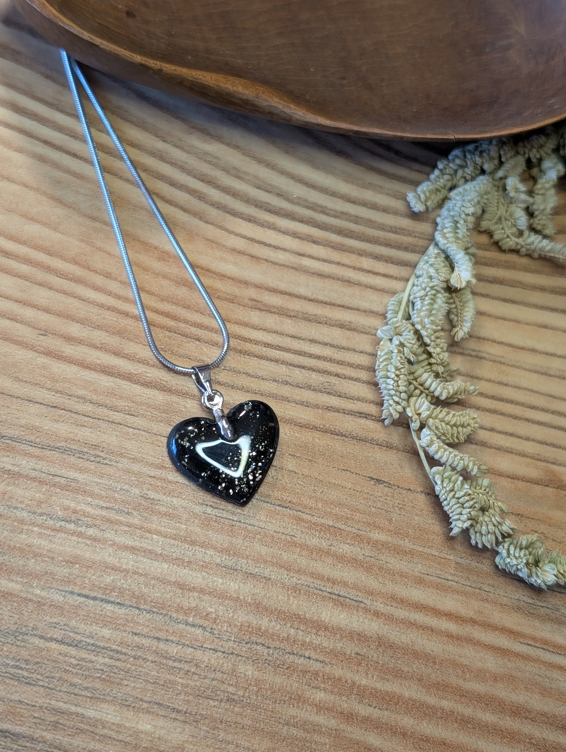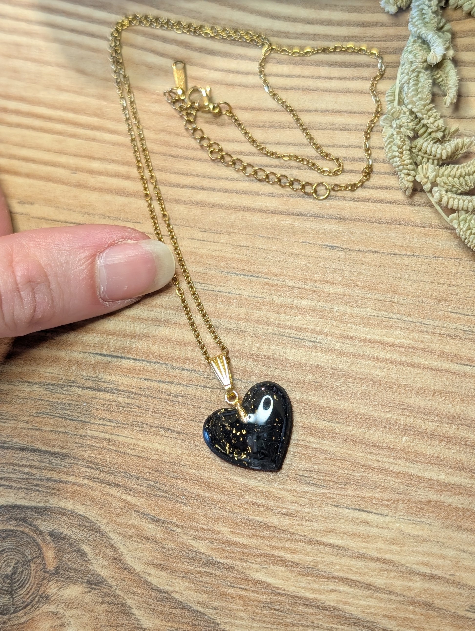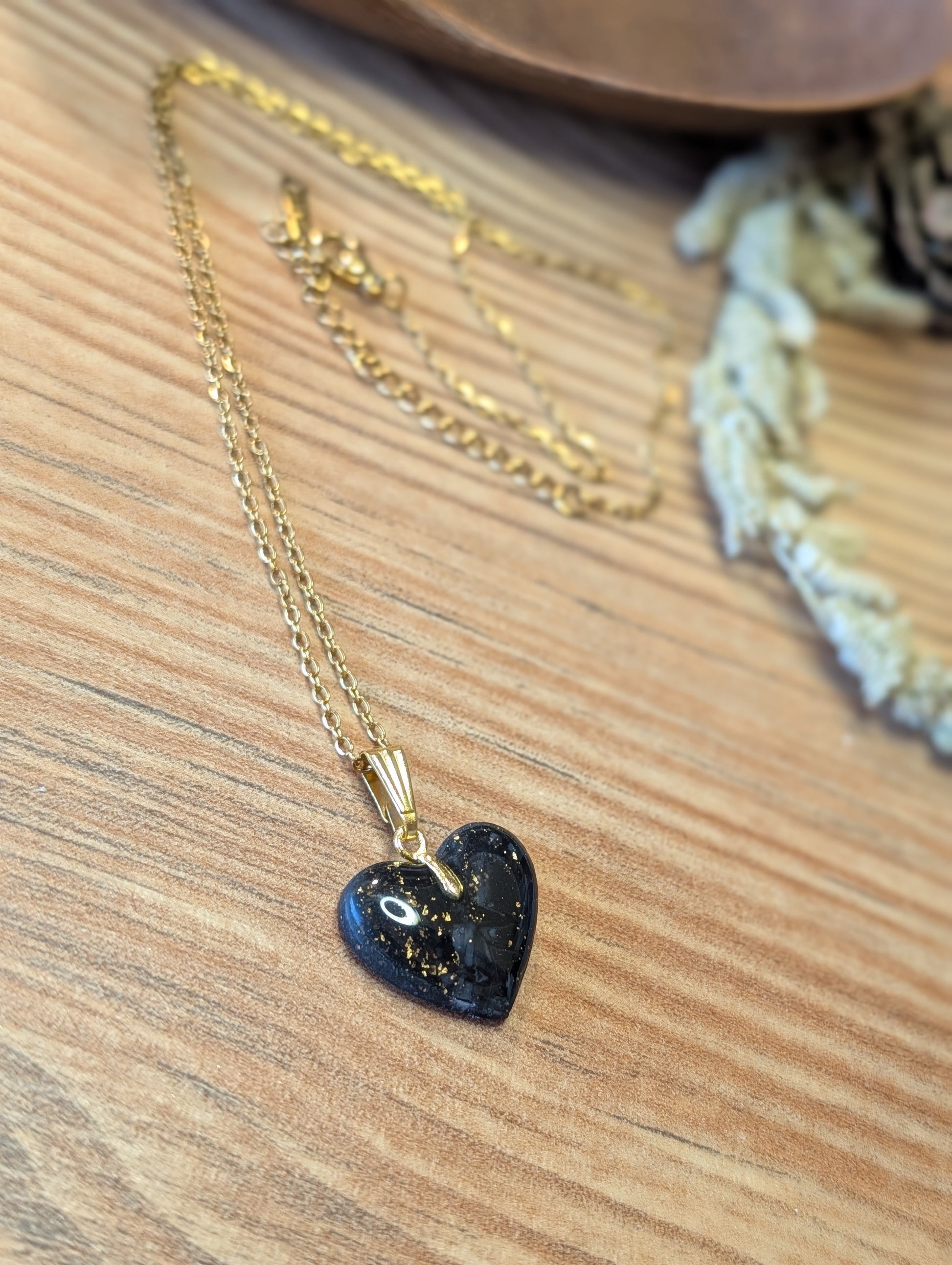 Das Herz aus Polymer Ton wird von Hand gefertigt und ist in Gold-Schwarz oder Silber-Schwarz erhältlich – jede Farbvariante ein ausdrucksstarkes Unikat.