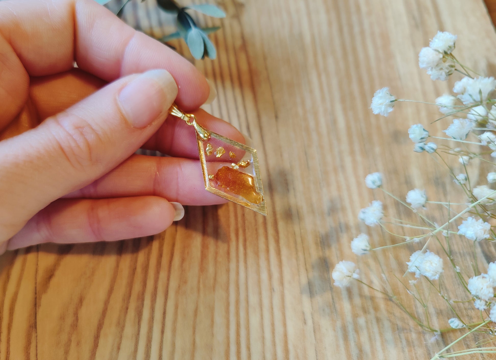 Dieser einzigartige Kettenanhänger kombiniert die natürliche Schönheit von echtem Bernstein mit der modernen Eleganz von klarem Gießharz. In aufwendiger Handarbeit gefertigt, wird jedes Schmuckstück zu einem Unikat. Der eingeschlossene Bernstein fasziniert mit seinen warmen Farbtönen und natürlichen Einschlüssen, während das kristallklare Harz für eine schützende und stilvolle Umhüllung sorgt.