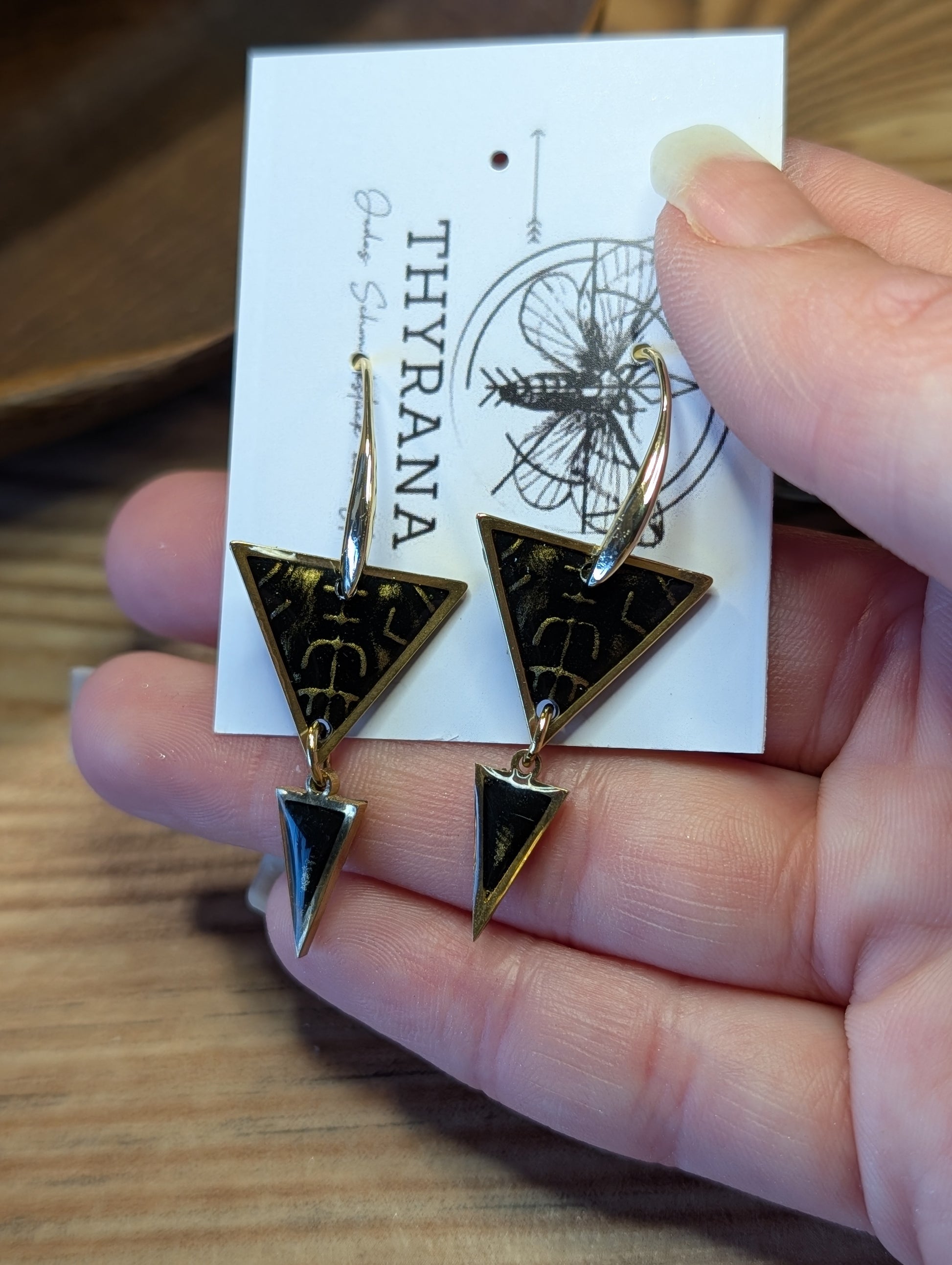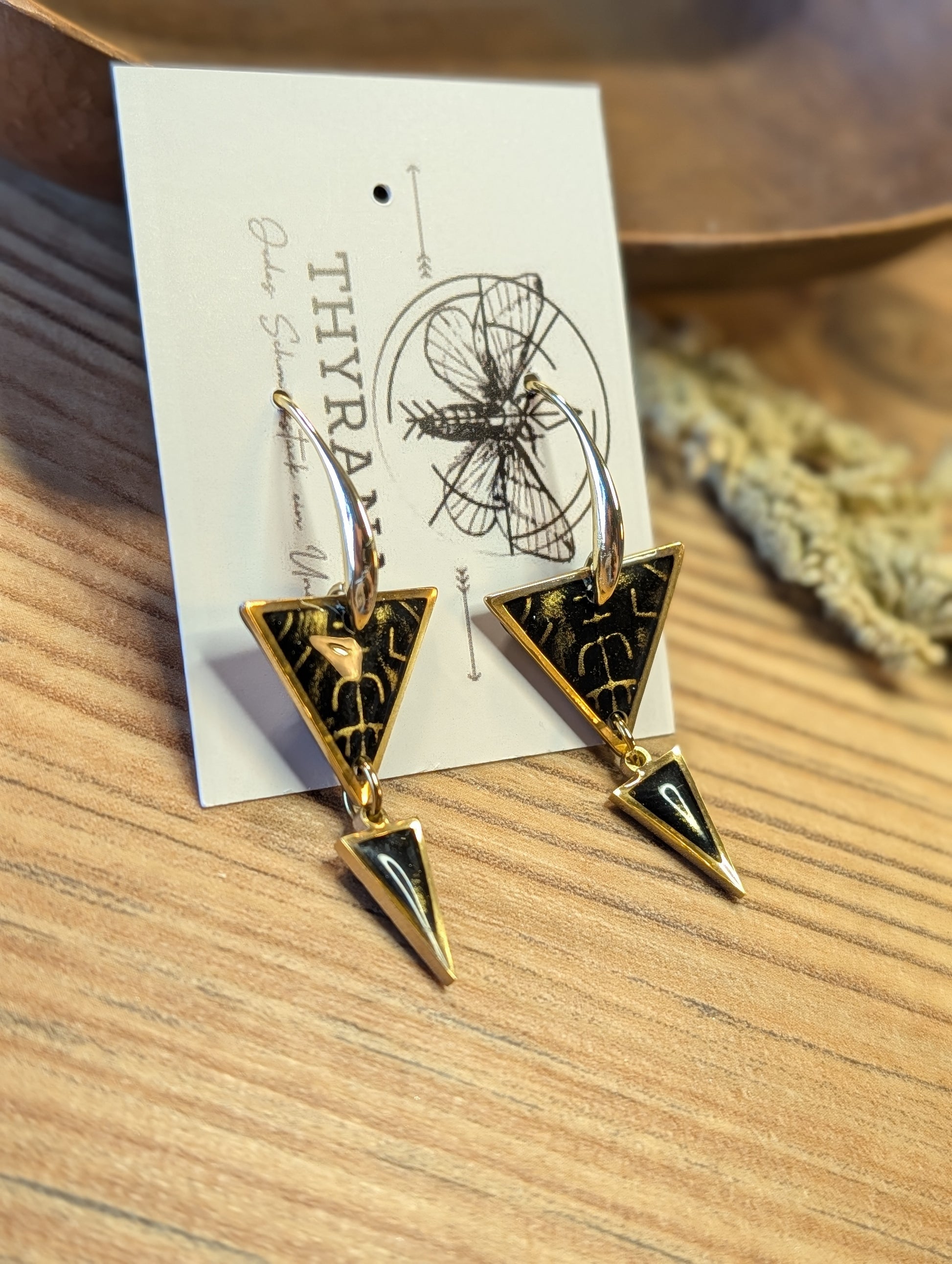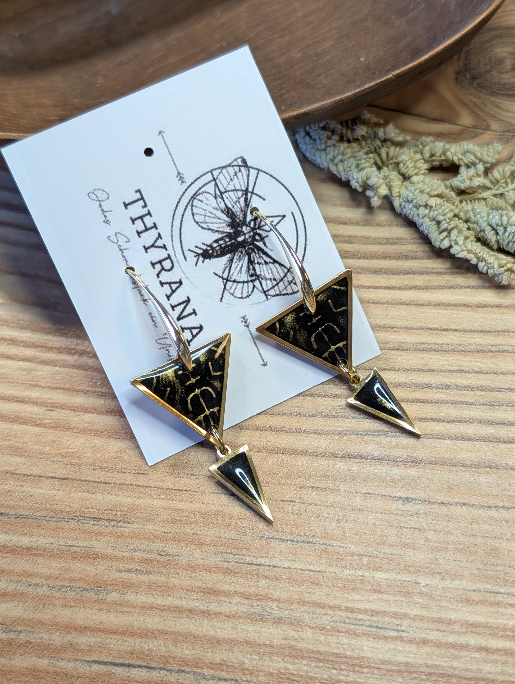 Setze ein mystisches Statement mit diesen einzigartigen Ohrringen! Jeder Anhänger wird liebevoll von Hand aus hochwertigem Polymer-Ton gefertigt und in edlem Schwarz mit goldenen Akzenten gestaltet. Die feinen Runen, sorgfältig eingearbeitet, verleihen den Ohrringen einen geheimnisvollen, nordischen Touch.