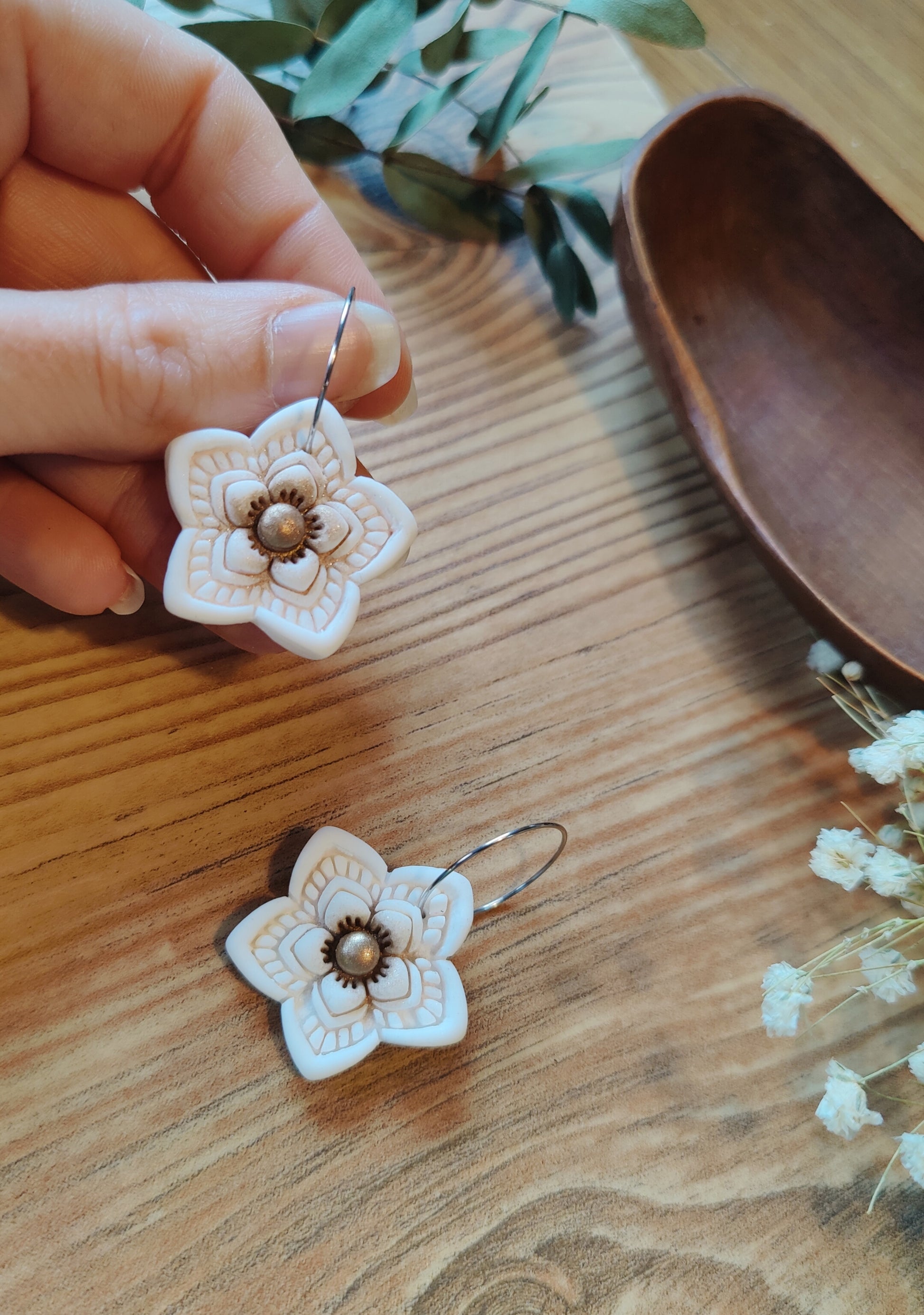 Diese zauberhaften Ohrringe wurden mit Liebe zum Detail aus hochwertigem Polymer-Ton handgefertigt und zeigen ein filigranes Blumenmuster. Die floralen Designs verleihen den Ohrringen eine verspielte, doch elegante Ausstrahlung, die sowohl im Alltag als auch zu besonderen Anlässen getragen werden kann.
