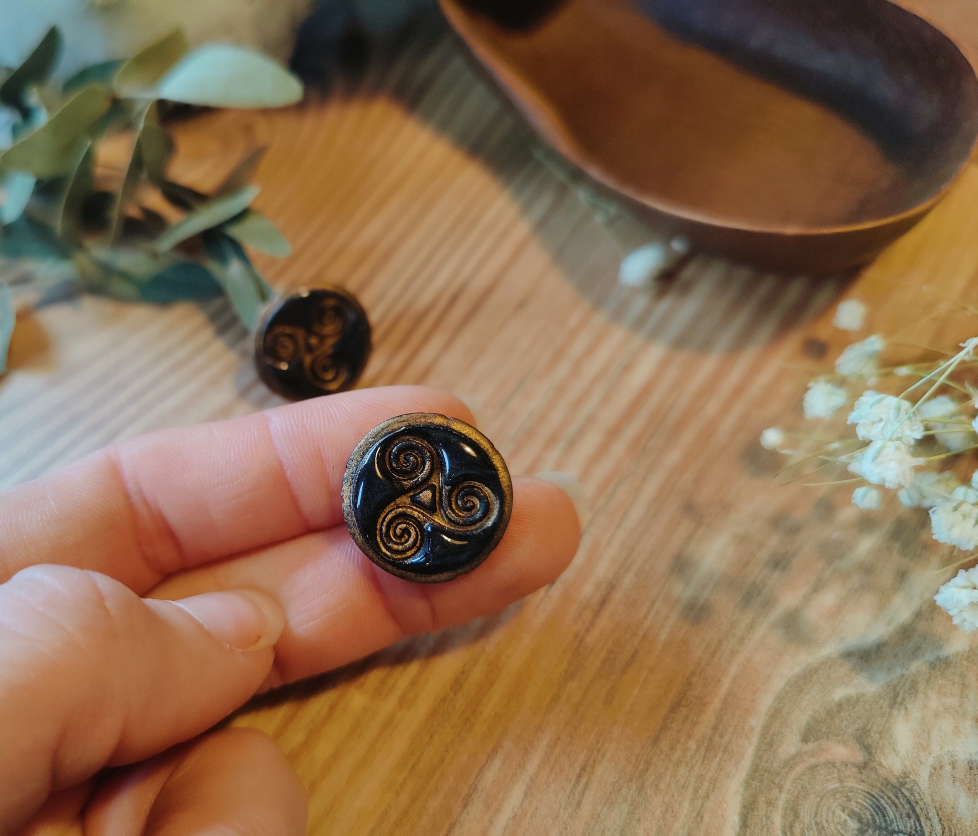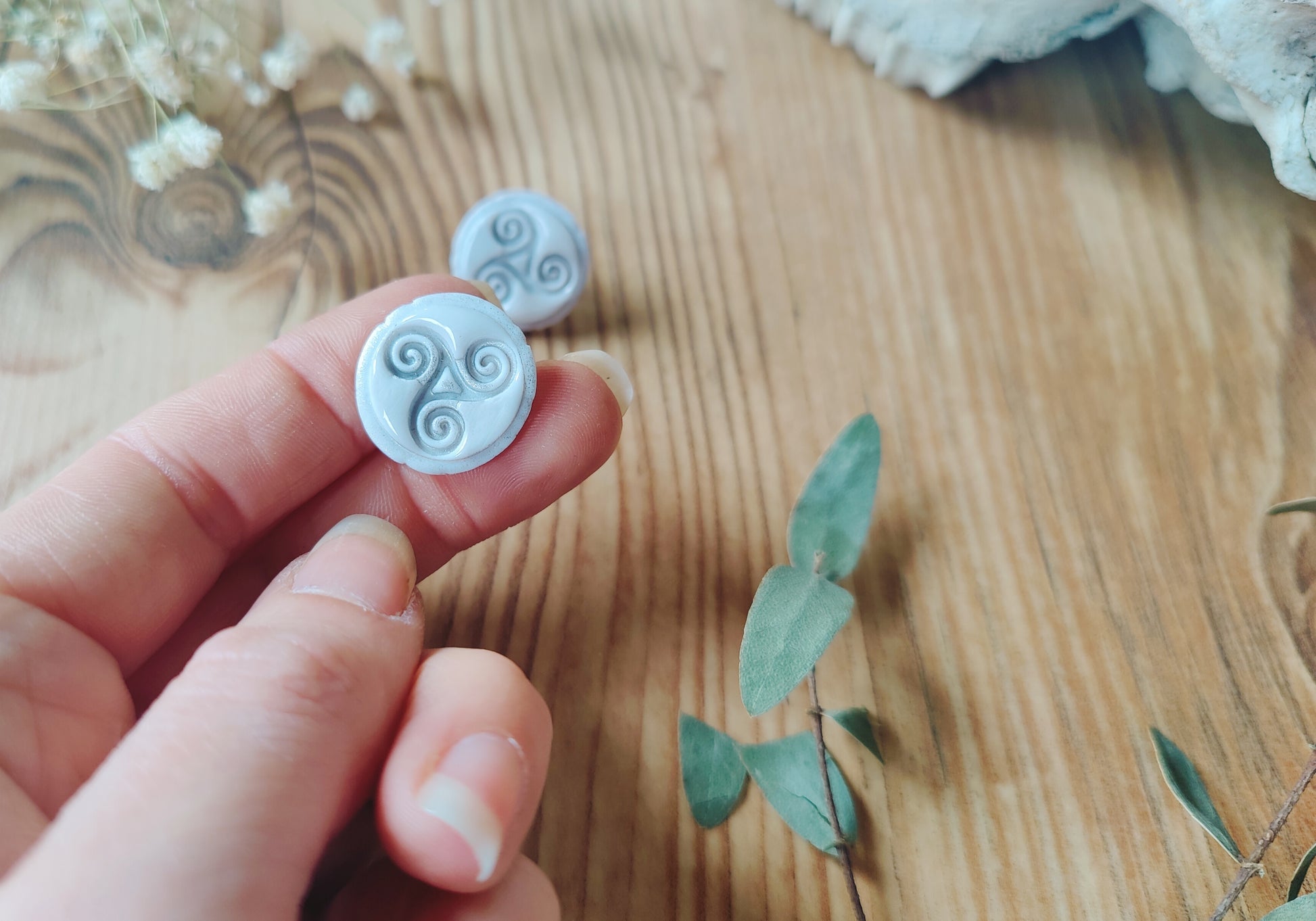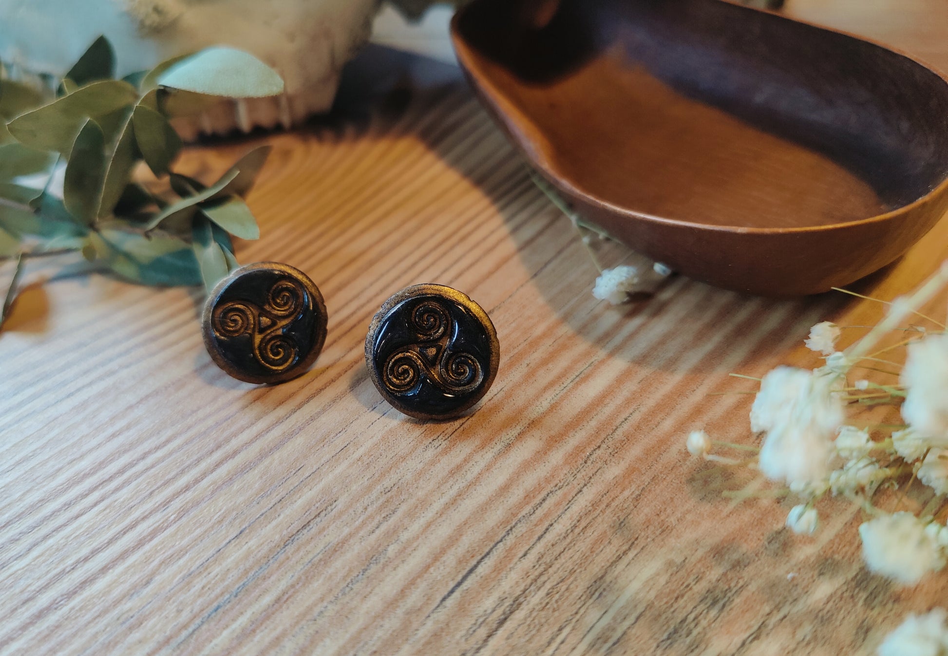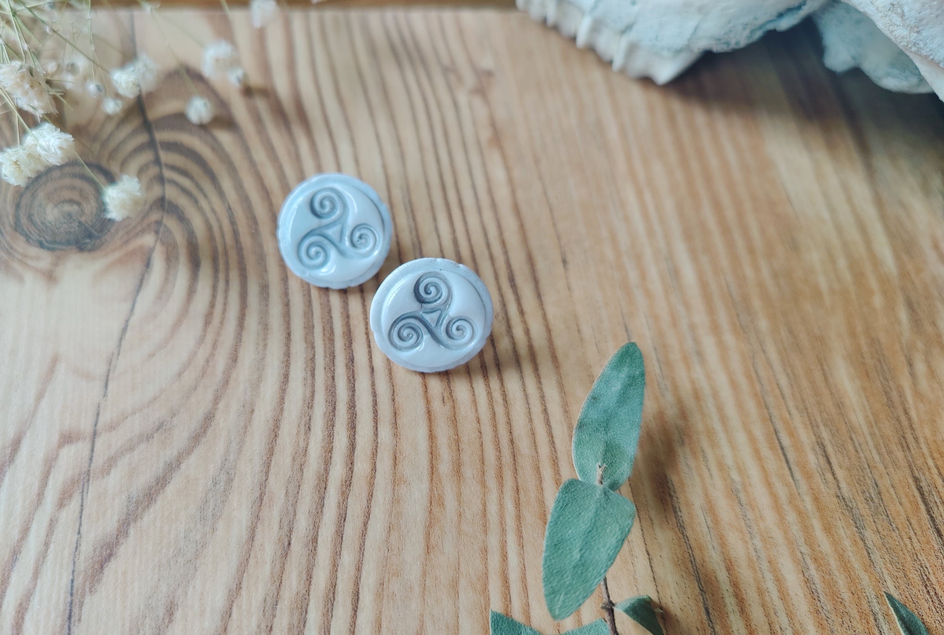Diese eleganten Ohrstecker wurden mit viel Liebe zum Detail aus hochwertigem Polymer-Ton handgefertigt. Das Design zeigt das Triskele-Symbol, ein bedeutungsvolles keltisches Zeichen, das für Balance, Wachstum und die Verbindung von Vergangenheit, Gegenwart und Zukunft steht.