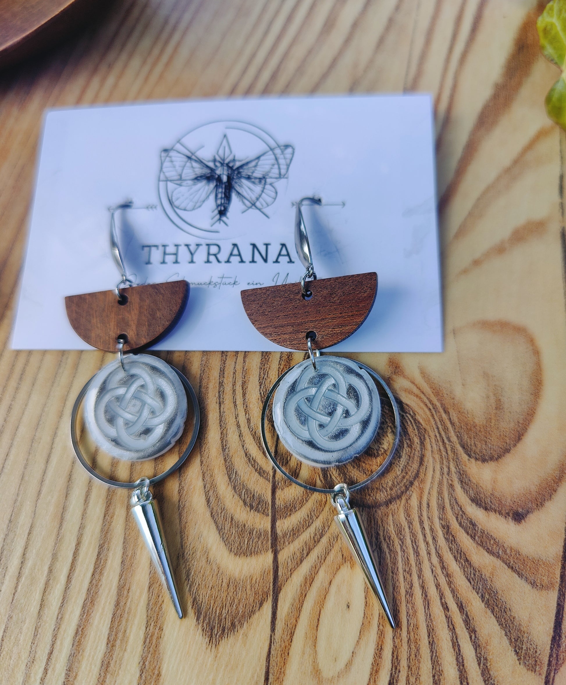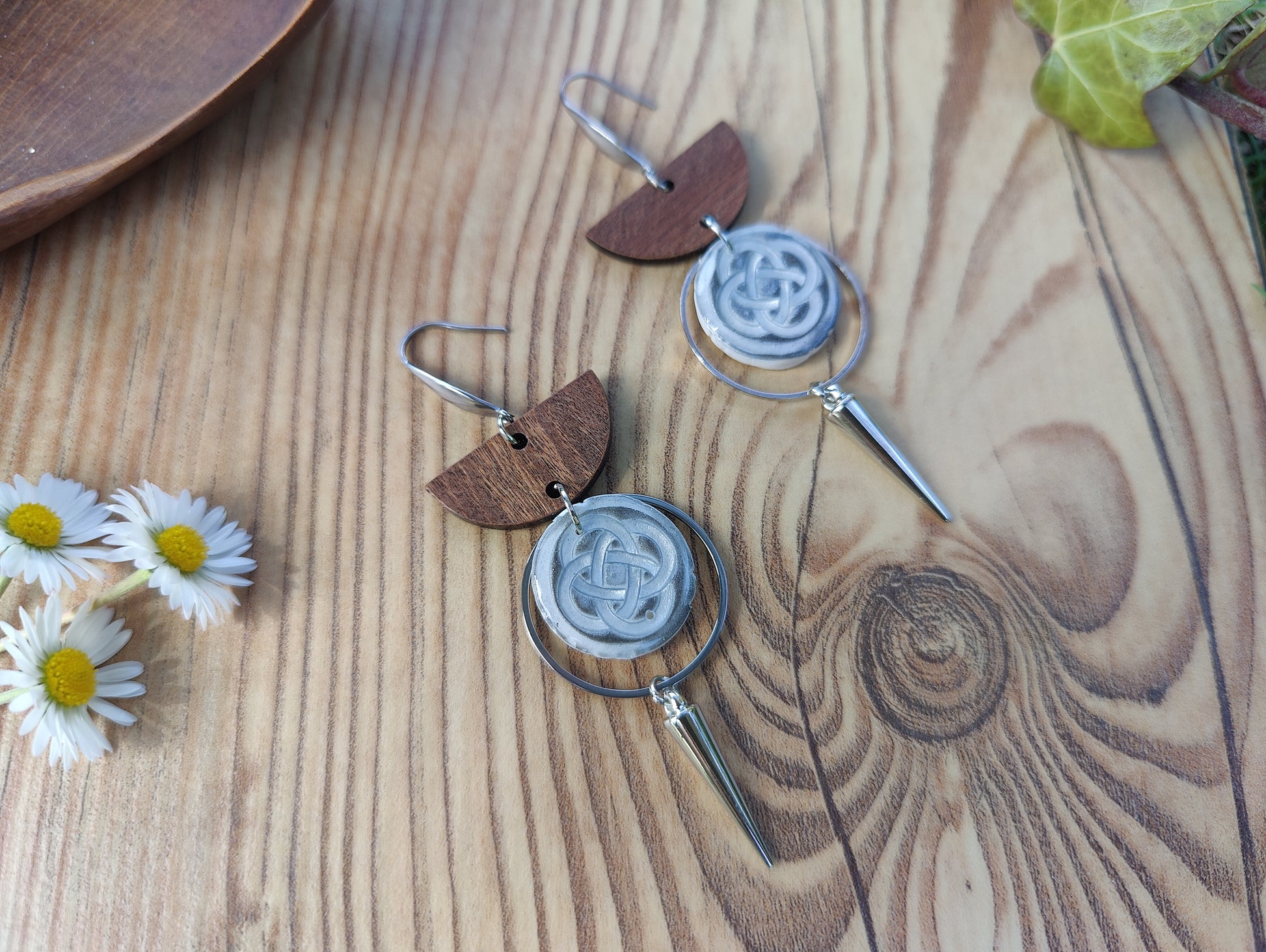 Diese handgefertigten Ohrringe vereinen skandinavische Eleganz mit natürlichen Materialien. Der nordische Knoten, kunstvoll aus Polymer Clay gearbeitet, steht symbolisch für Unendlichkeit und Verbundenheit – ein stilvolles Detail für besondere Momente.