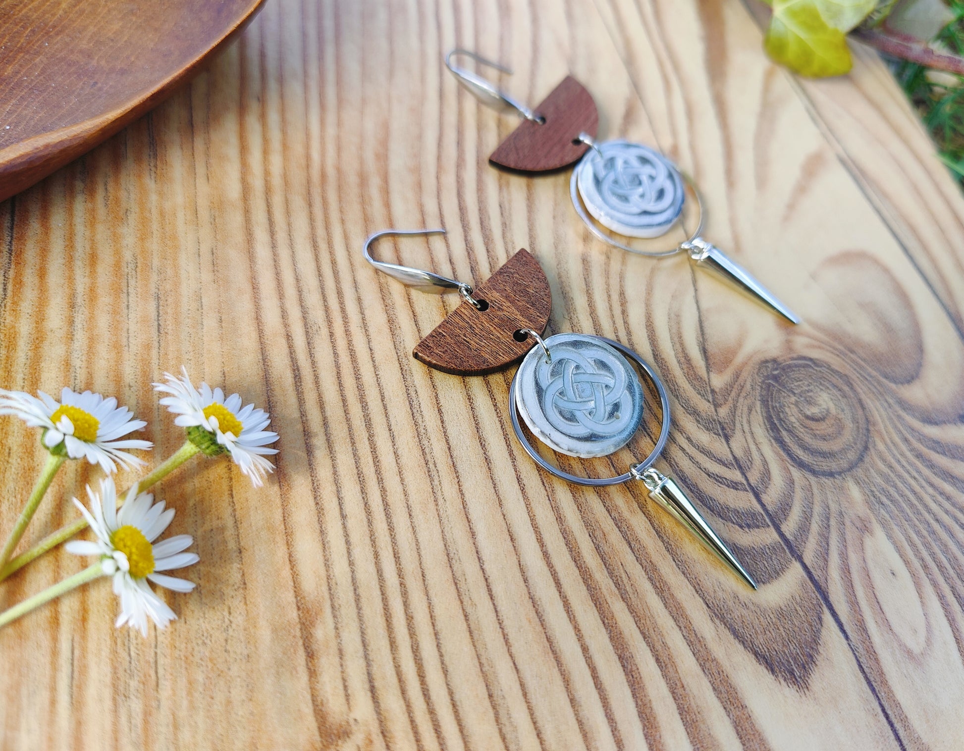 Das Walnuss-Holzelement verleiht dem Design Wärme und eine organische Note, während Edelstahl-Komponenten für Langlebigkeit und Hautfreundlichkeit sorgen. Leicht im Gewicht und dennoch ausdrucksstark, sind diese Ohrringe die perfekte Wahl für alle, die modernes Design mit Bedeutung schätzen.