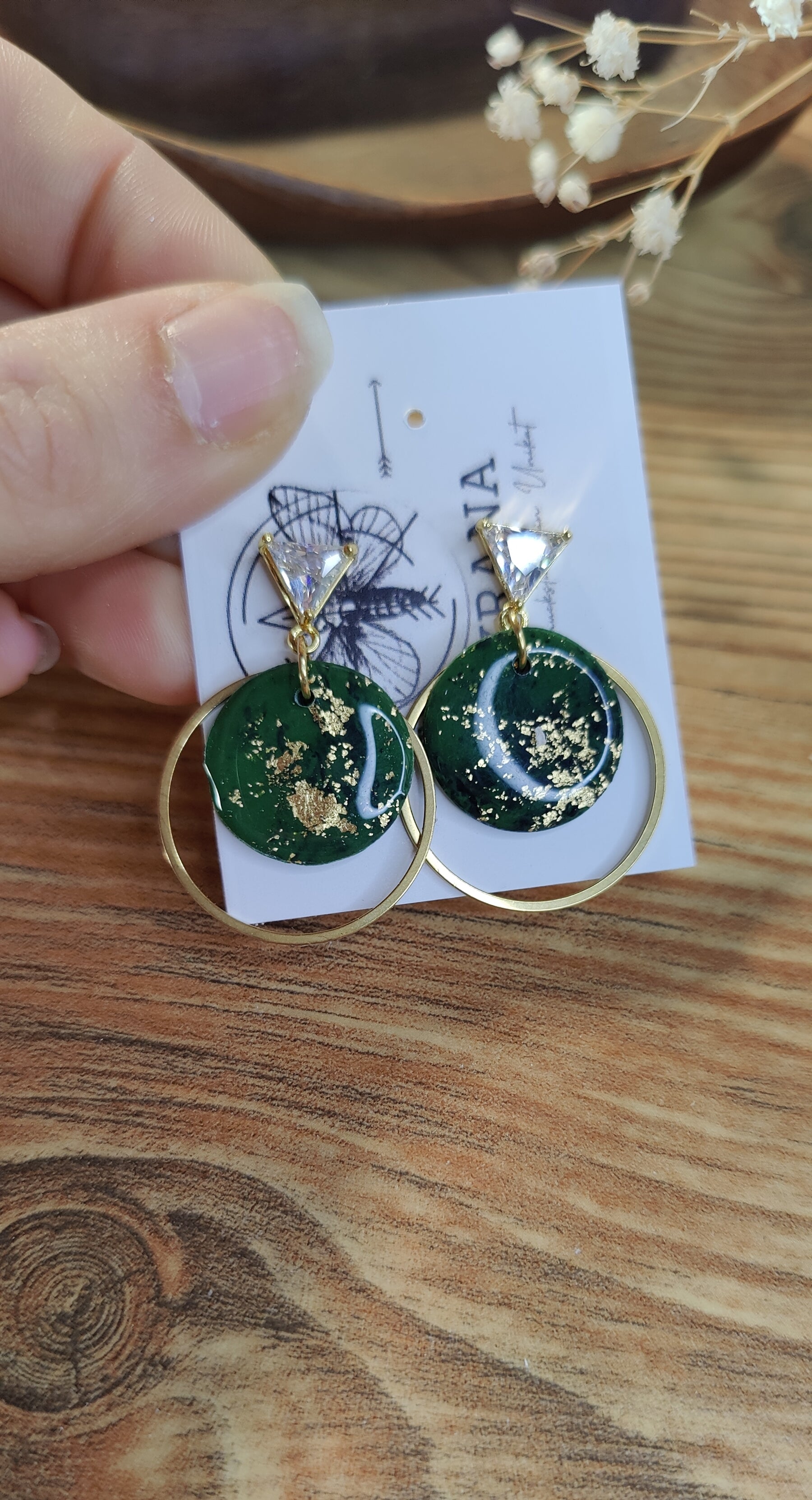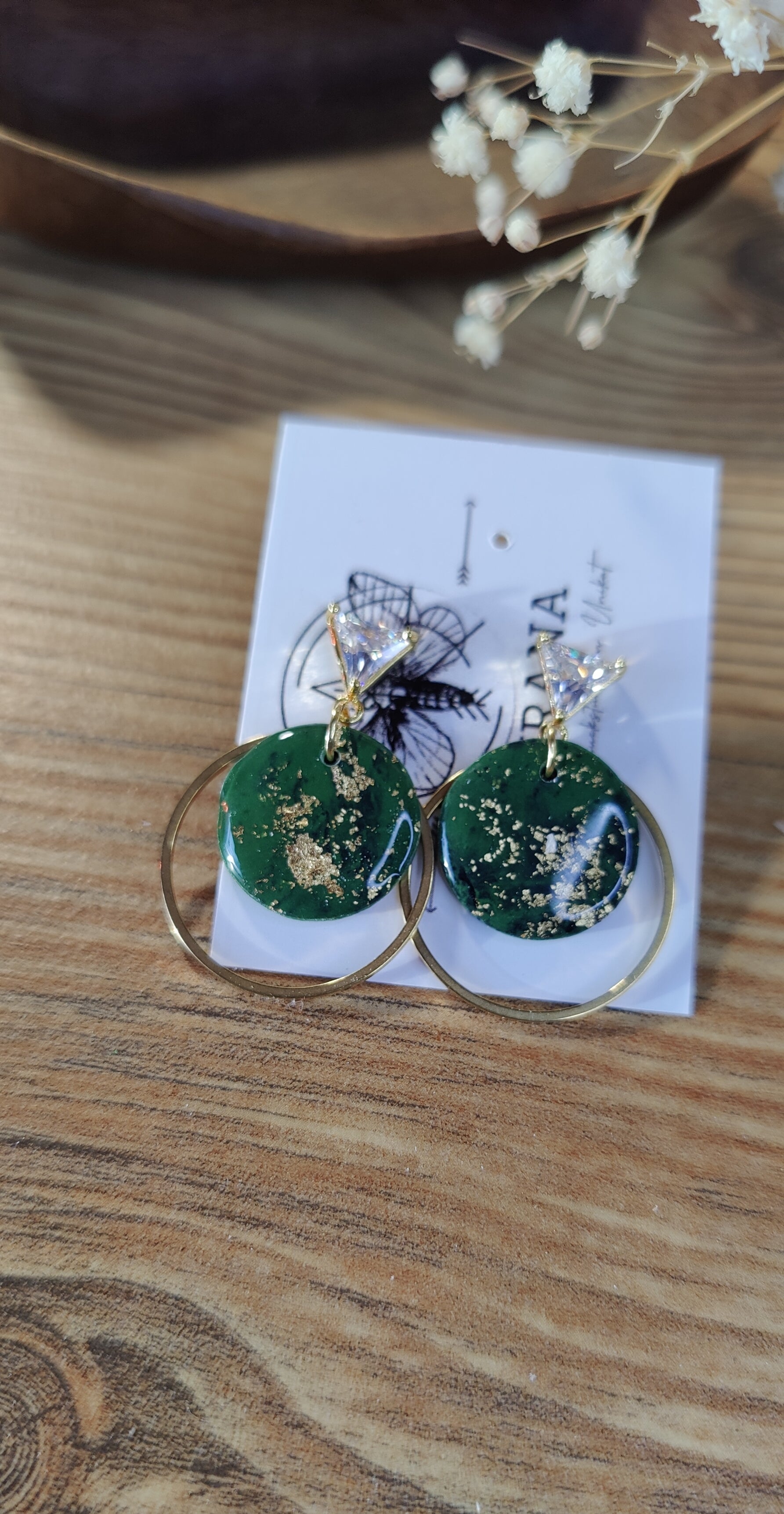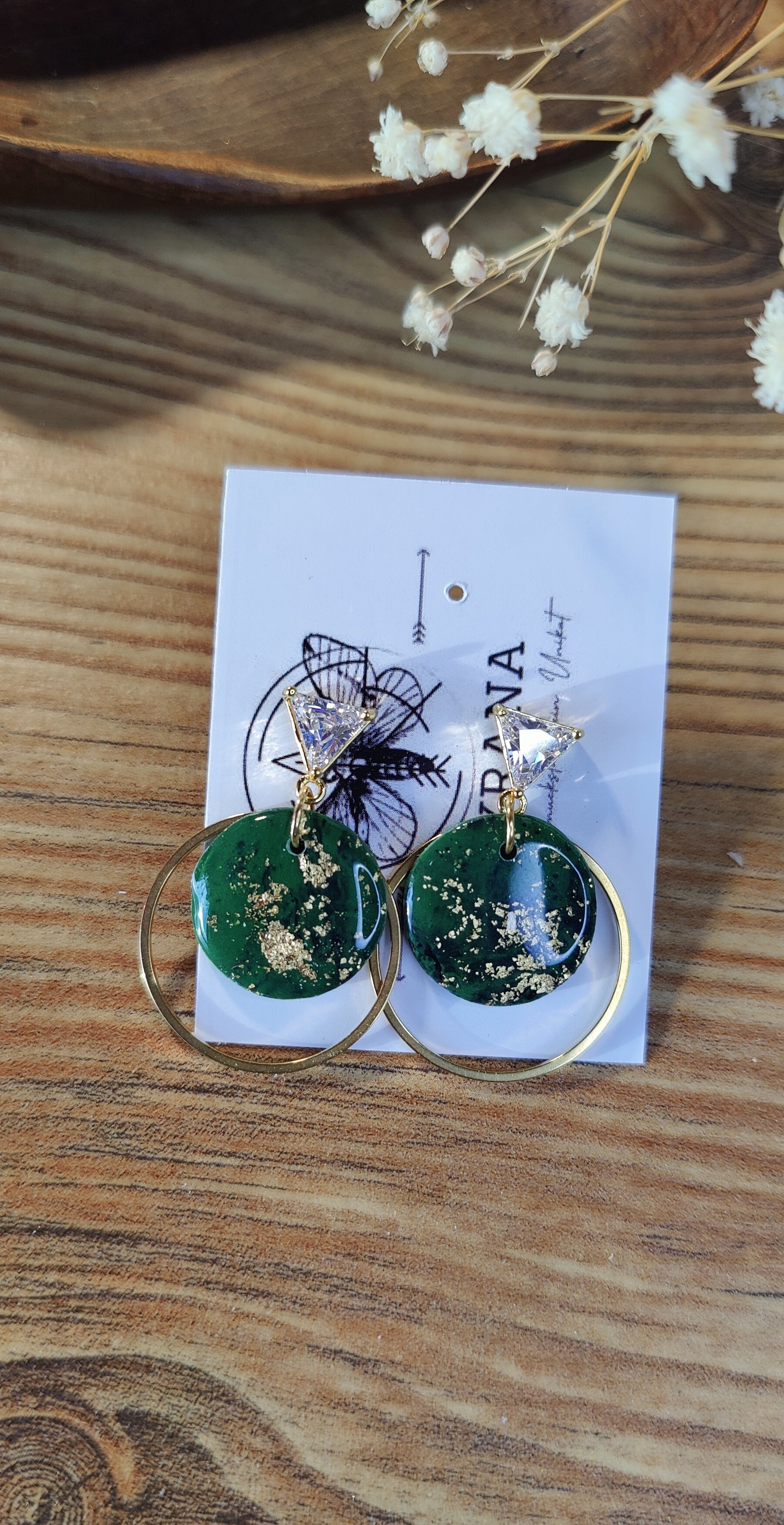 Gefertigt aus hochwertigem grünem Polymer-Ton und veredelt mit feinen goldenen Partikeln, entstehen einzigartige Schmuckstücke mit warmem Schimmer. Die 18k-vergoldeten Messing-Stecker runden das edle Design perfekt ab.