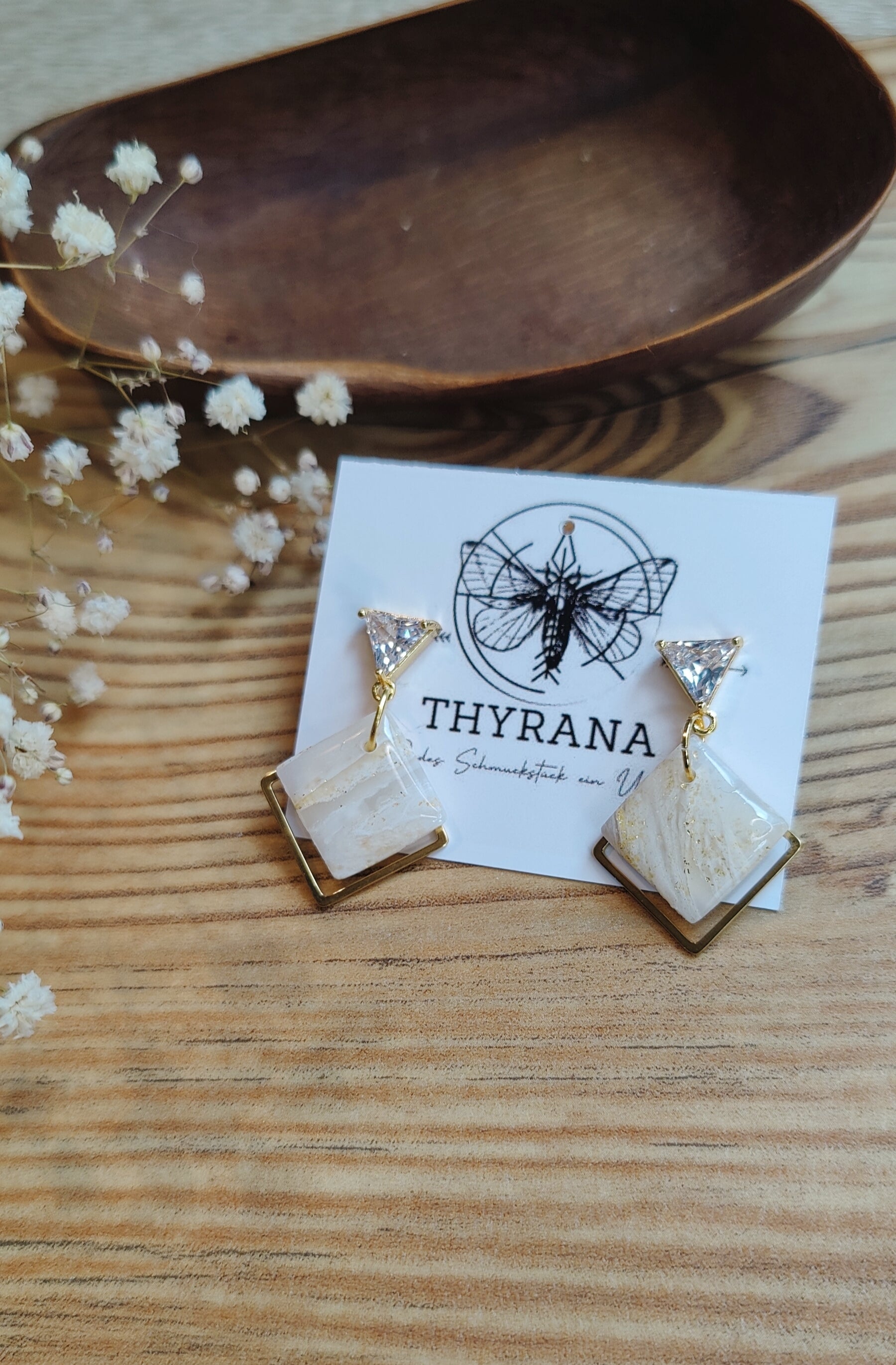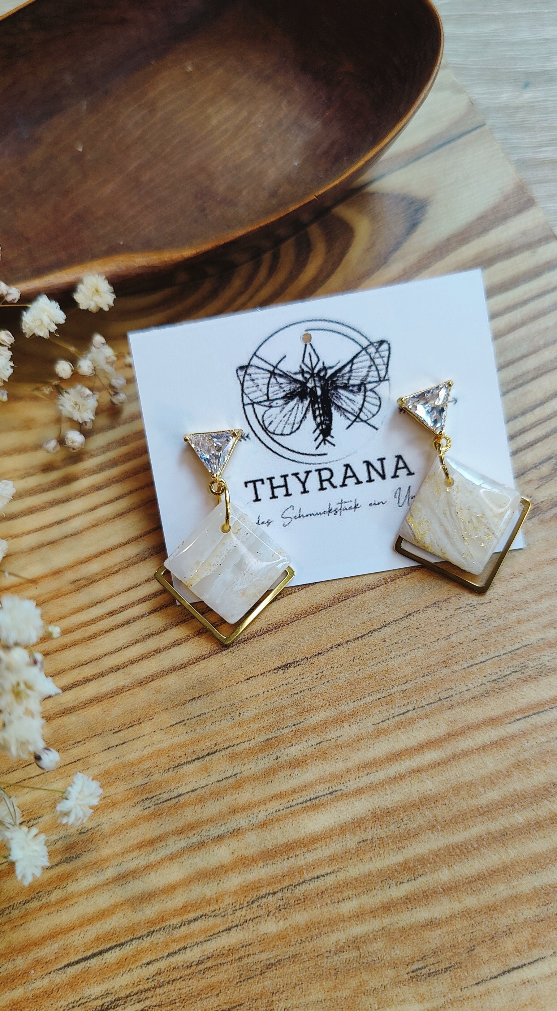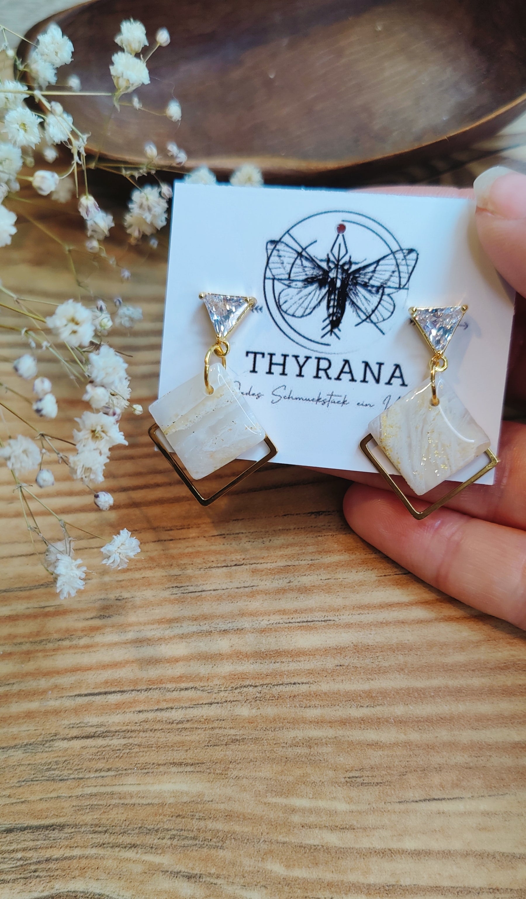 Diese eleganten Ohrstecker vereinen moderne Geometrie mit zartem Glanz: Die dreieckigen Stecker bestehen aus goldfarbenem Edelstahl und sind mit einem funkelnden Zirkonia-Stein veredelt. Daran hängt ein handgefertigter Anhänger aus weißem Polymer-Ton in Viereckform – jedes Stück ein Unikat. Leicht, stilvoll und perfekt für besondere Anlässe oder deinen Alltagslook mit dem gewissen Etwas.