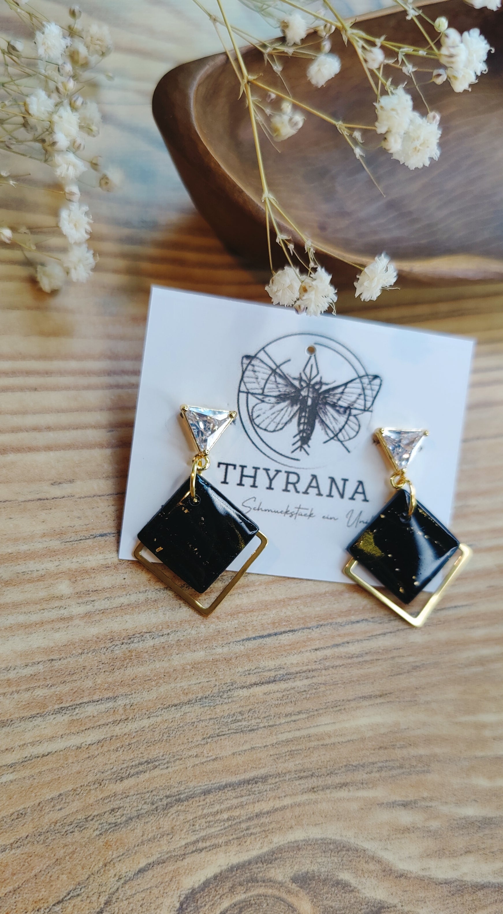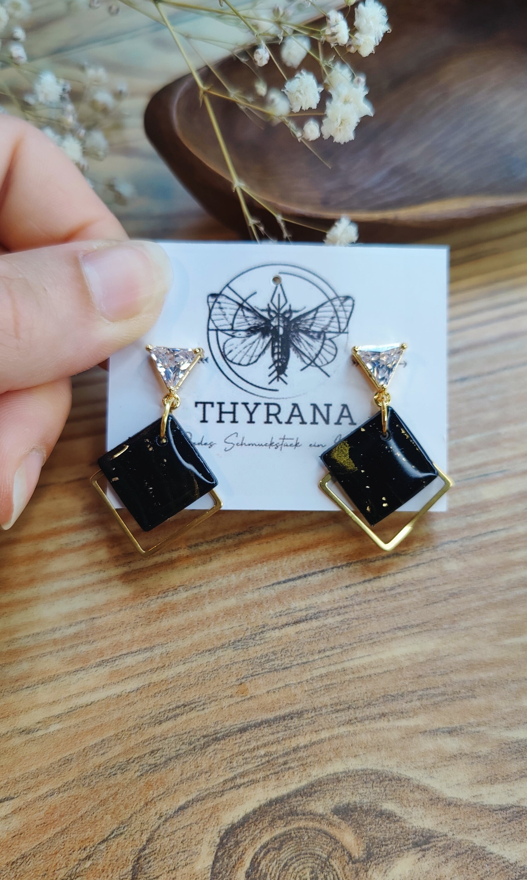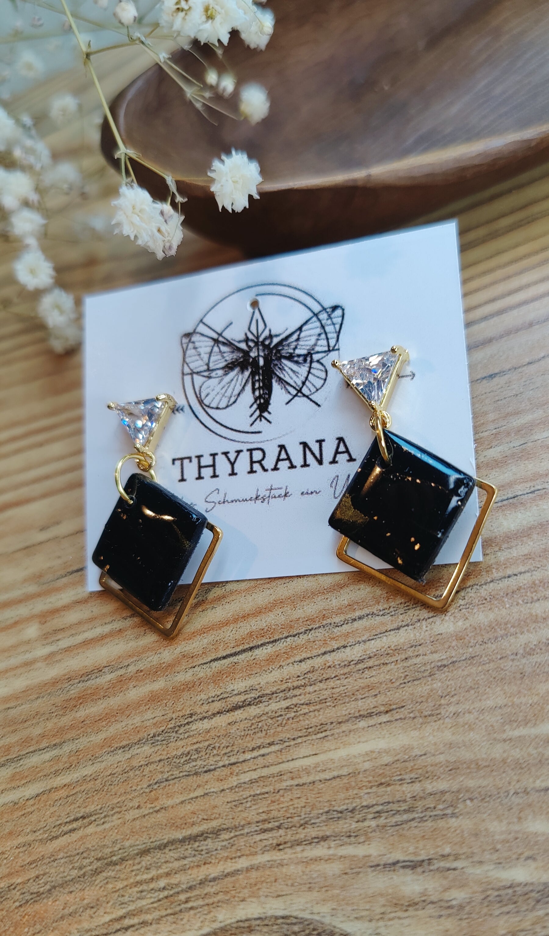 Diese eleganten Ohrstecker vereinen moderne Geometrie mit zartem Glanz: Die dreieckigen Stecker bestehen aus goldfarbenem Edelstahl und sind mit einem funkelnden Zirkonia-Stein veredelt. Daran hängt ein handgefertigter Anhänger aus weißem Polymer-Ton in Viereckform – jedes Stück ein Unikat. Leicht, stilvoll und perfekt für besondere Anlässe oder deinen Alltagslook mit dem gewissen Etwas.