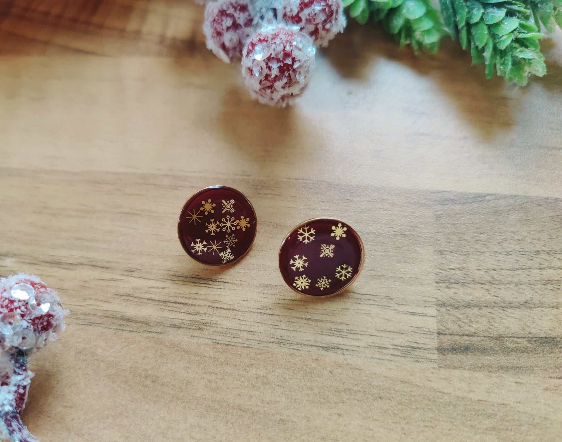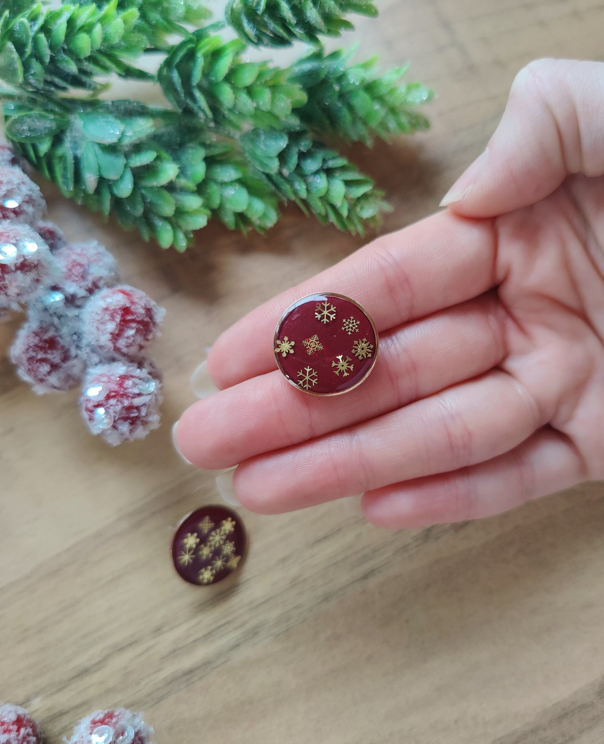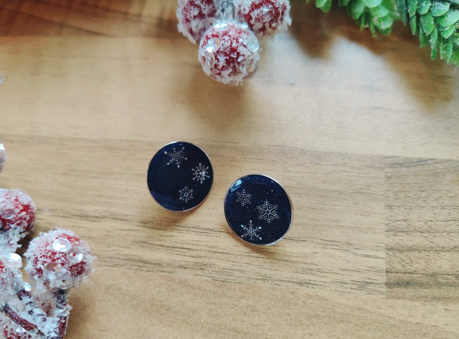 Setze ein Statement mit diesen einzigartigen, handgefertigten Ohrsteckern! Die runden Ohrringe bestehen aus hochwertigem dunkelblauem oder rotem Polymer Clay, das an den klaren Nachthimmel im Winter erinnert. Im Inneren schimmern filigrane Schneeflocken, die in glänzendem Gießharz eingefasst ist und für einen faszinierenden 3D-Effekt sorgt.
