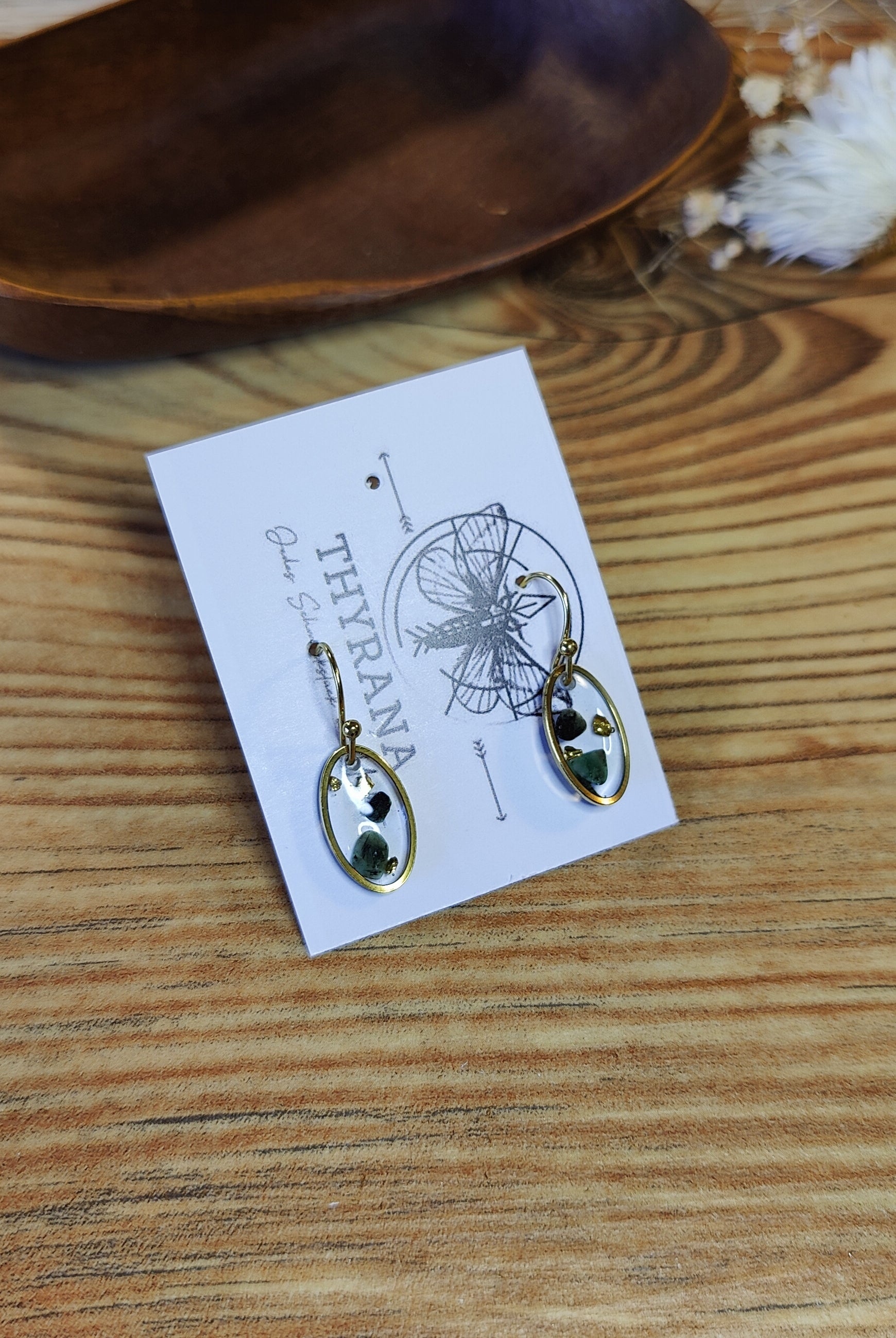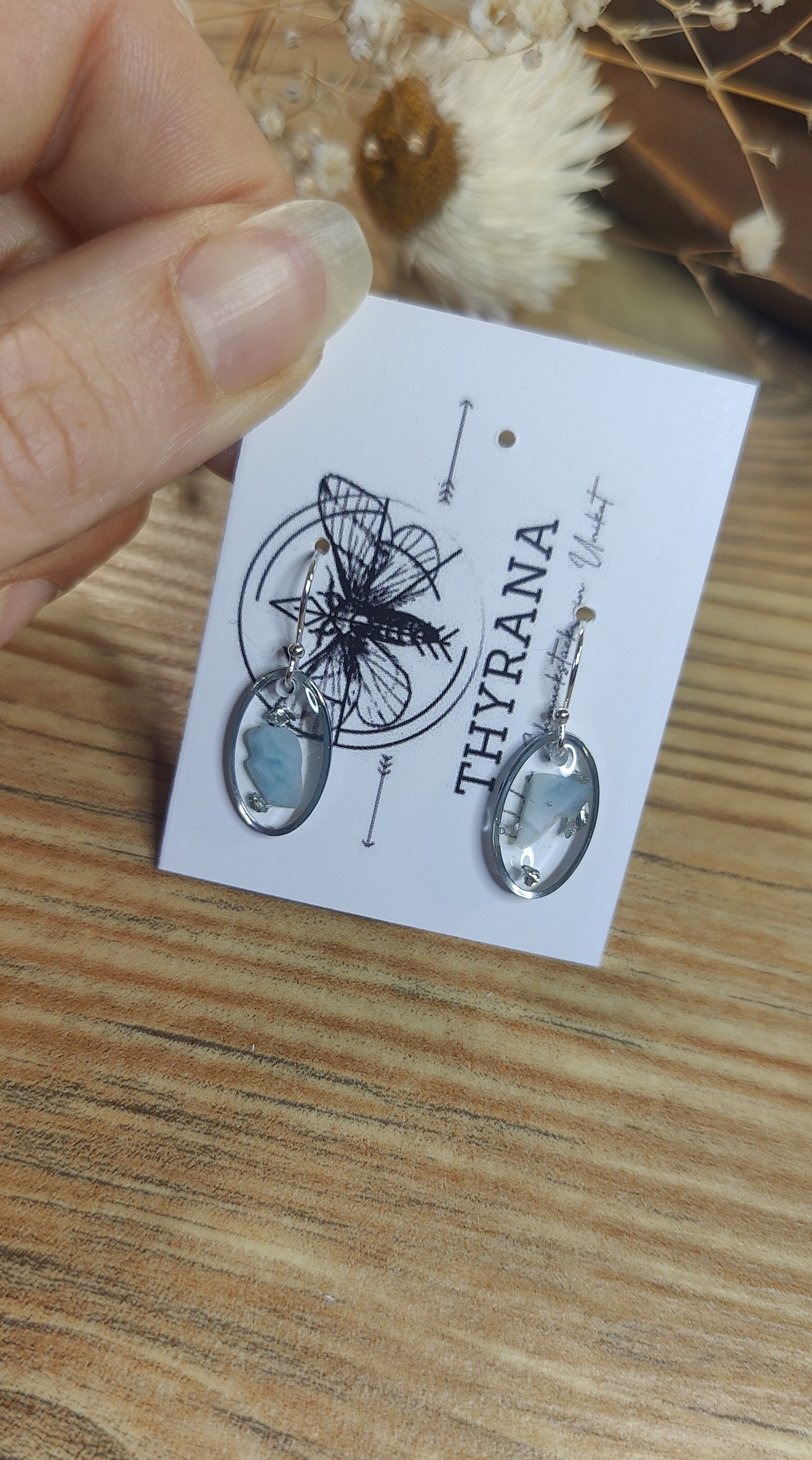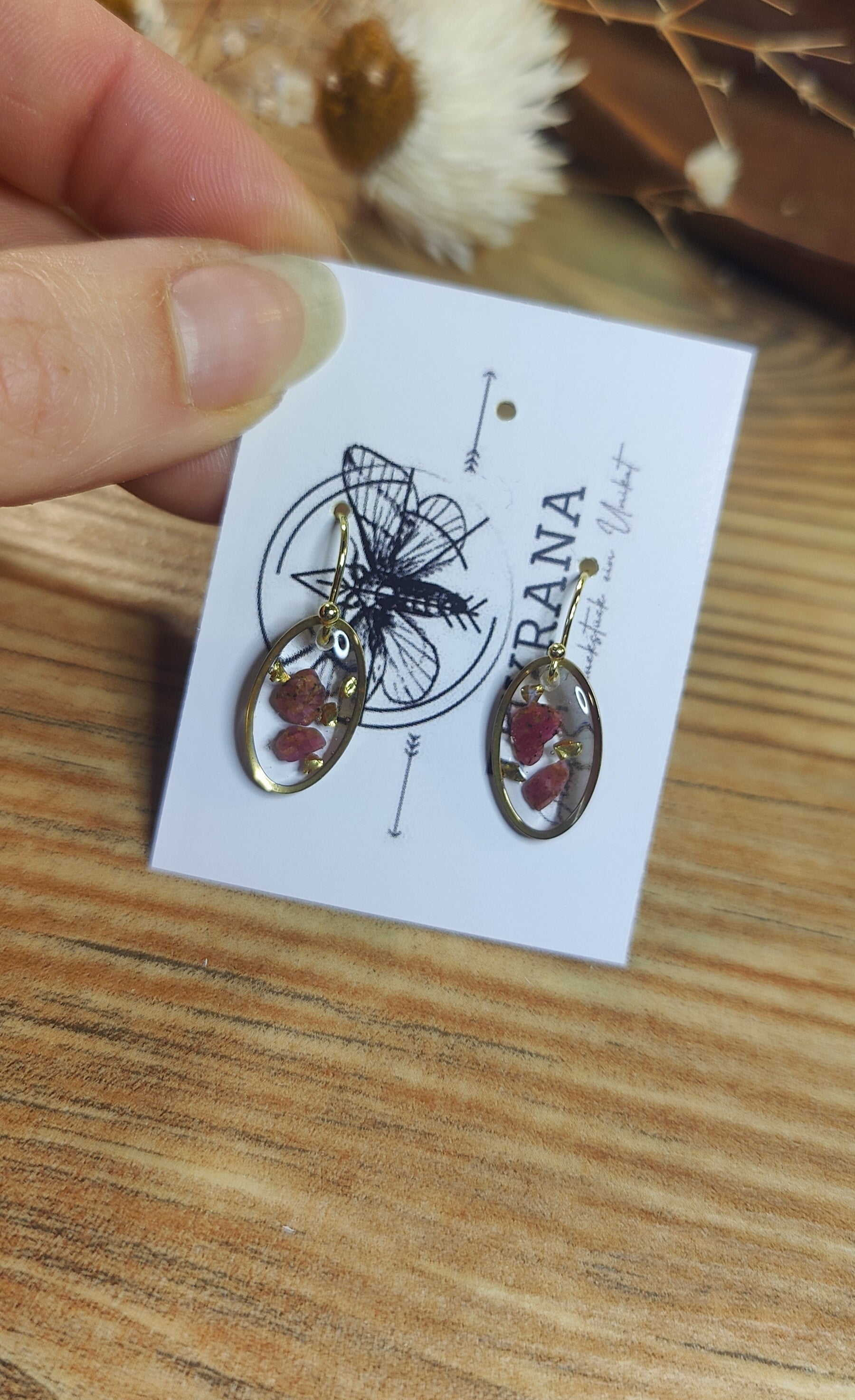 Die hochwertigen 925-Silber-Ohrhaken – chirurgischer Edelstahl– bieten optimalen Tragekomfort, selbst für empfindliche Ohren. Der moderne ovale Edelstahlrahmen umschließt ein kunstvoll gearbeitetes Harz-Inlay, in das sorgfältig ausgewählte Edelsteine eingegossen sind.