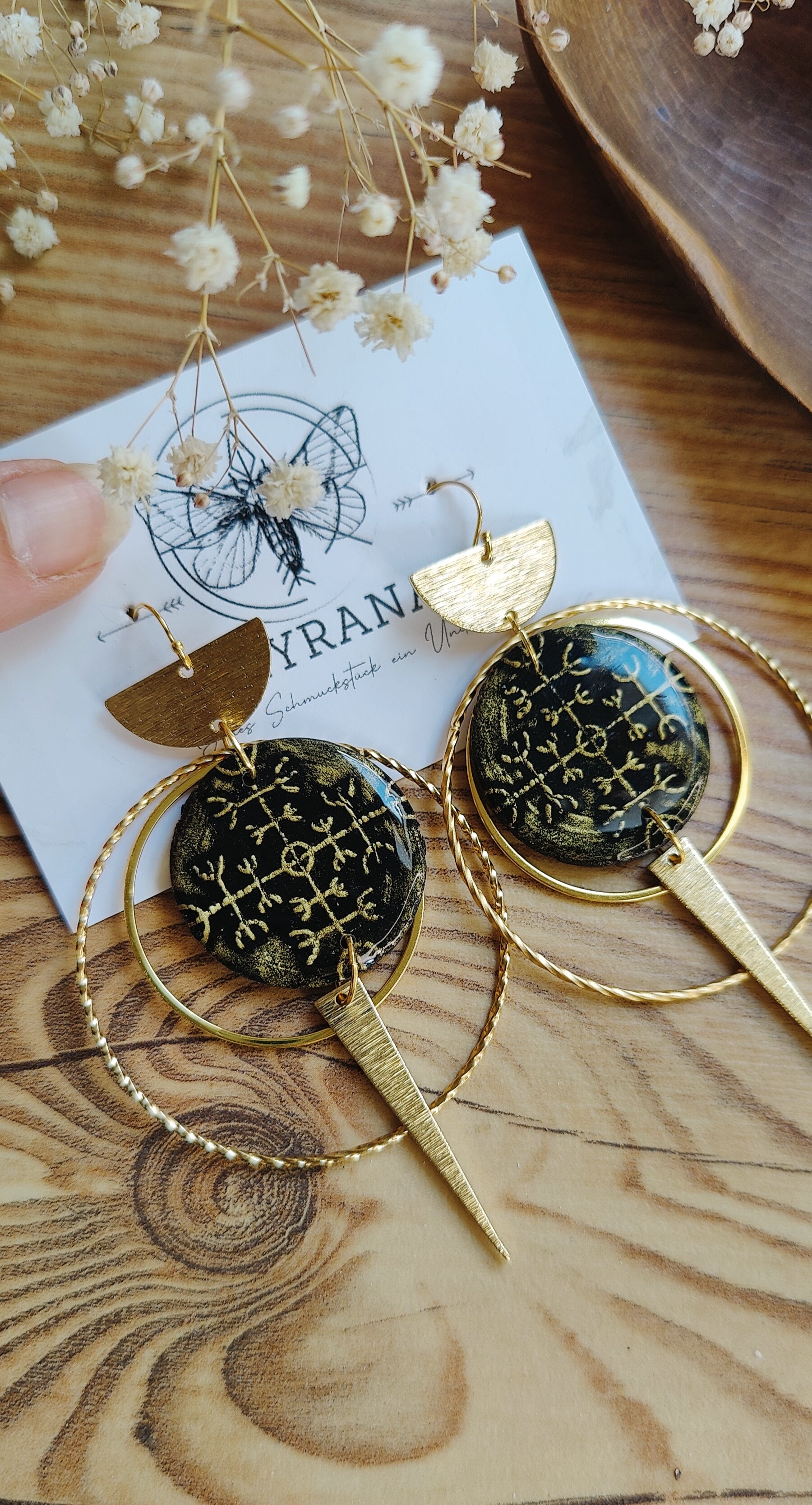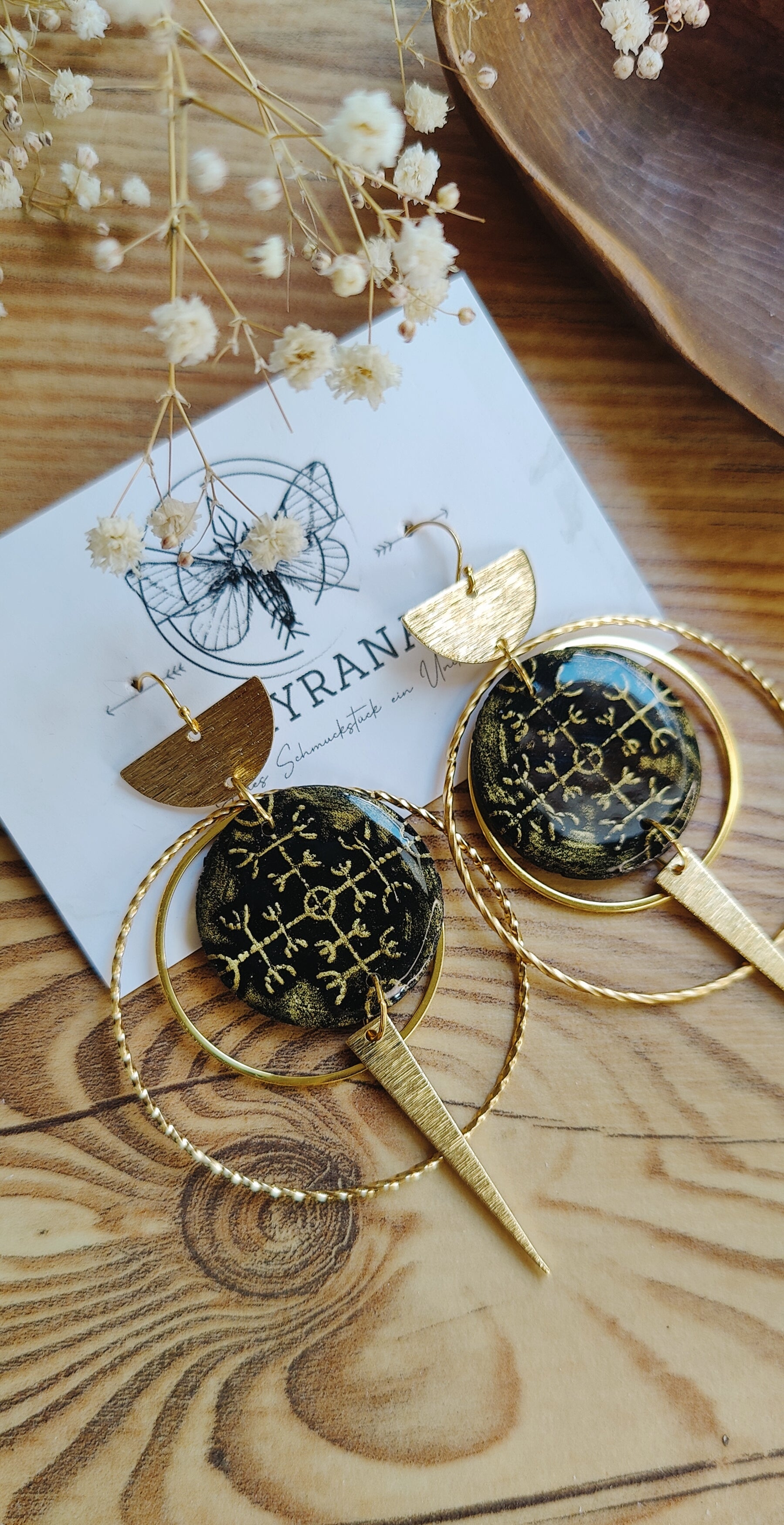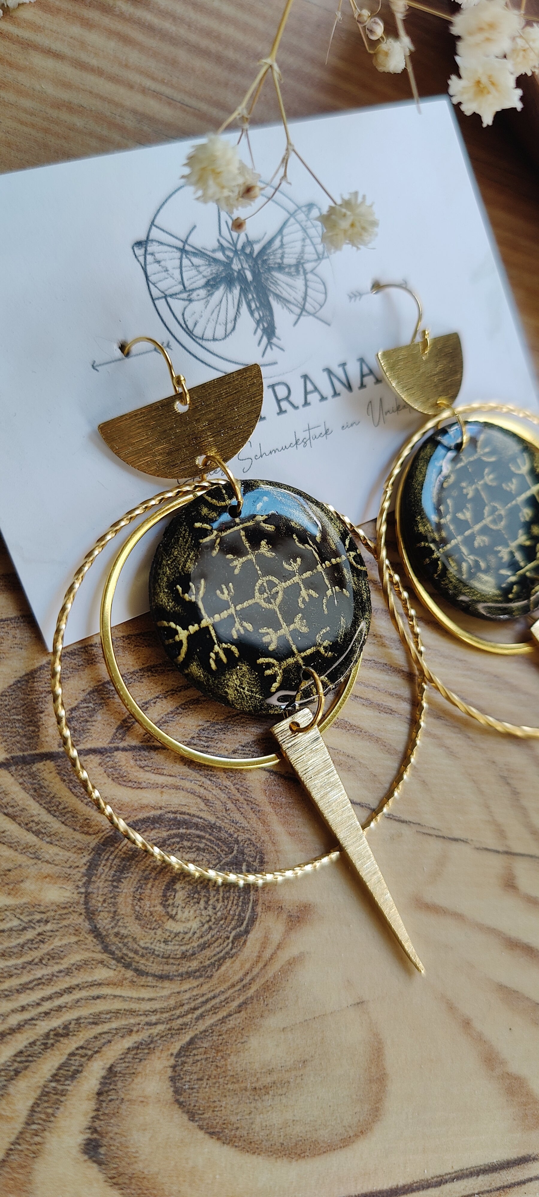 Diese einzigartigen Ohrringe verbinden edle Materialien mit moderner Geometrie und einem Hauch nordischer Mystik. Jeder Ohrhänger wird in liebevoller Handarbeit gefertigt und ist ein echtes Unikat.