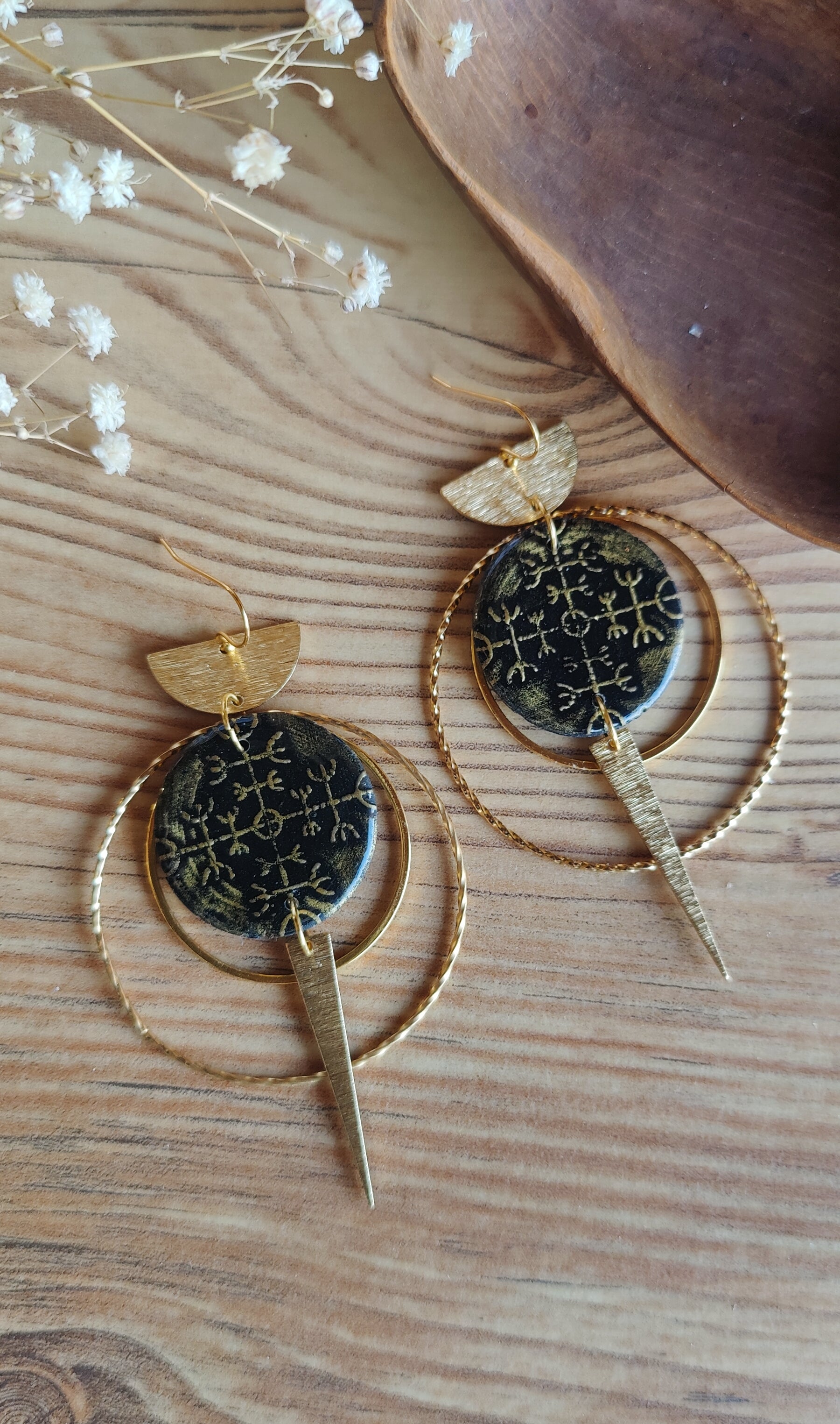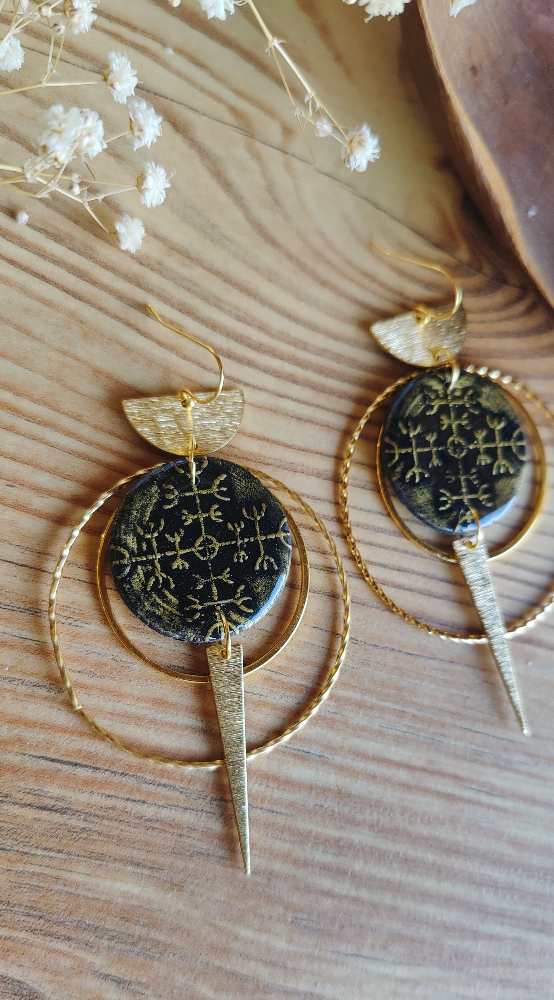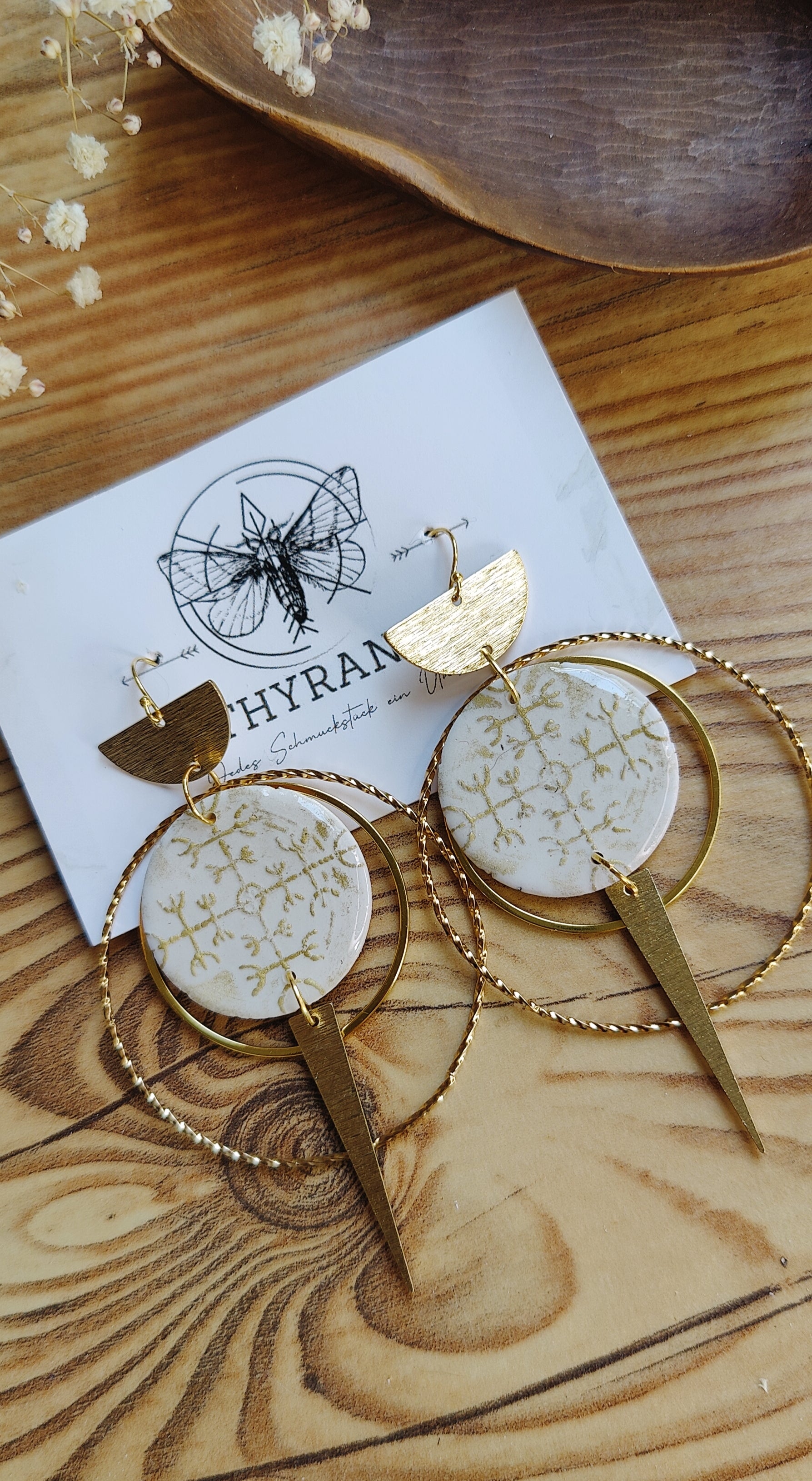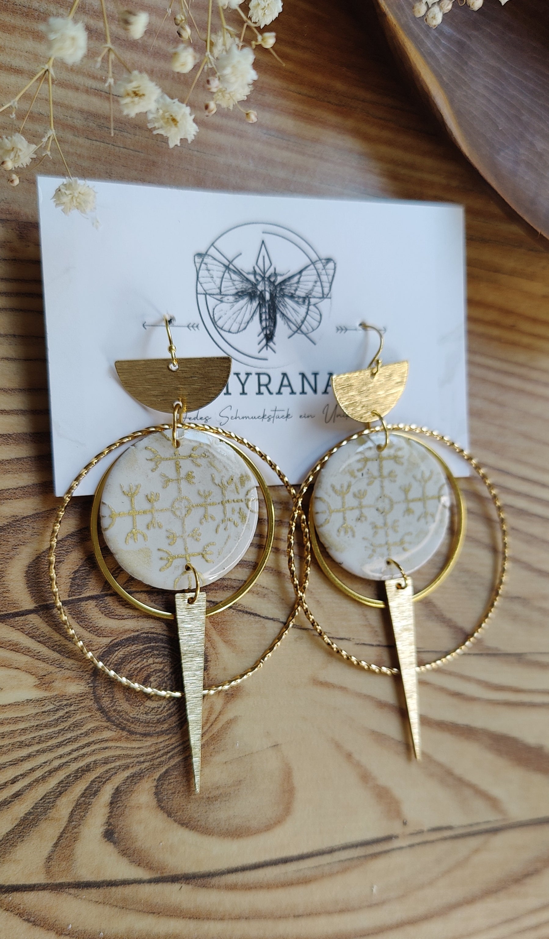 Diese einzigartigen Ohrringe verbinden edle Materialien mit moderner Geometrie und einem Hauch nordischer Mystik. Jeder Ohrhänger wird in liebevoller Handarbeit gefertigt und ist ein echtes Unikat.