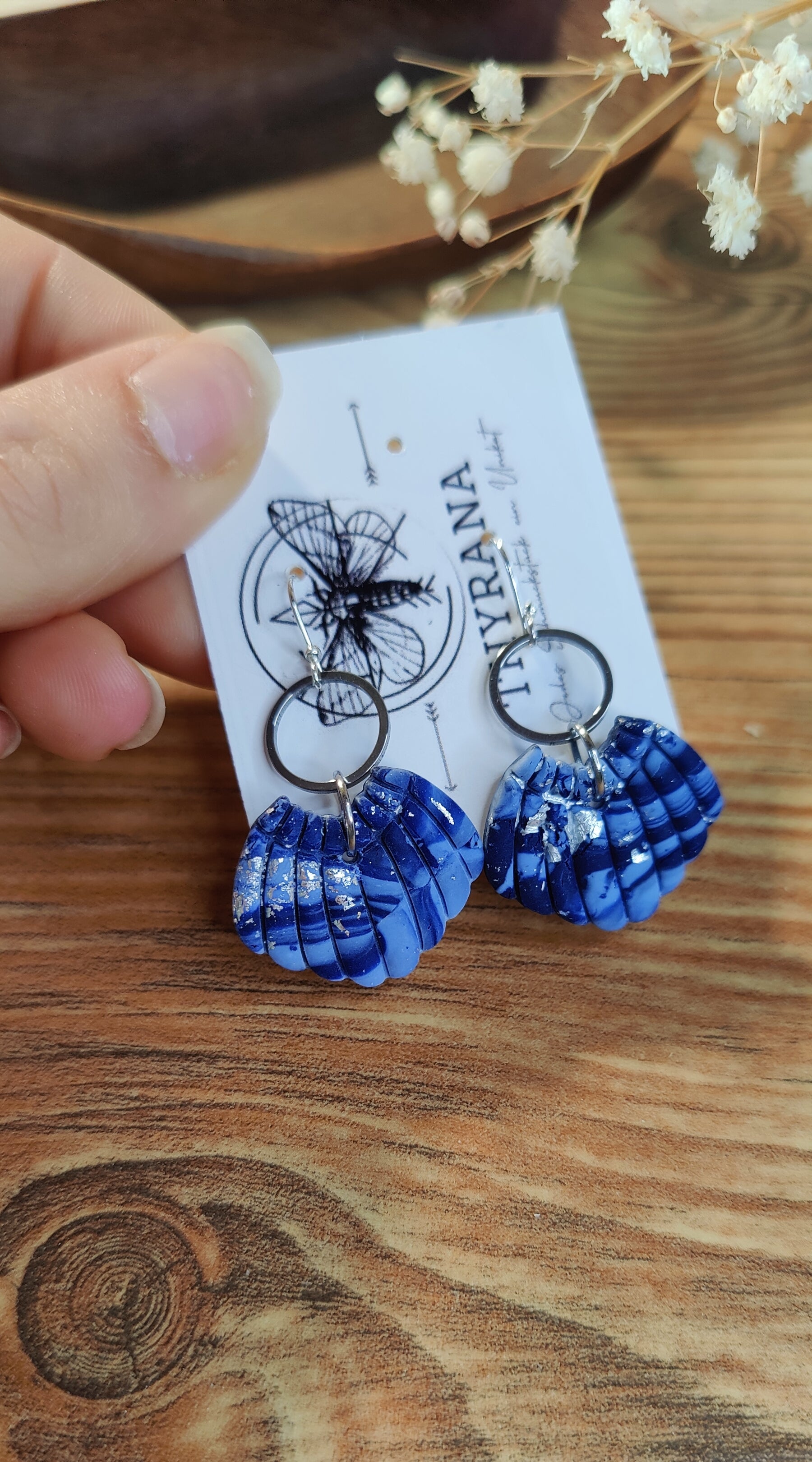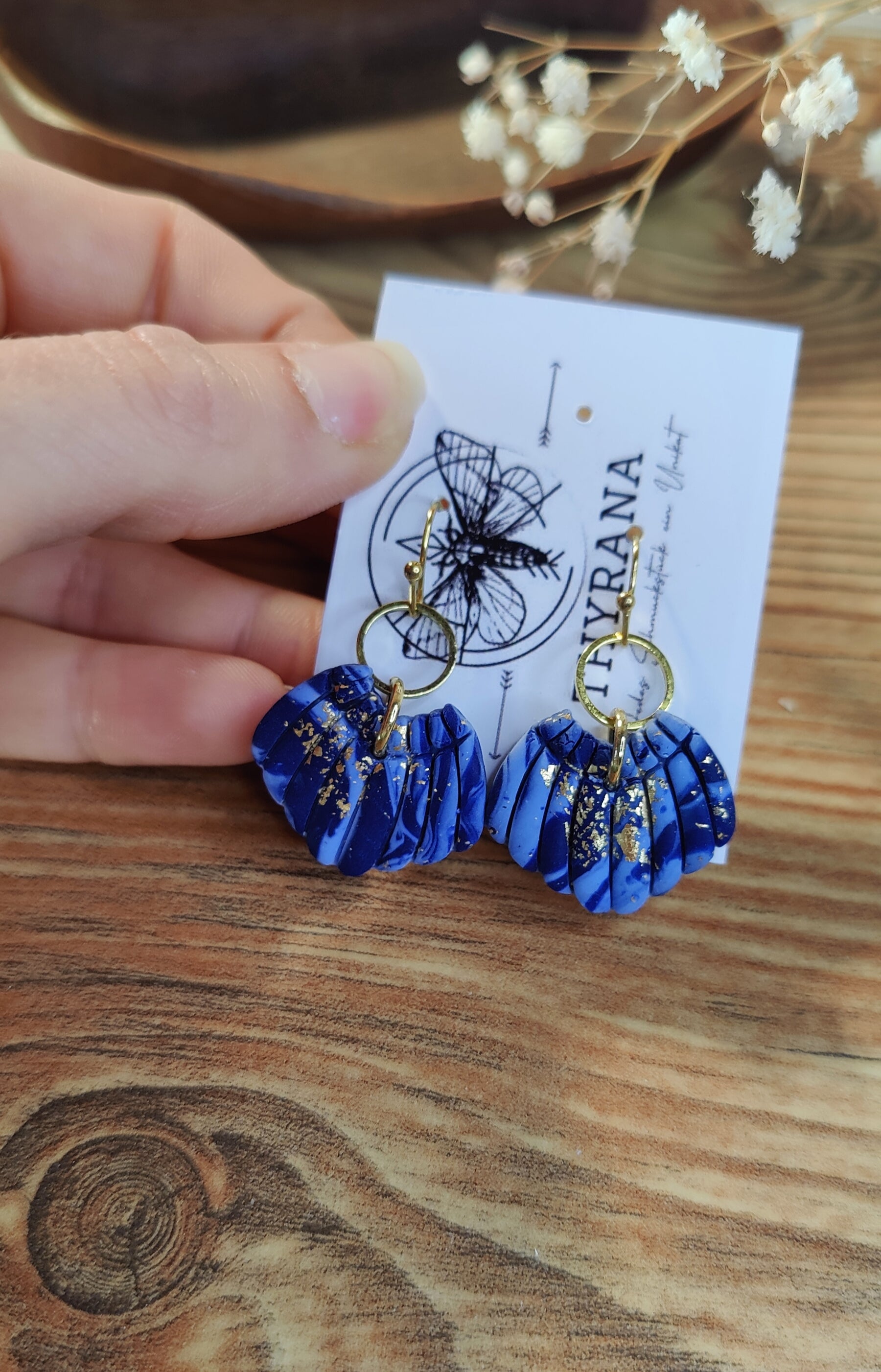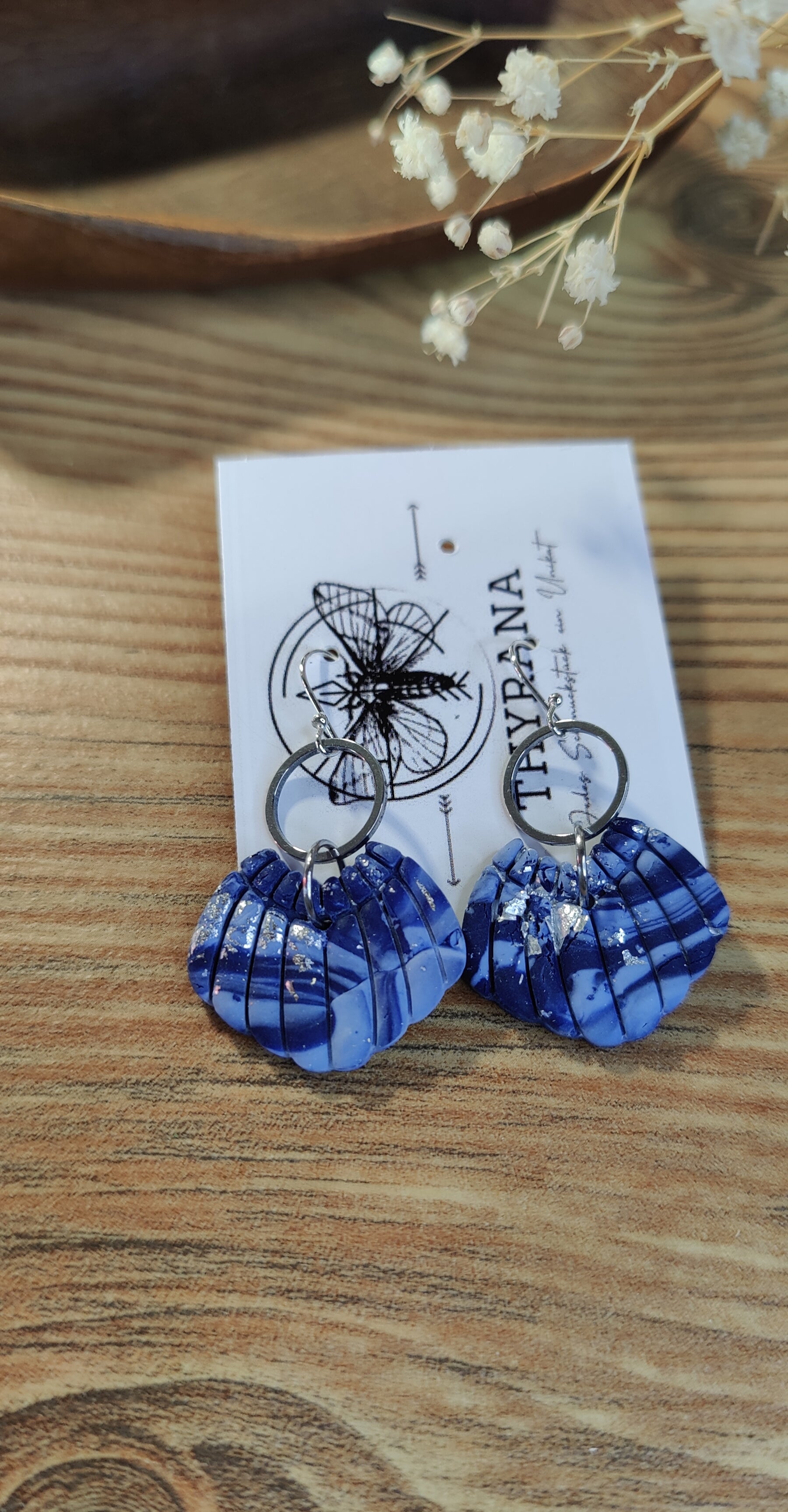 Gefertigt aus mattem blauen Polymer Clay und veredelt mit feinen gold- oder silberfarbenen Partikeln, entsteht ein dezentes, edles Funkeln. Der stabile Ring aus Edelstahl wird ergänzt durch Ohrhaken aus wahlweise 925er Silber oder 316er chirurgischem Edelstahl mit 18k Vergoldung – für hohen Tragekomfort und langlebige Qualität.