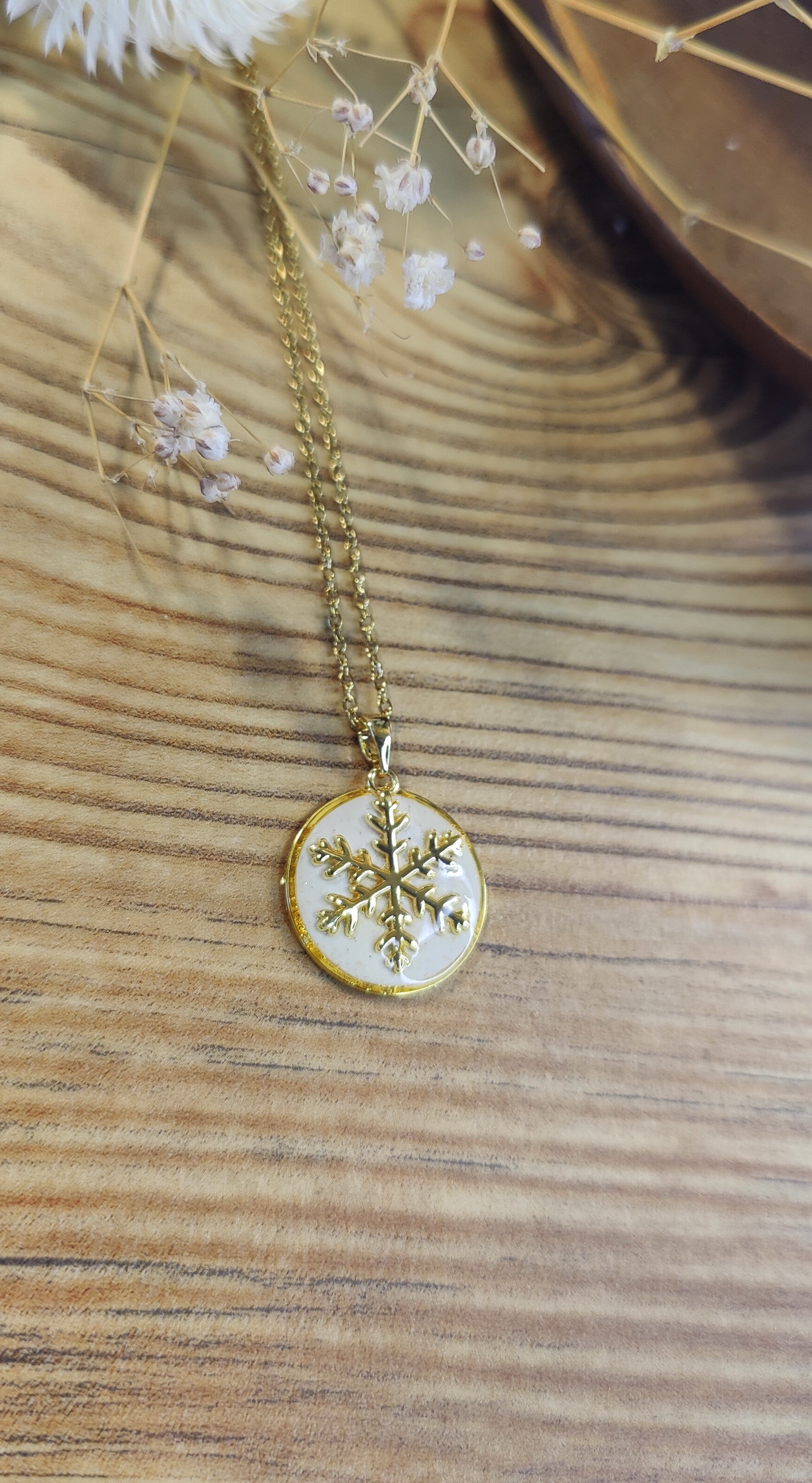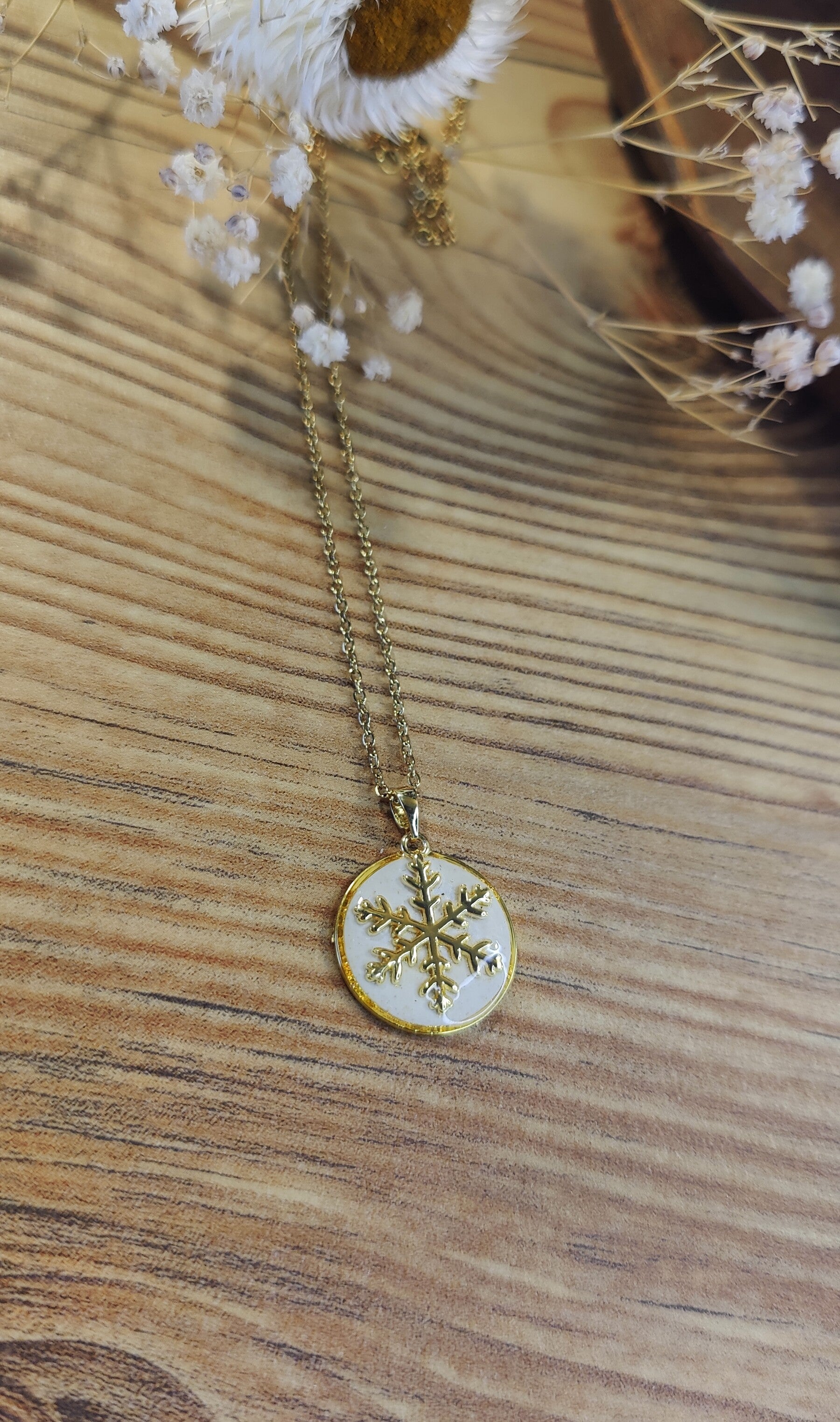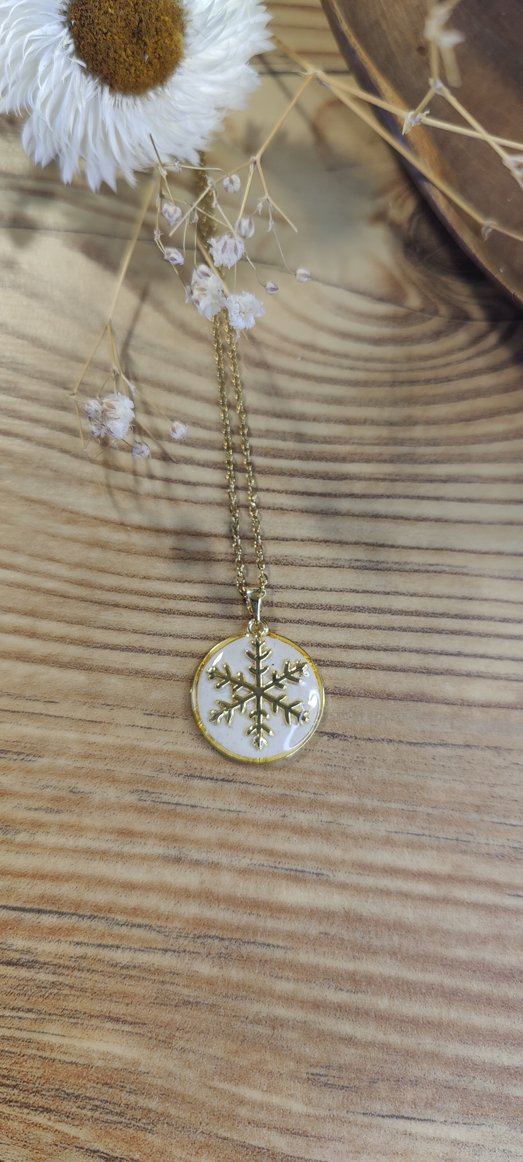 Diese handgefertigte Kette vereint modernes Design mit zarter Handarbeit. Der Anhänger aus Polymer Ton wird liebevoll von Hand geformt und mit filigranen Schneeflocken-Elementen aus Edelstahl verziert – jedes Stück ist ein Unikat.