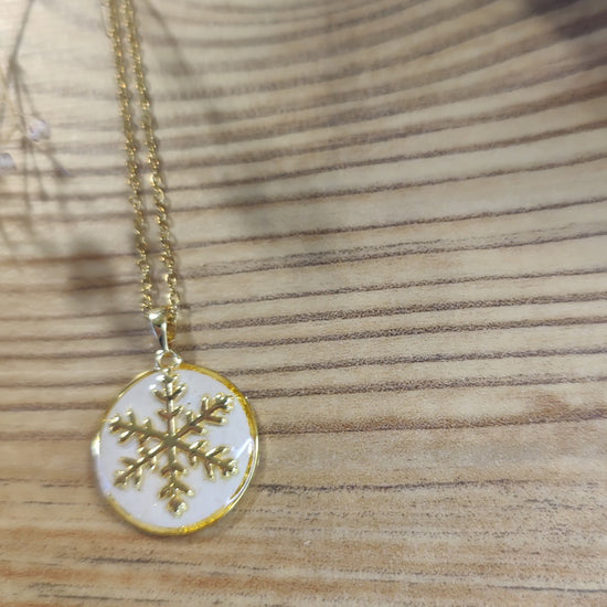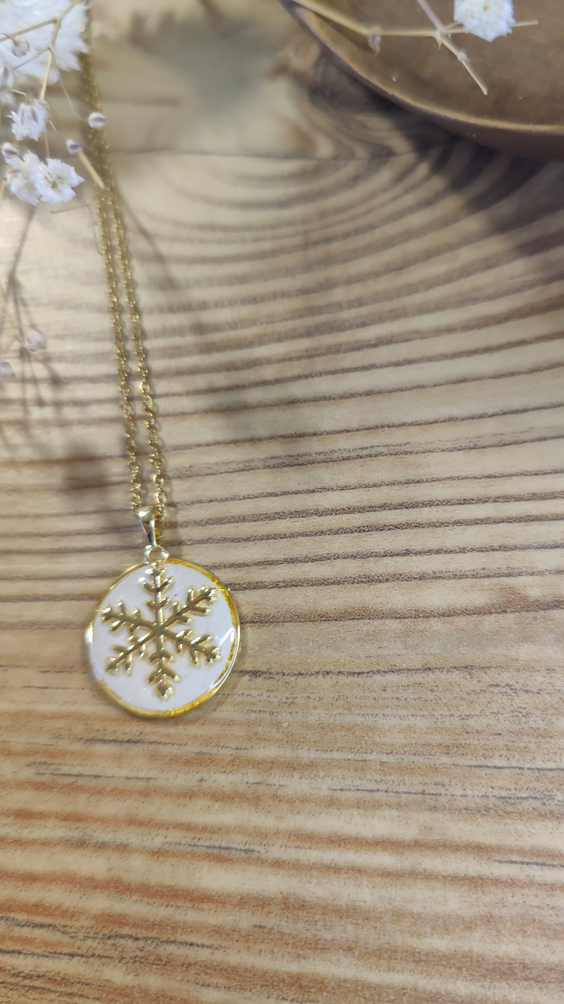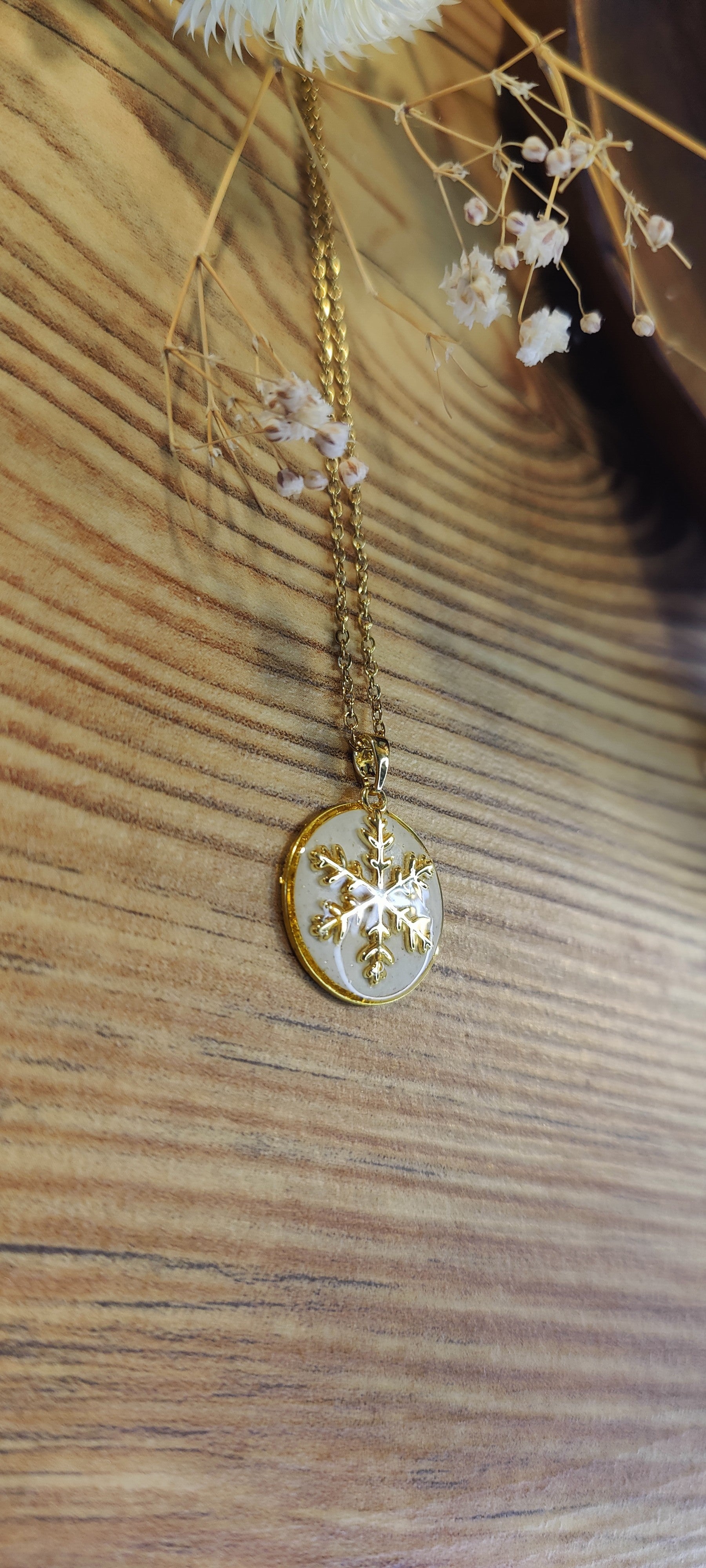 Diese handgefertigte Kette vereint modernes Design mit zarter Handarbeit. Der Anhänger aus Polymer Ton wird liebevoll von Hand geformt und mit filigranen Schneeflocken-Elementen aus Edelstahl verziert – jedes Stück ist ein Unikat.